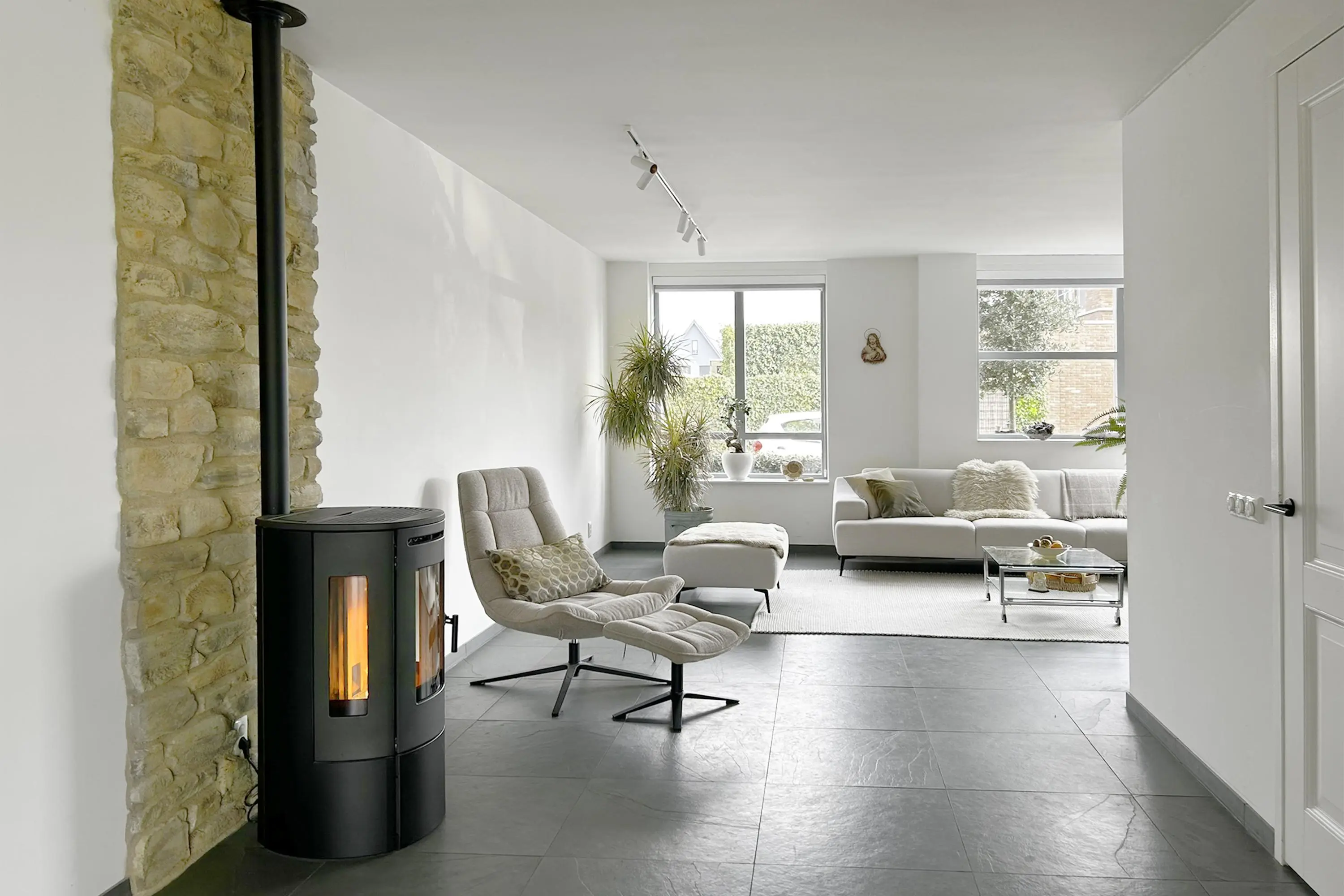 De ruime woonkamer valt direct op door de grote raampartijen en de prettige lichtinval. Vloerverwarming en een sfeervolle pelletkachel zorgen voor comfort in elk seizoen. De strakke afwerking en het doordachte lichtplan maken dit een plek waar je moeiteloos schakelt tussen ontspannen en gezellig samen zijn.