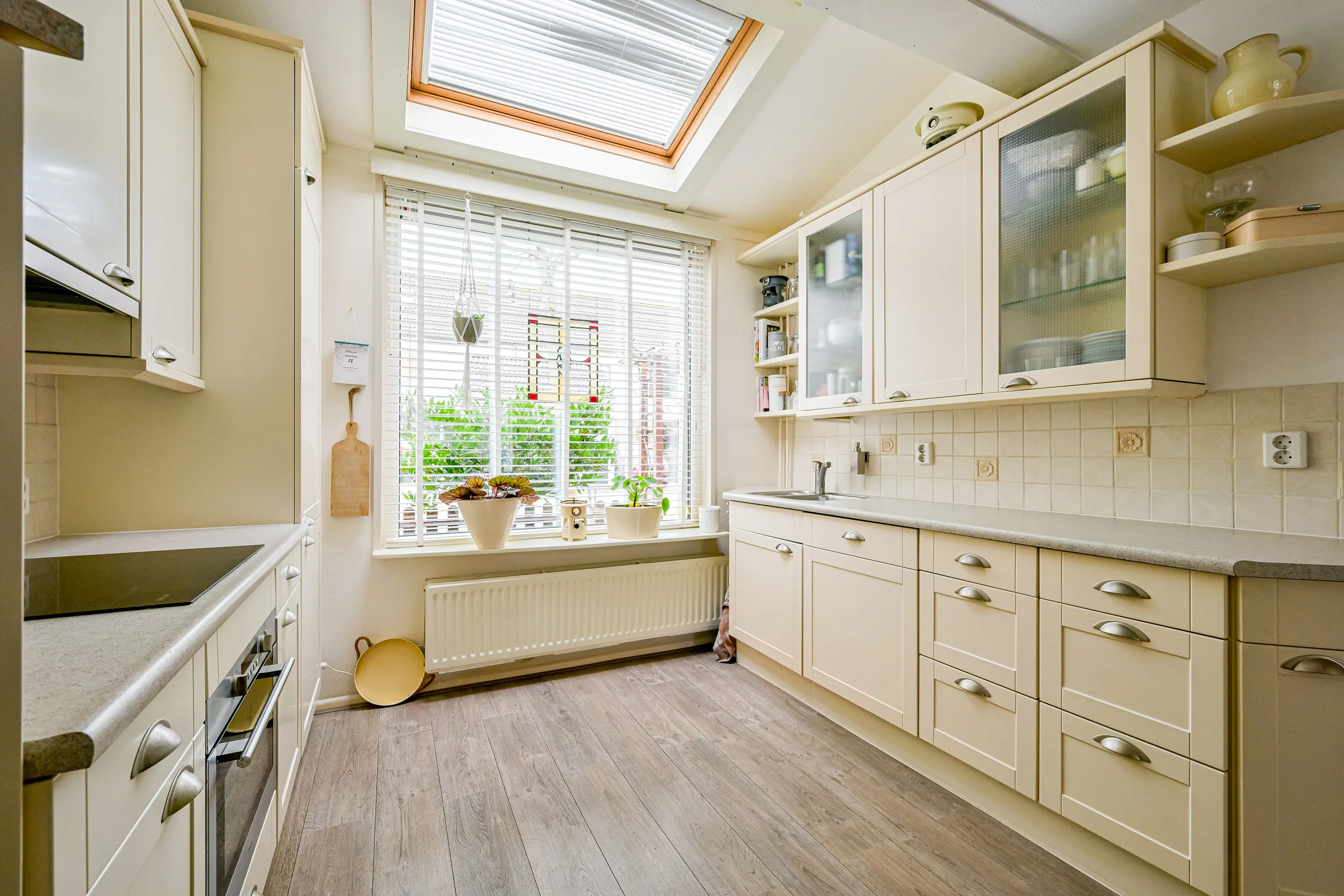 Begane grond: De entree/hal geeft toegang tot de trap naar boven, meterkast, toilet en de deur naar de woonkamer. De woonkamer is aan de voor-en achterzijde uitgebouwd en daardoor zeer ruim. Vanuit de woonkamer heeft u zicht op de fraai aangelegde achtertuin. Via de deur aan de achterzijde kunt u de tuin betreden. Omdat er geen directe achterburen zijn bieden de tuin en woonkamer u veel privacy. De ruime open keuken is aan de voorzijde van de woning gelegen en van alle gemakken voorzien. Denk hierbij aan een koel-vriescombinatie, vaatwasser, inductiekookplaat en een combioven. Verder is er voldoende kastruimte om al uw keukengerei op te bergen. Vanuit de keuken heeft u een prettig zicht op de rustige straat. Het dakraam voorziet de keuken van extra lichtinval. De gehele benedenverdieping is voorzien van een mooie laminaatvloer en alle wanden zijn strak afgewerkt. Dat zorgt voor rust en eenheid. De woonkamer is voorzien van vloerverwarming.
