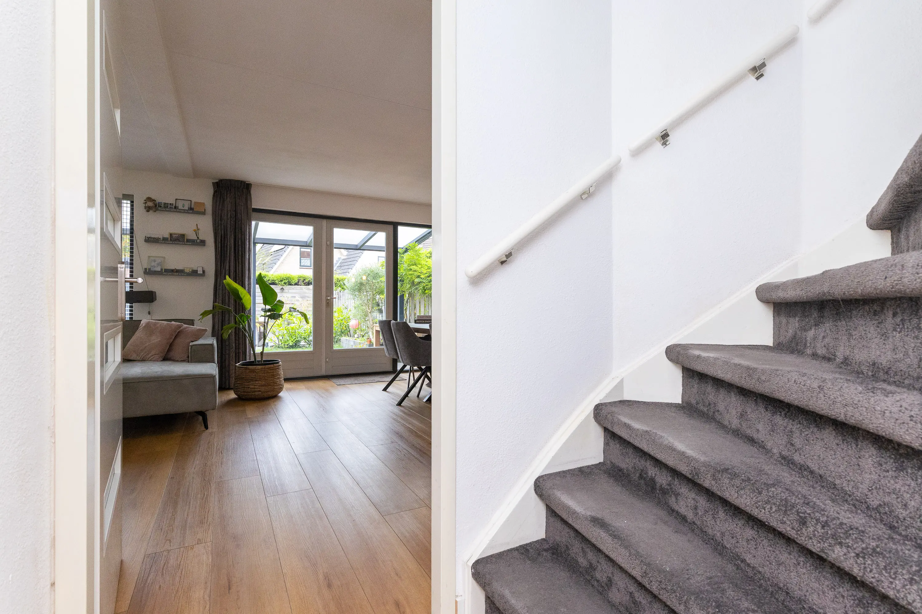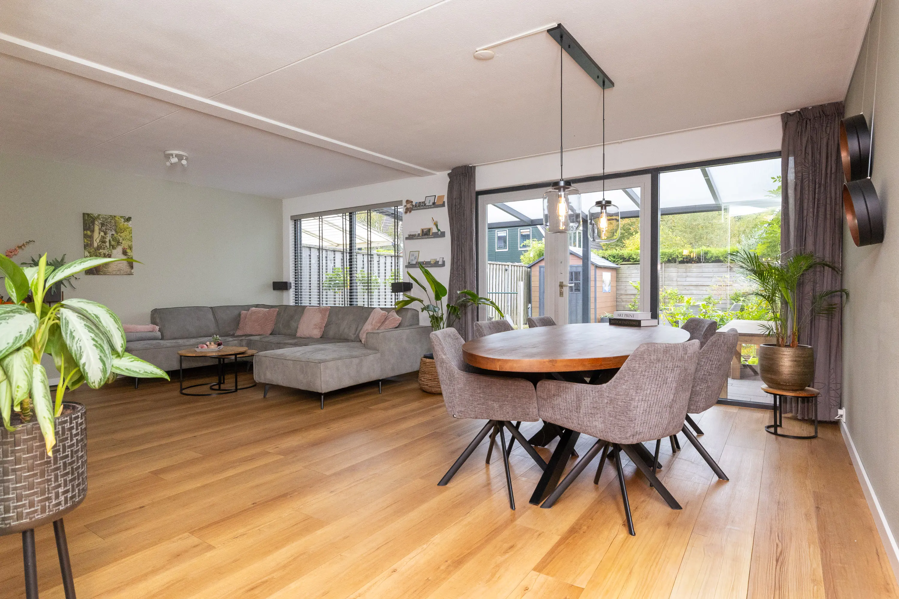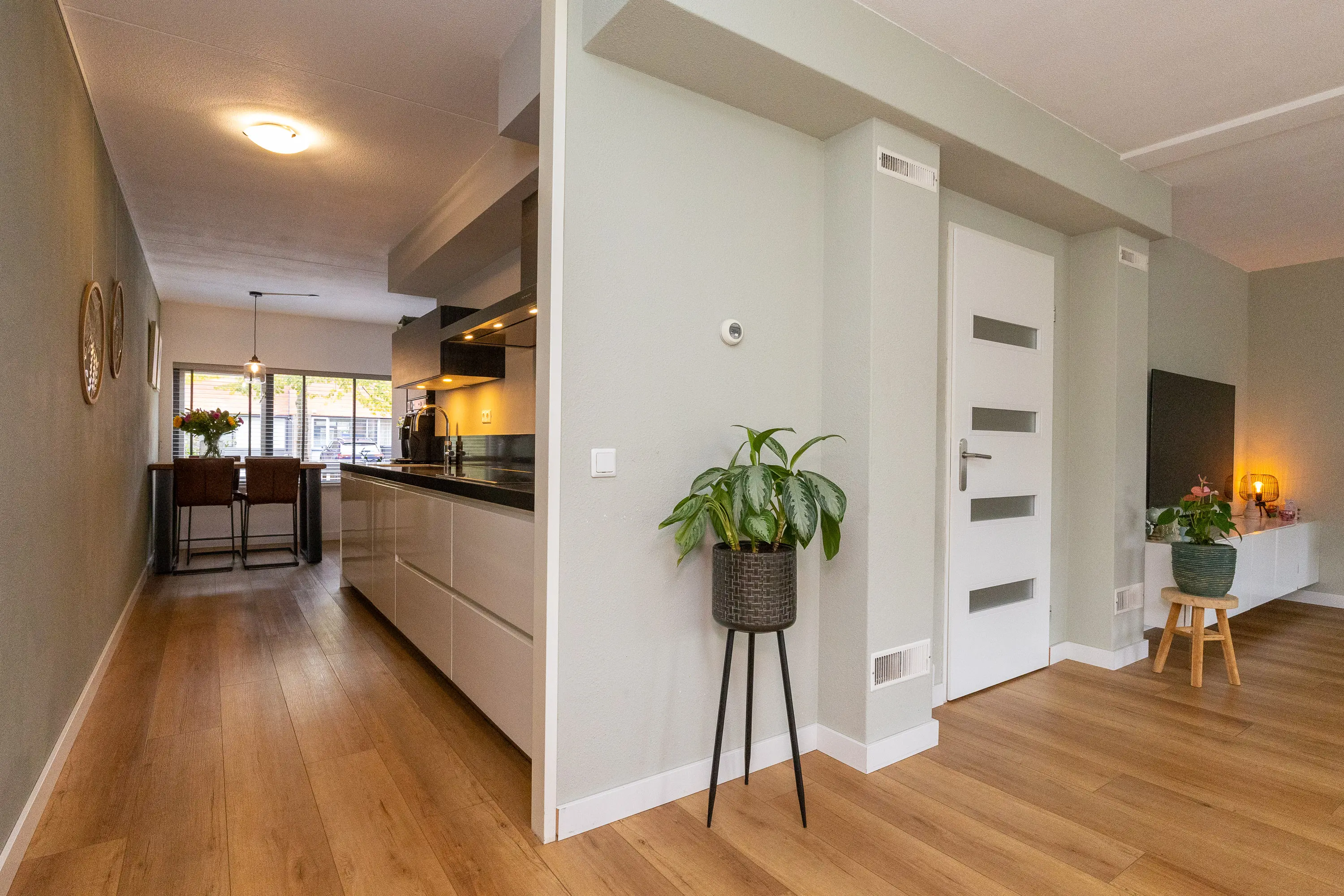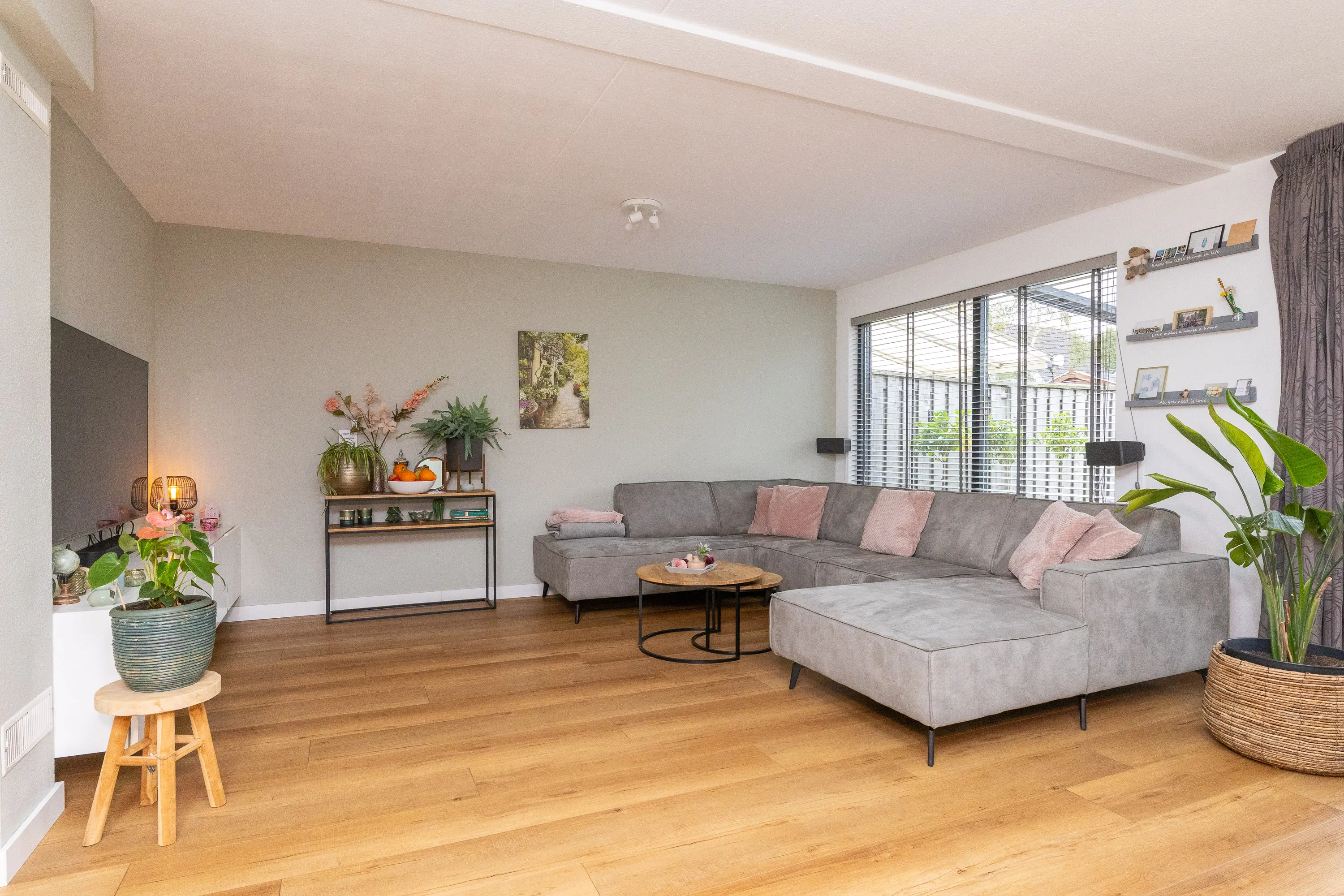Entree, hal met PVC vloer en vernieuwde meterkast. De PVC vloer loopt door in de keuken en eetkamer. De ruime, lichte woonkamer is extra breed, voorzien van grote raampartijen en dubbel openslaande deuren naar de zonnige tuin.