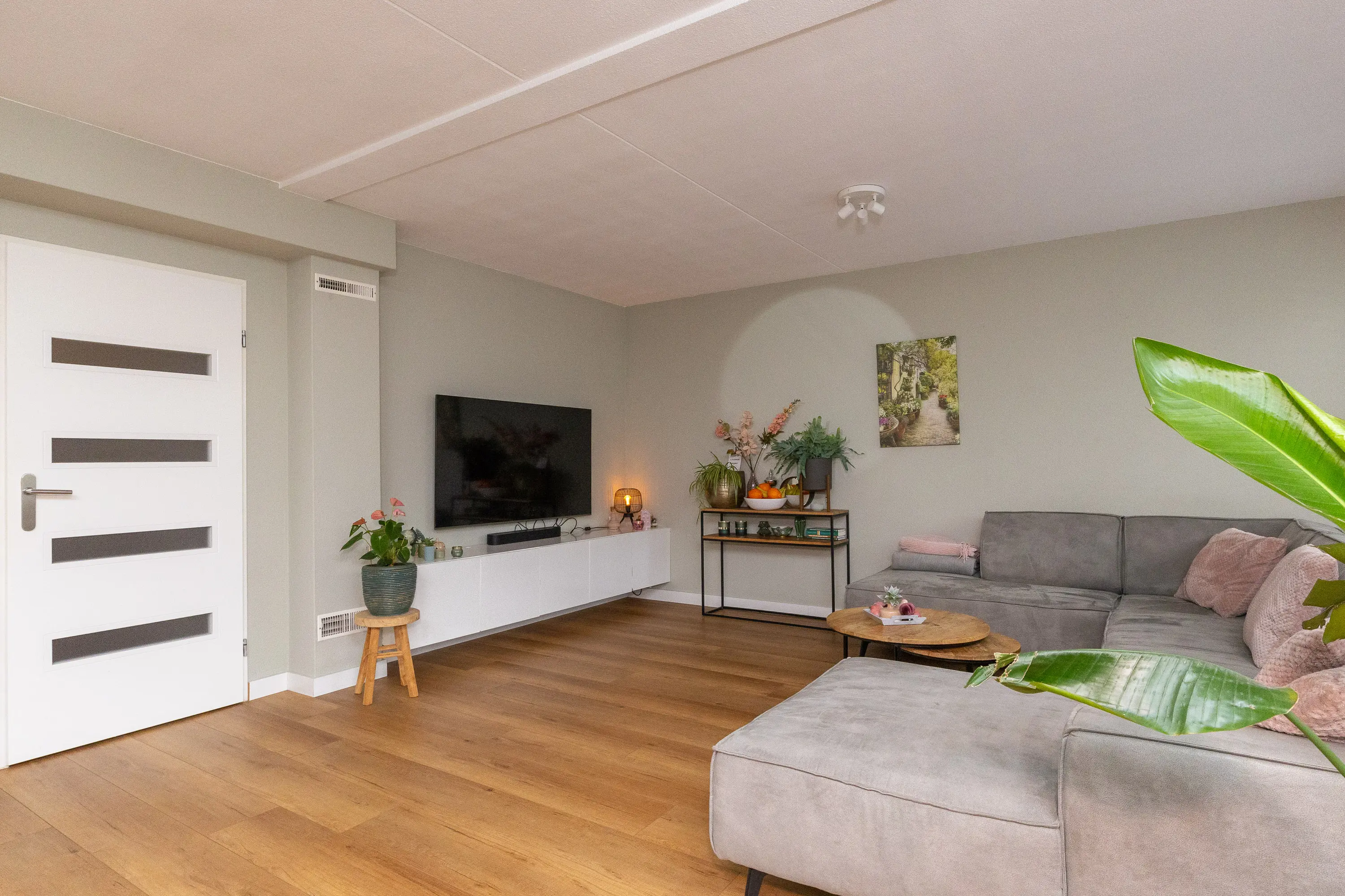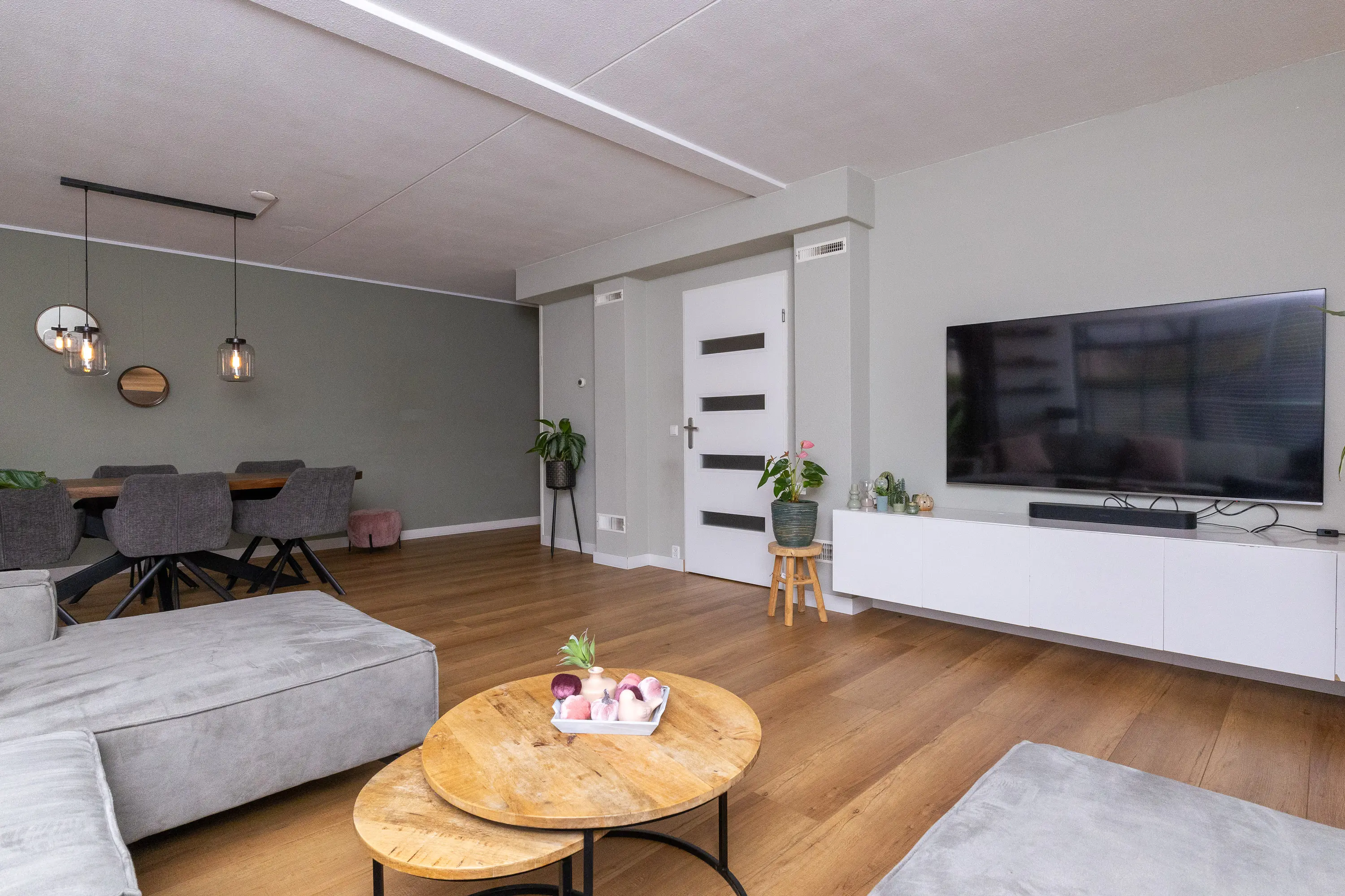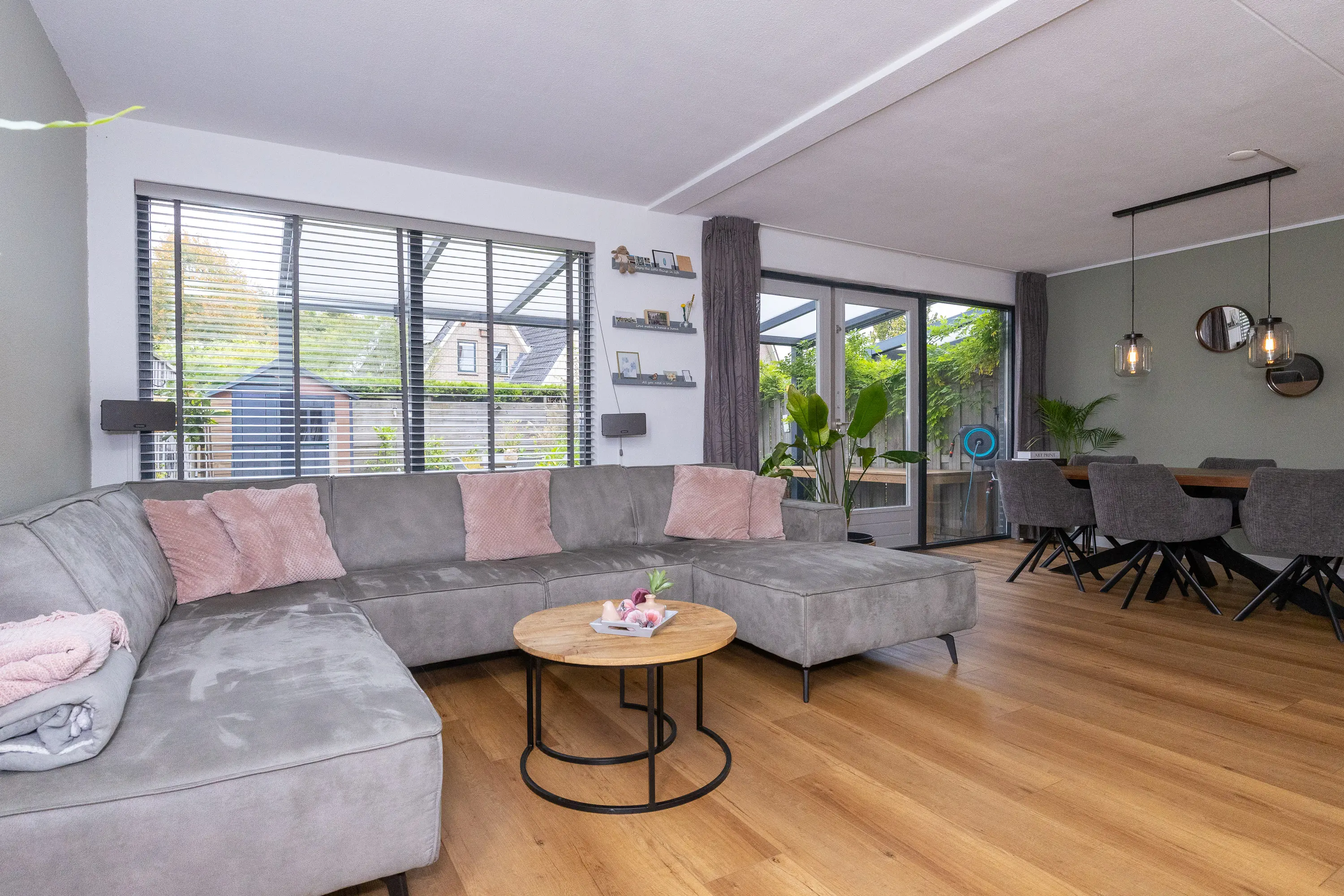 Entree, hal met PVC vloer en vernieuwde meterkast. De PVC vloer loopt door in de keuken en eetkamer. De ruime, lichte woonkamer is extra breed, voorzien van grote raampartijen en dubbel openslaande deuren naar de zonnige tuin.
