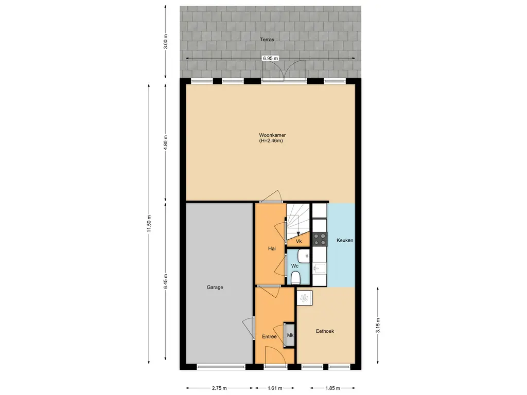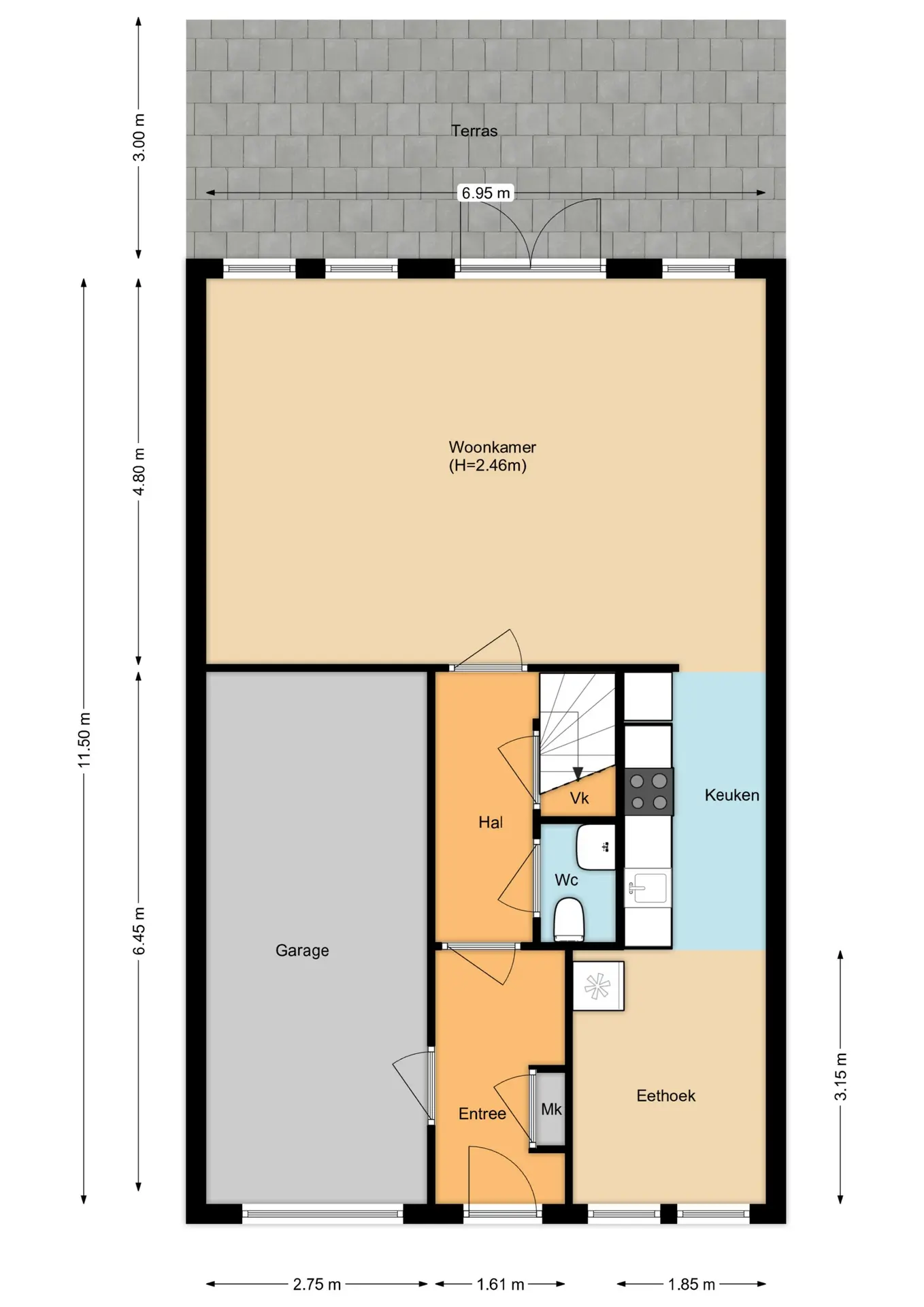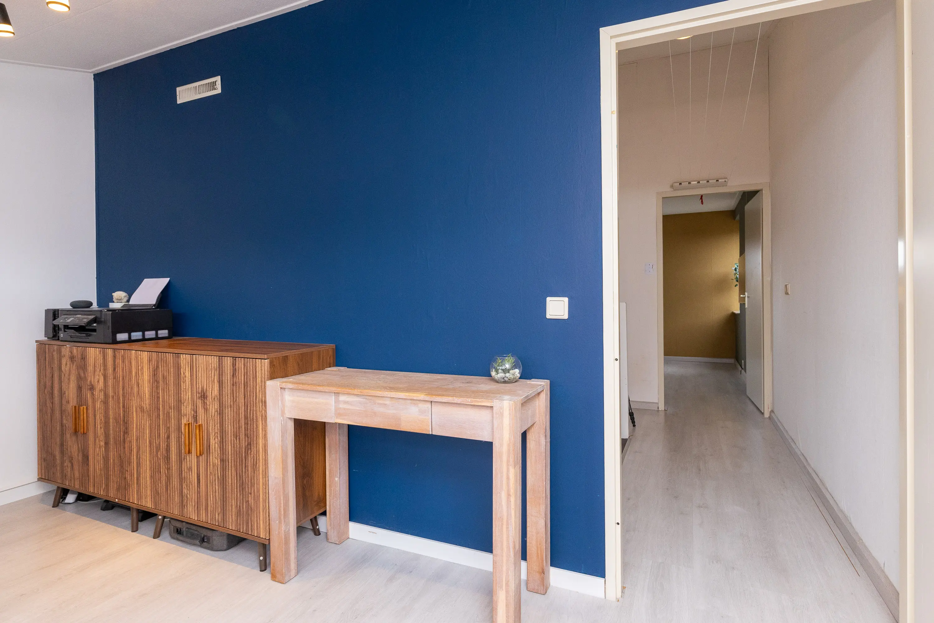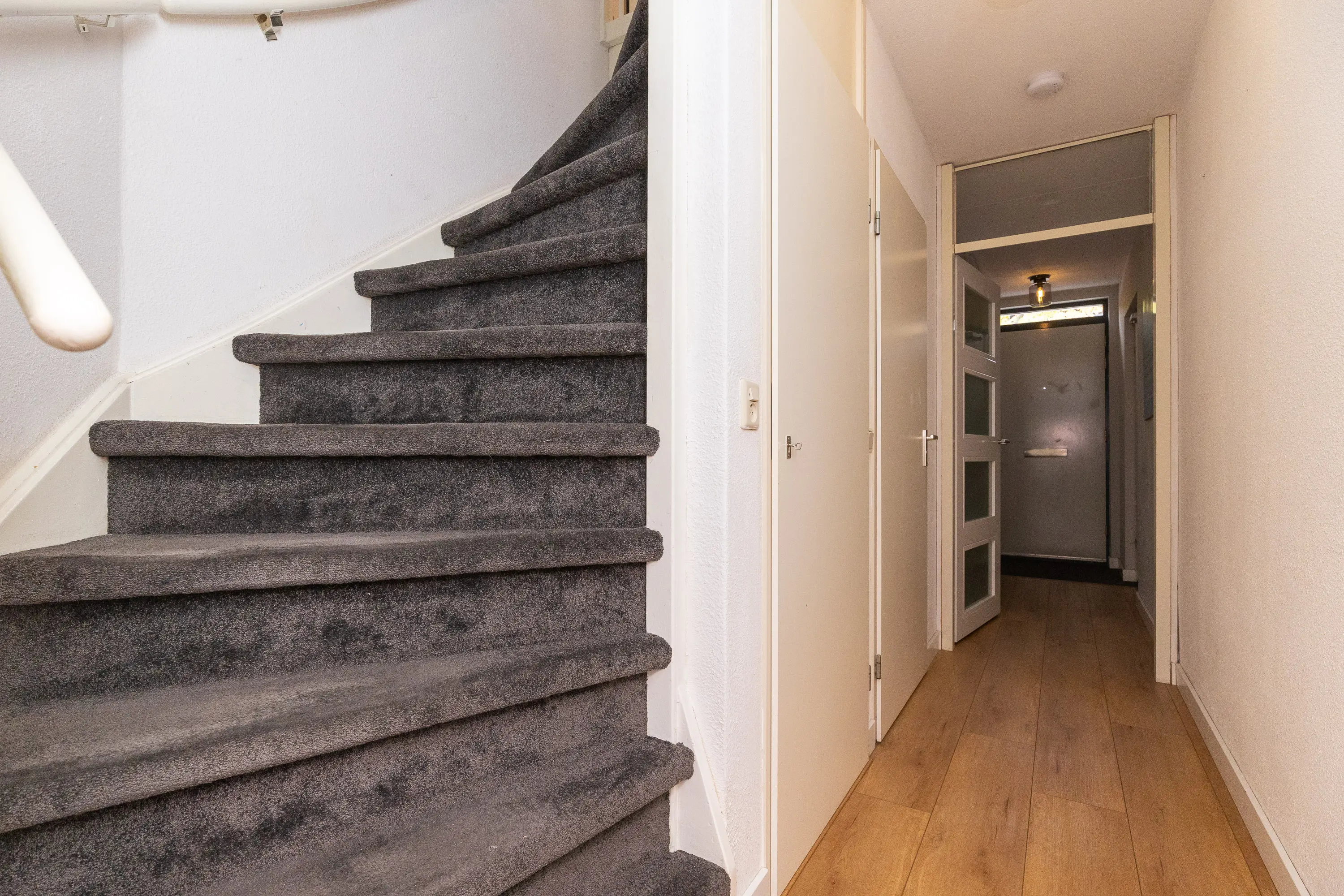 Entree, hal met PVC vloer en vernieuwde meterkast. De PVC vloer loopt door in de keuken en eetkamer. De ruime, lichte woonkamer is extra breed, voorzien van grote raampartijen en dubbel openslaande deuren naar de zonnige tuin.