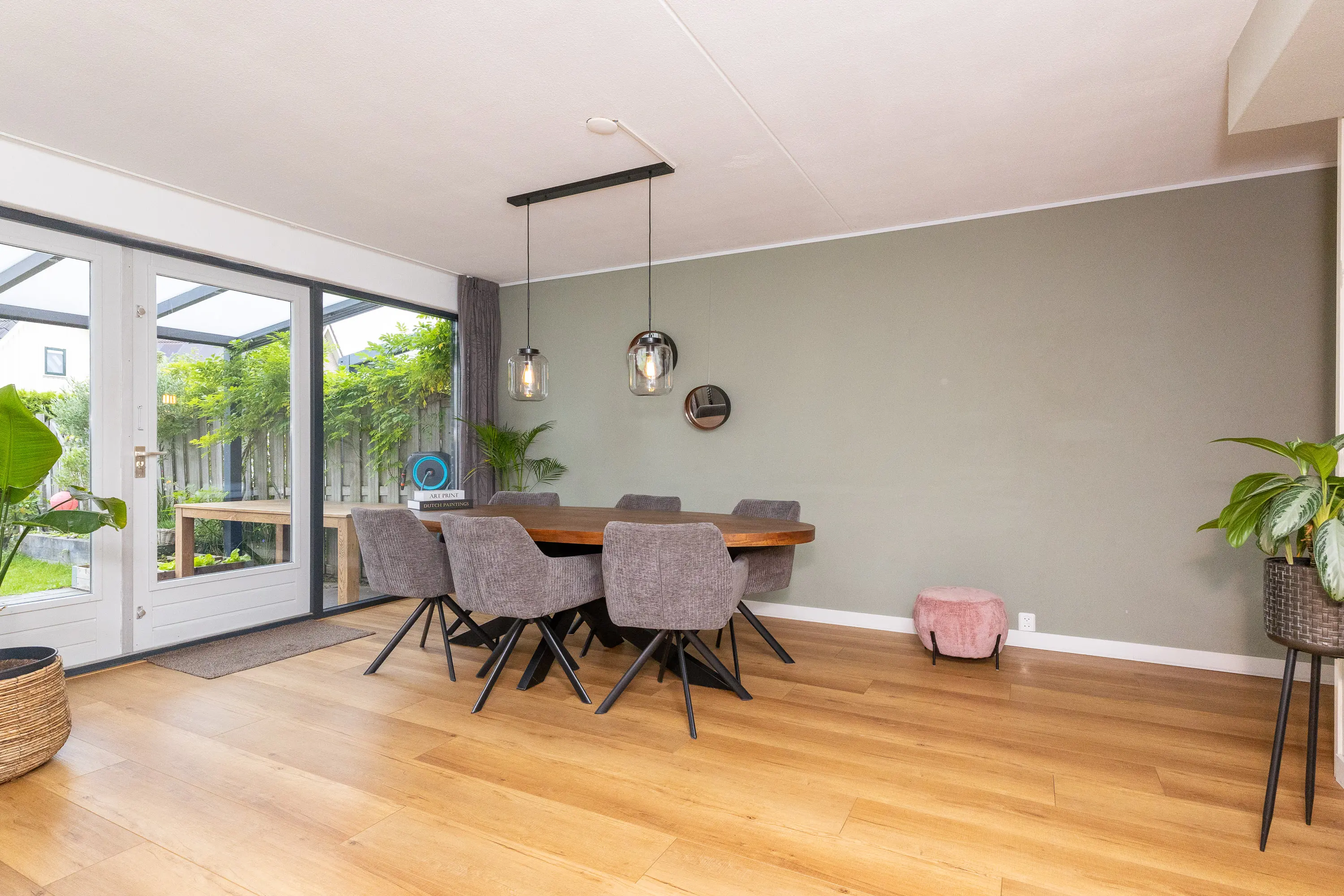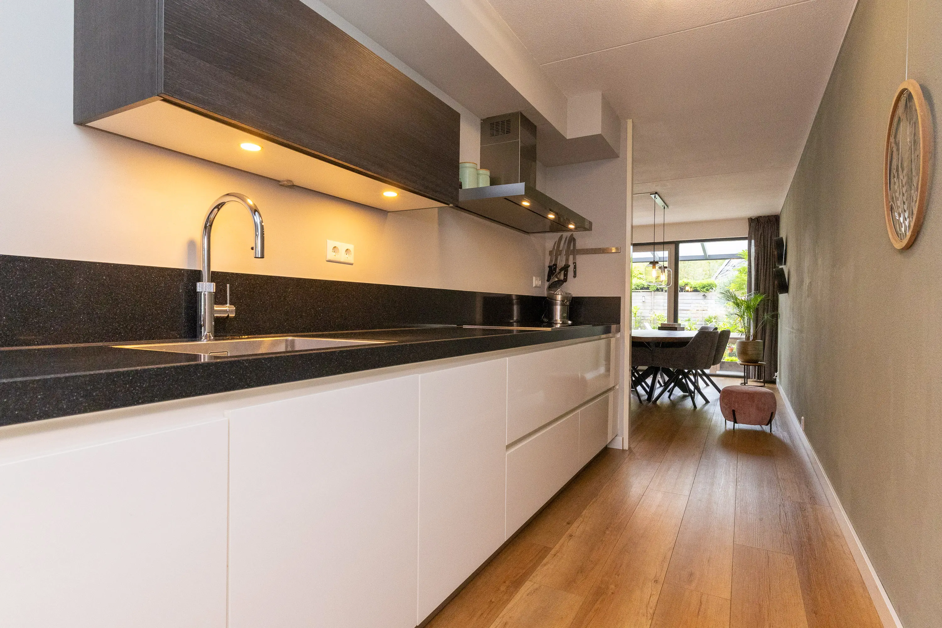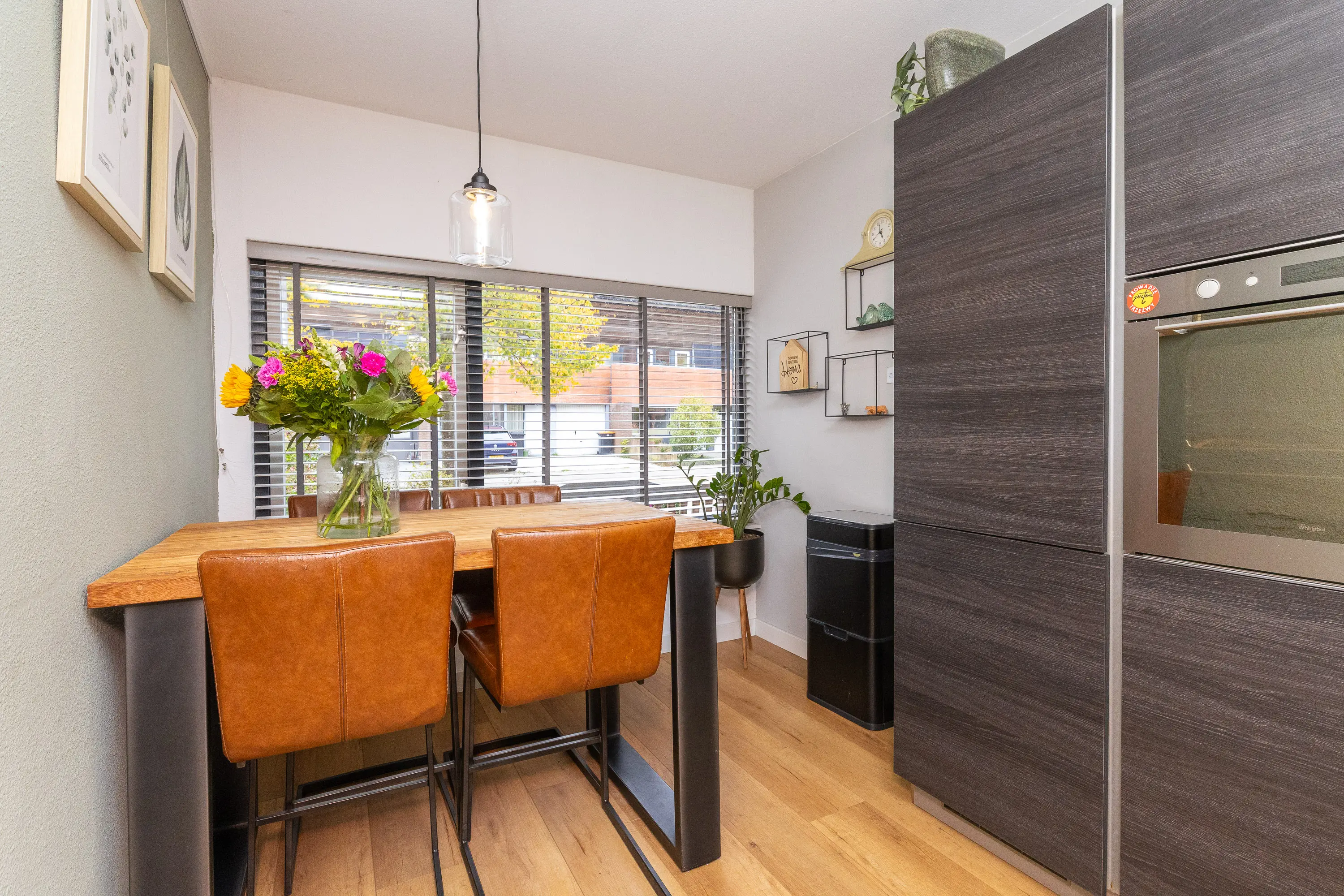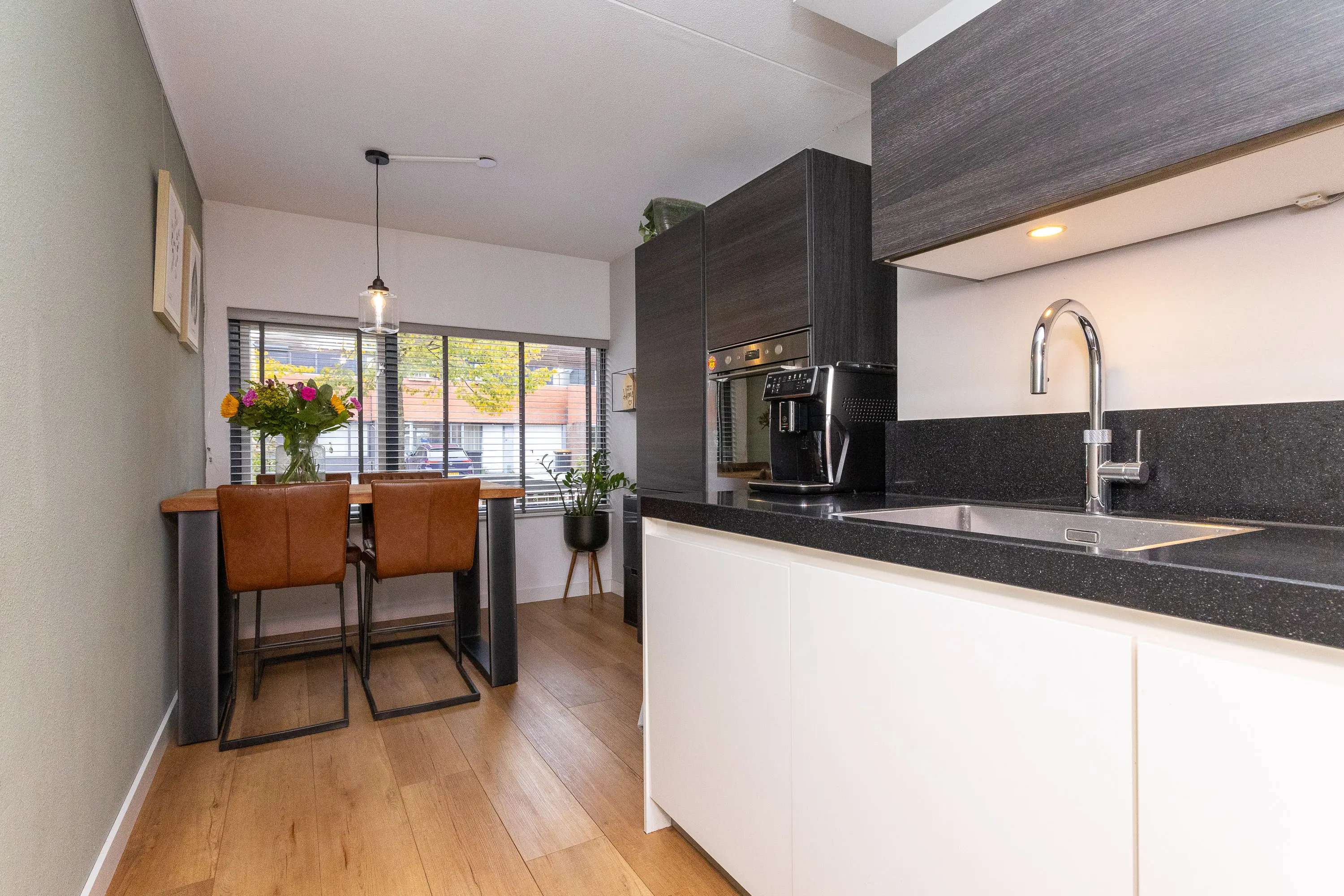 De greeploze keuken is modern vormgegeven en uitgerust met diverse inbouwapparatuur, waaronder een vaatwasser, koel-vriescombinatie, inductiekookplaat, Quooker, RVS-afzuigkap en voldoende kastruimte met geïntegreerde verlichting. De keuken grenst aan de straatgerichte eetkamer, die extra licht krijgt door de erker.