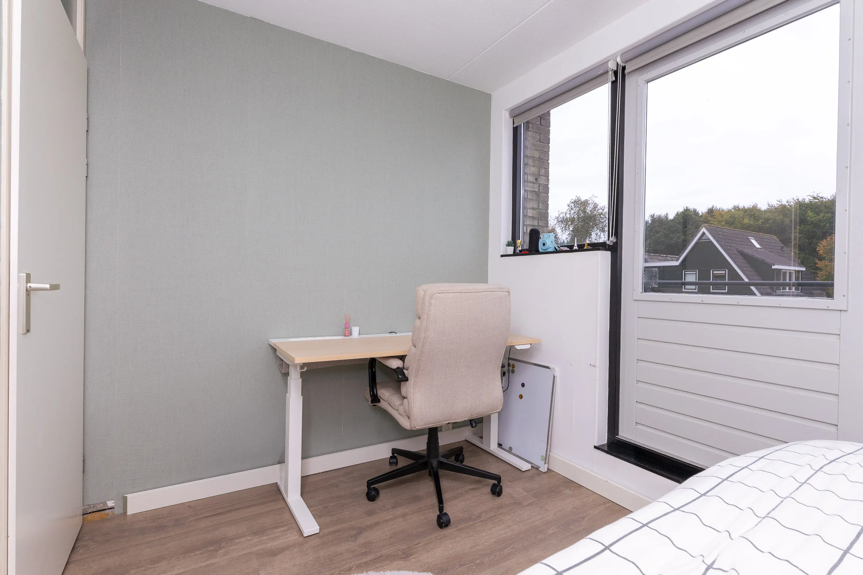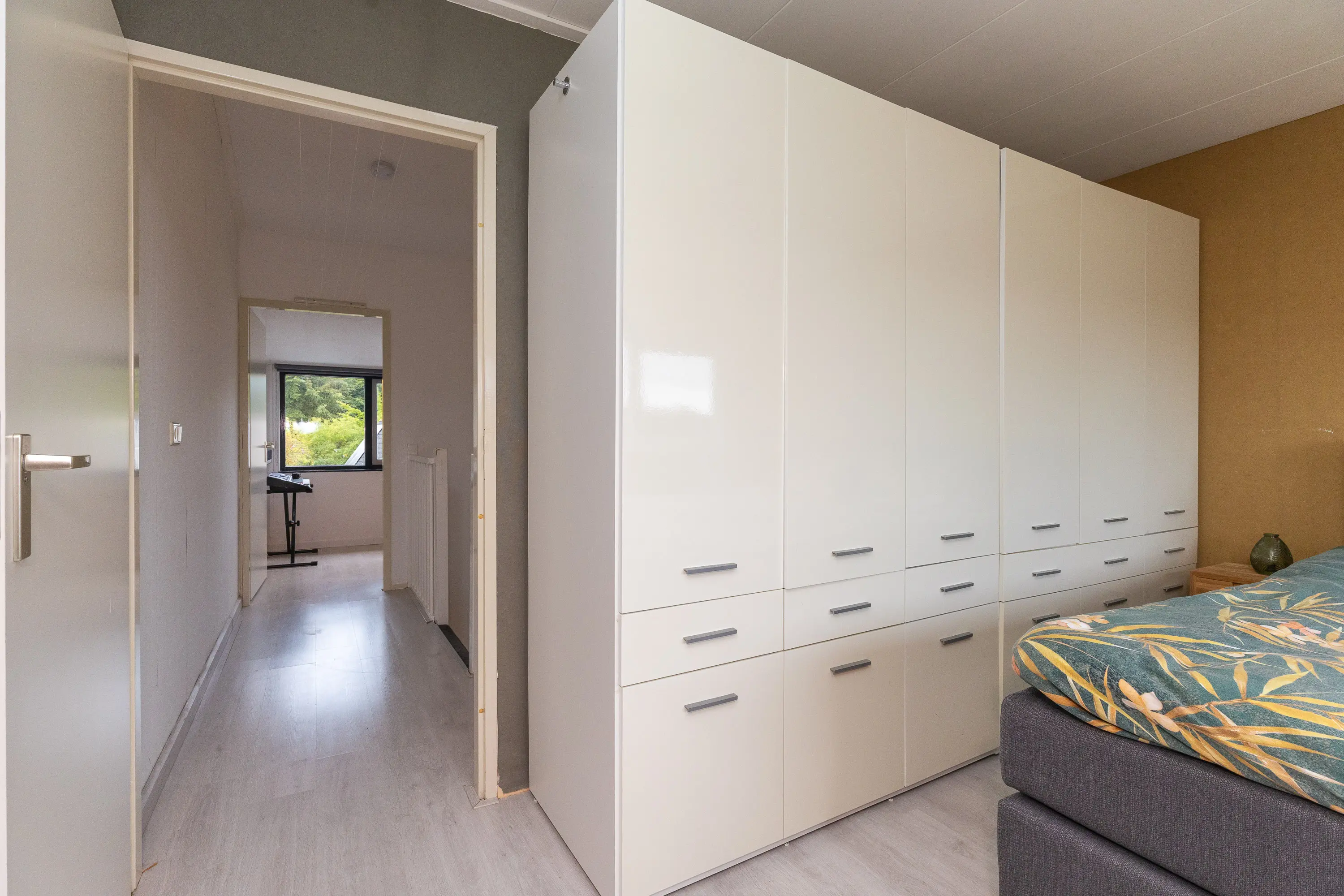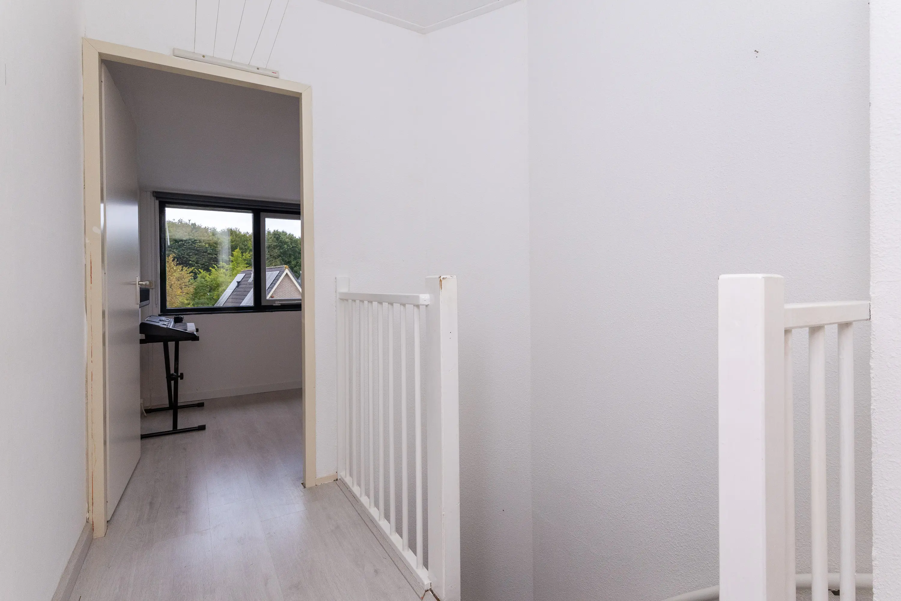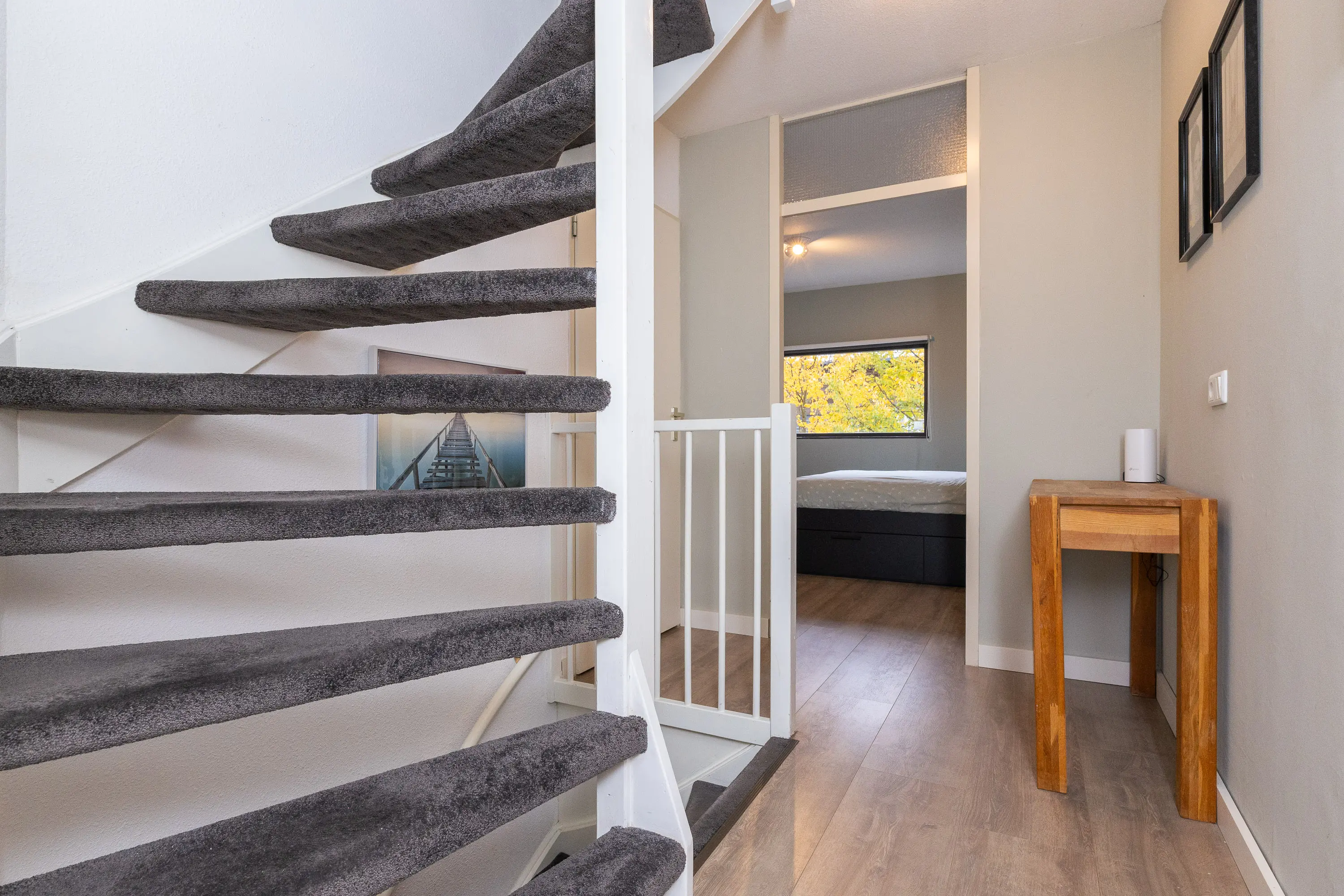 Overloop met toegang tot twee ruime slaapkamers met rechte wanden. De slaapkamer aan de achterzijde biedt toegang tot een ruim balkon. De eiken laminaatvloer loopt door over de gehele verdieping en is netjes afgewerkt met nieuwe plinten.