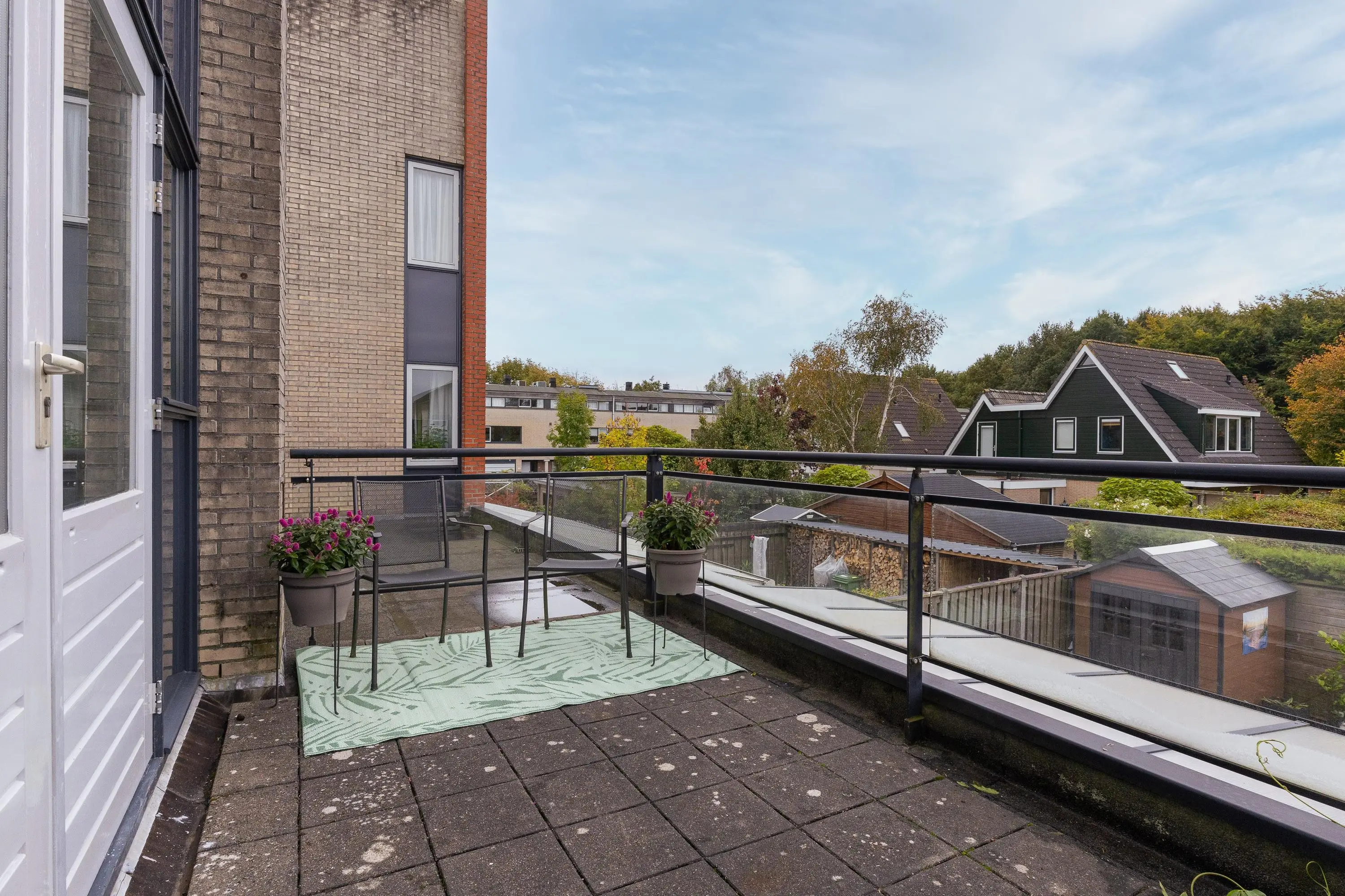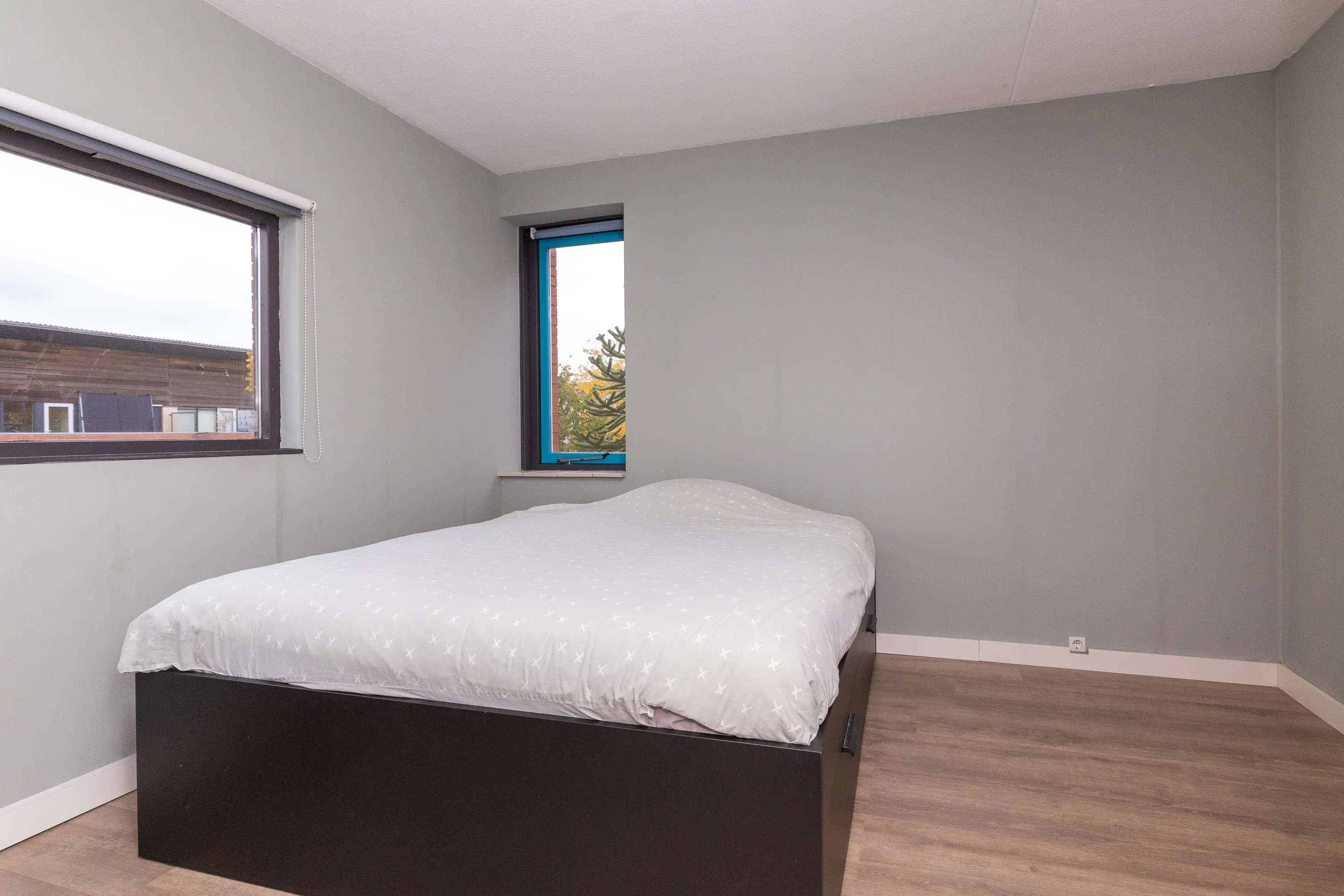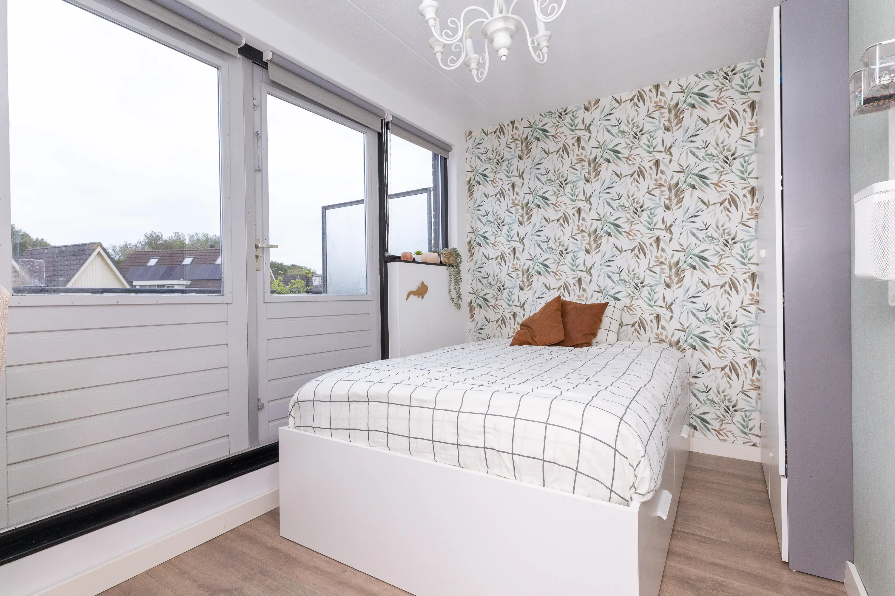 Overloop met toegang tot twee ruime slaapkamers met rechte wanden. De slaapkamer aan de achterzijde biedt toegang tot een ruim balkon. De eiken laminaatvloer loopt door over de gehele verdieping en is netjes afgewerkt met nieuwe plinten.