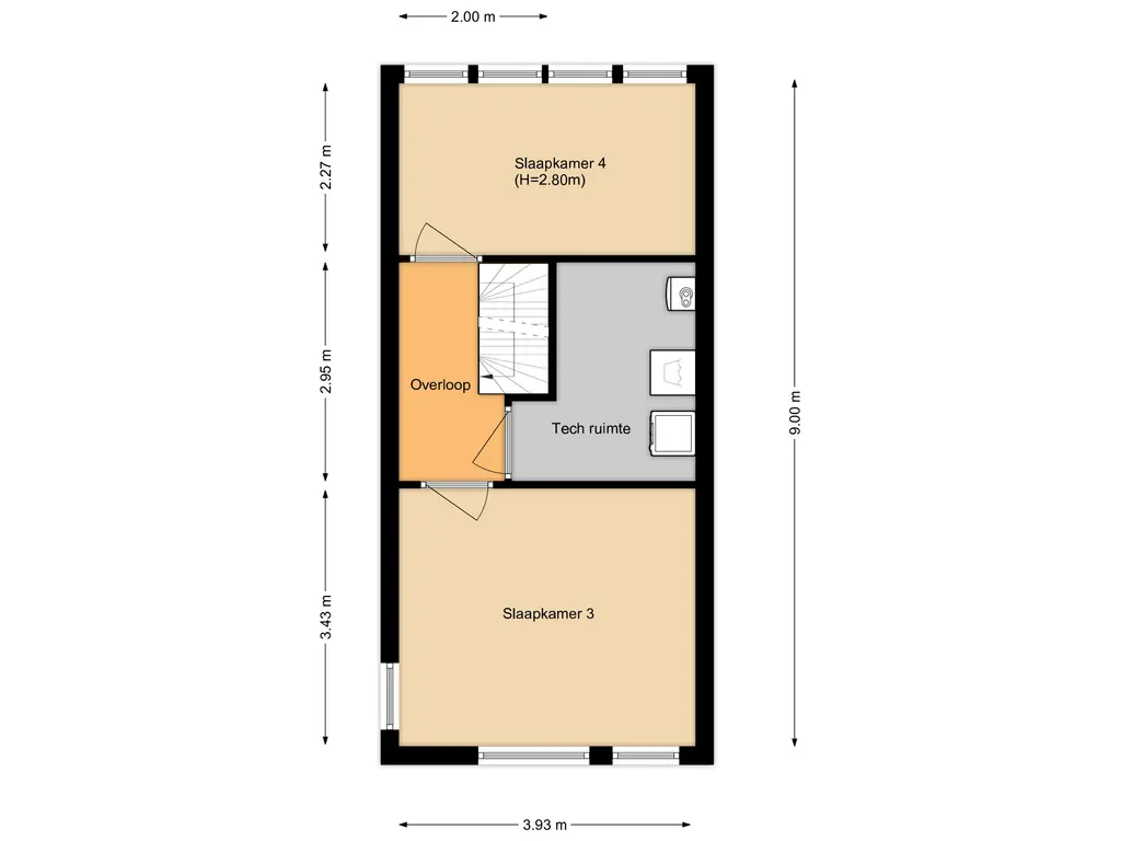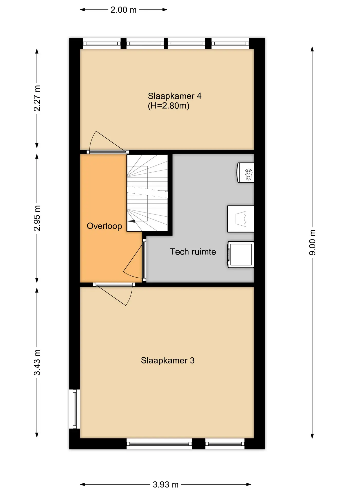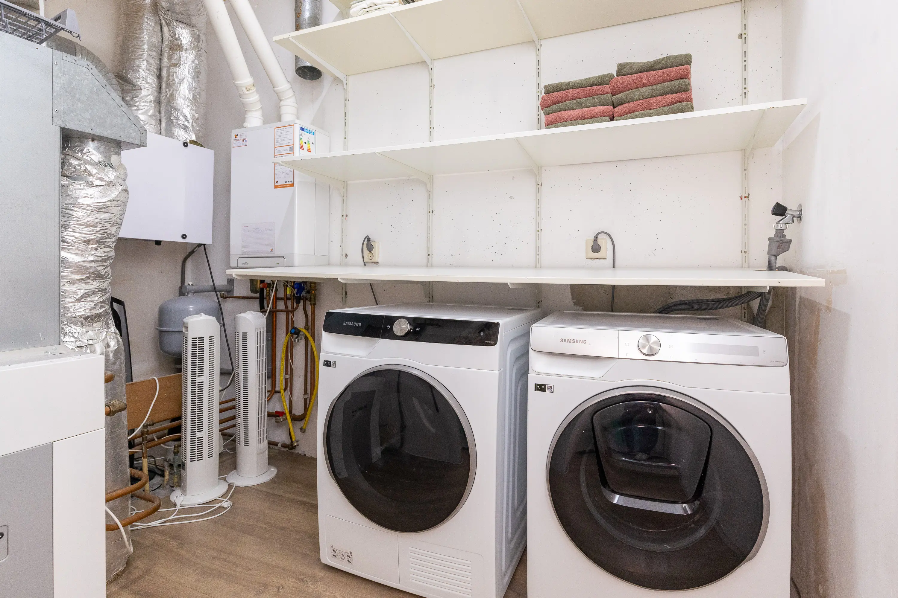 Via de vaste trap bereikt u nog twee slaapkamers en een technische ruimte met Intergas cv-ketel (2016), aansluitingen voor was apparatuur en heteluchtverwarming (Brink Elan 2016).