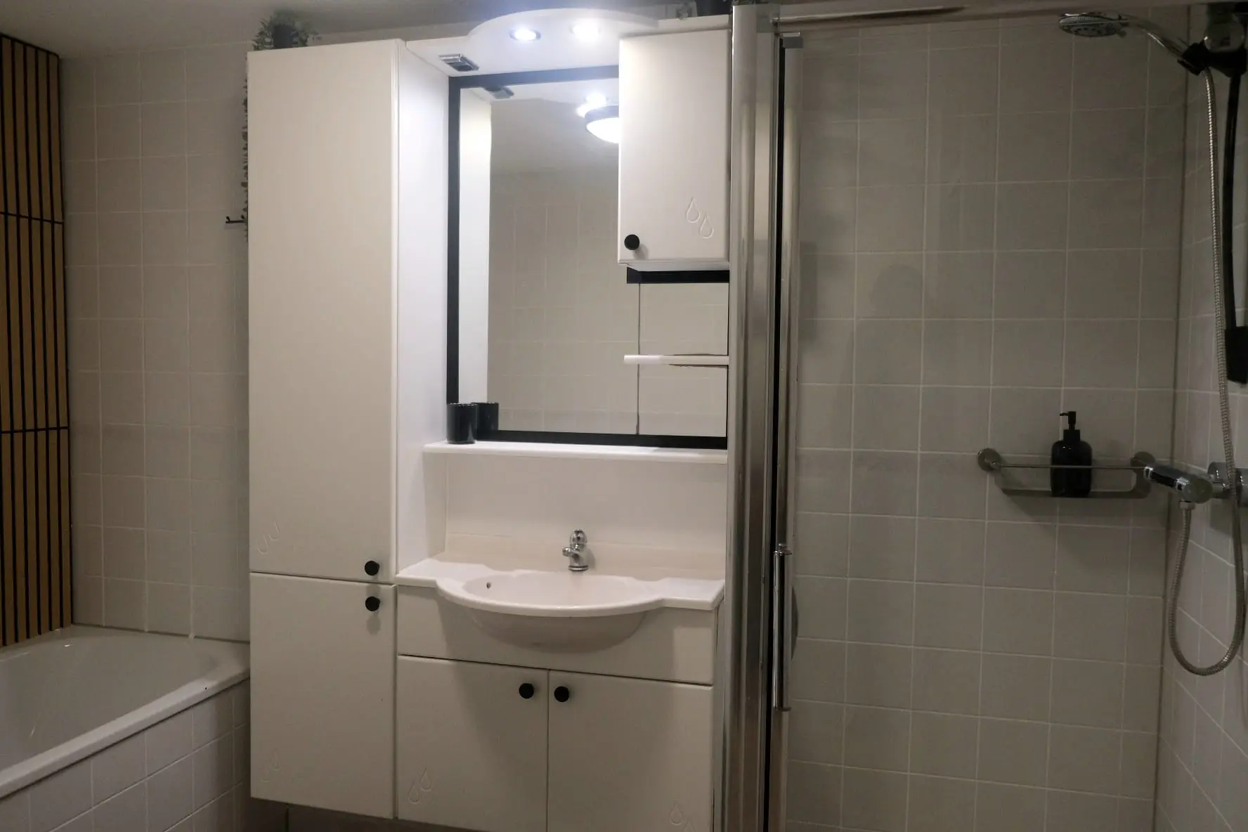 De badkamer is netjes onderhouden en voorzien van een douchehoek, ligbad, tweede toilet en wastafelmeubel.