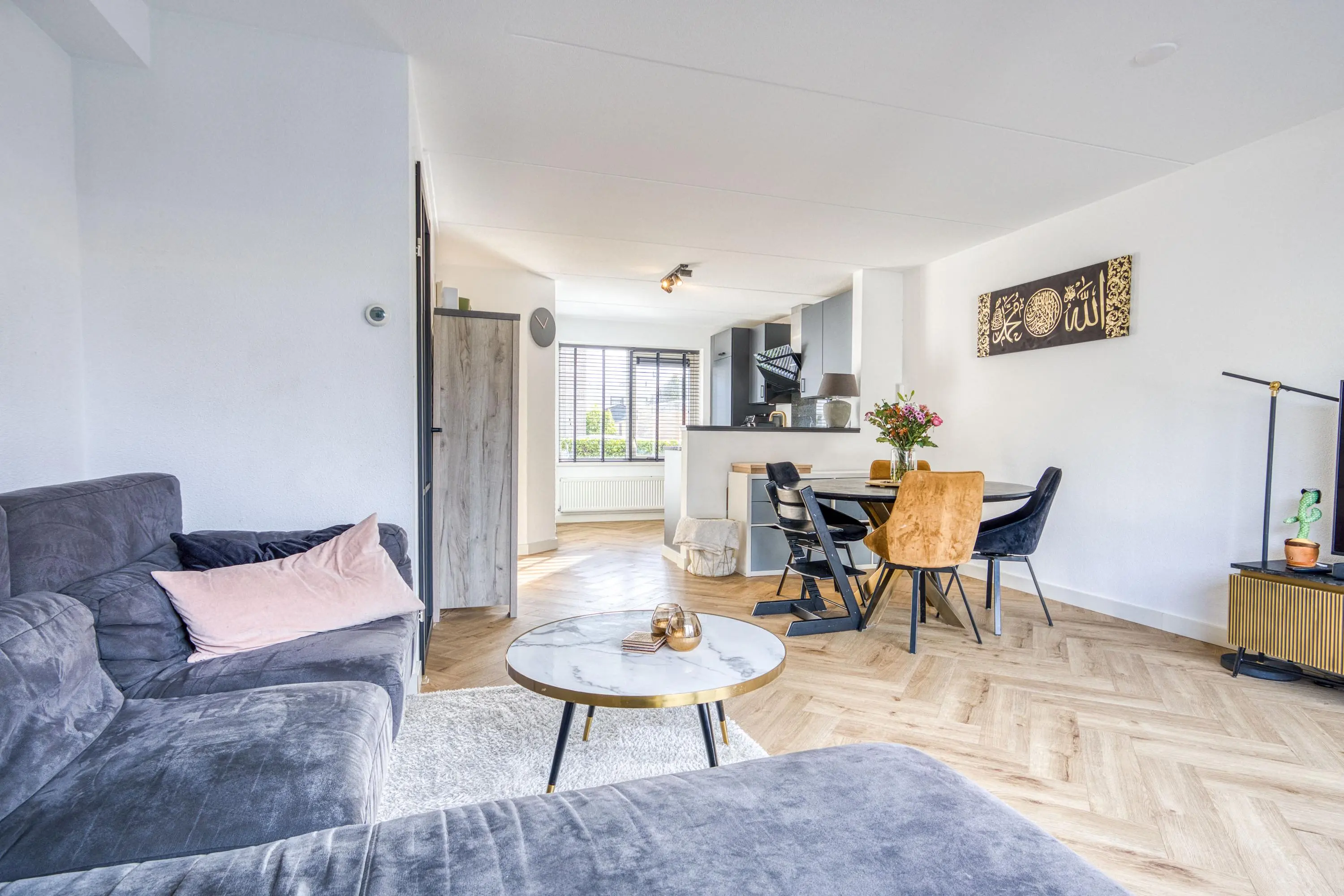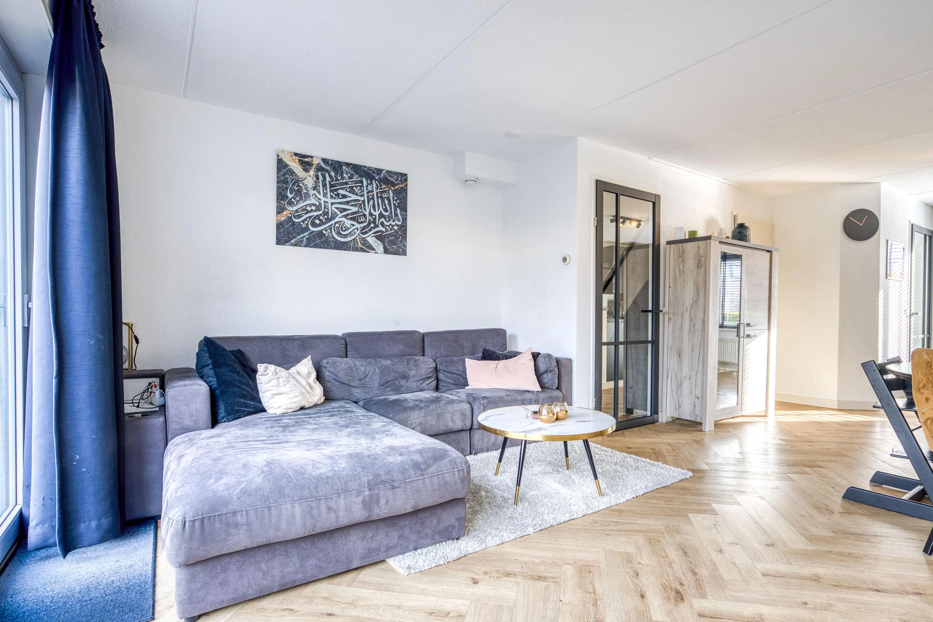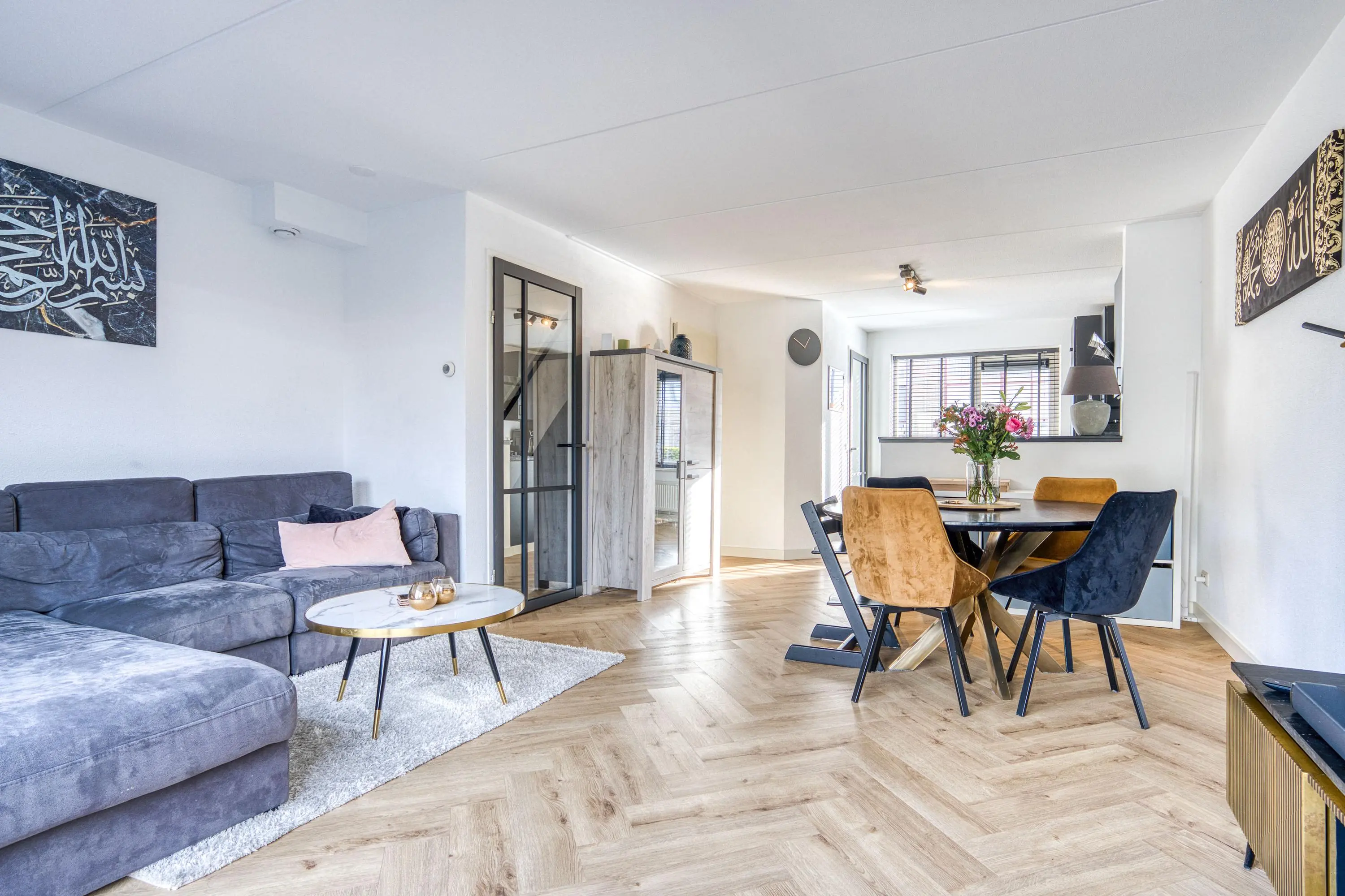 Via de entree kom je in de hal met toiletruimte en toegang tot de woonkamer. De woonkamer is licht en strak afgewerkt en voorzien van een moderne PVC visgraatvloer, wat zorgt voor een warme en eigentijdse uitstraling. Dankzij de grote raampartijen is er veel natuurlijke lichtinval en een prettig contact met de tuin.