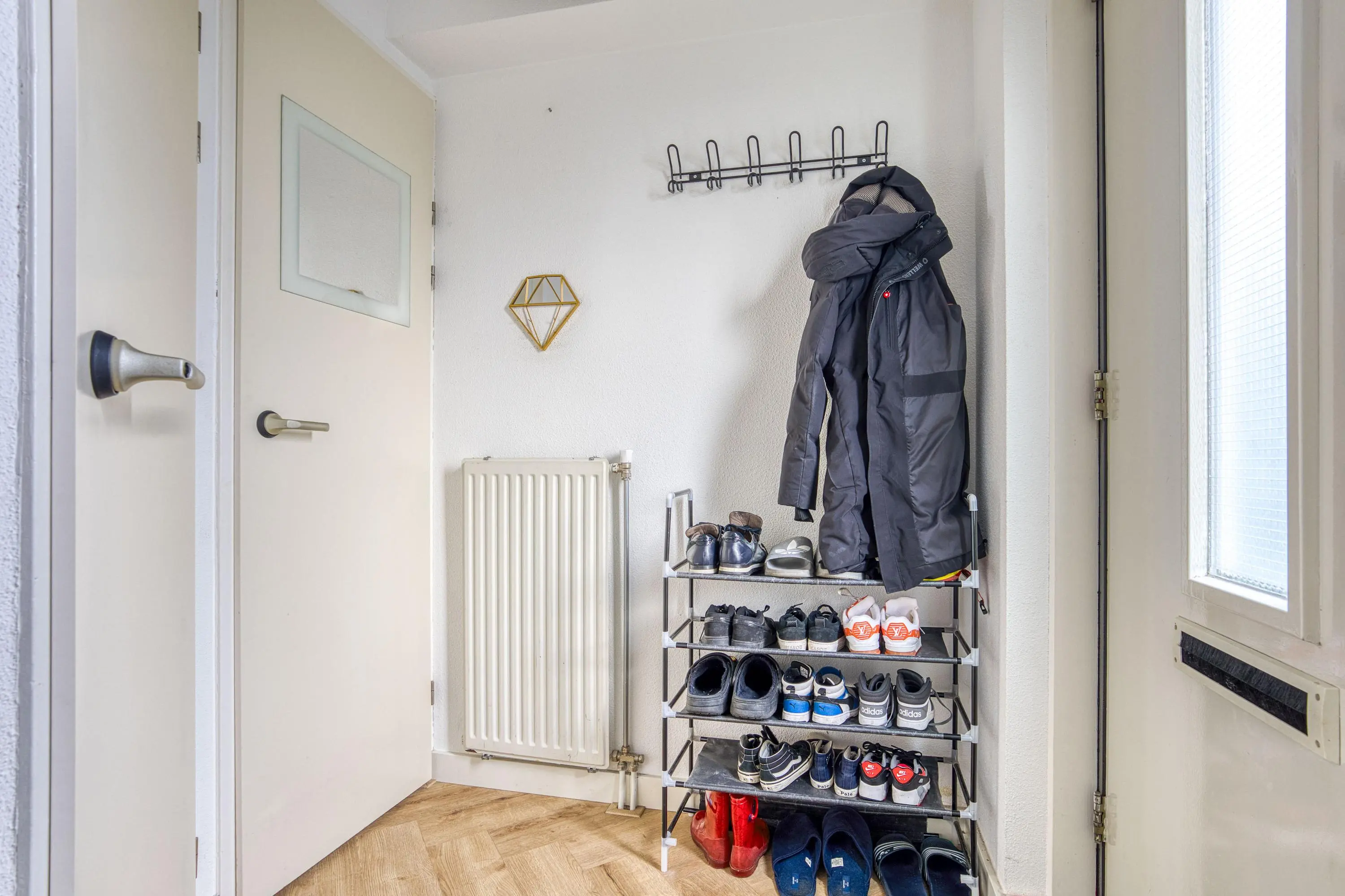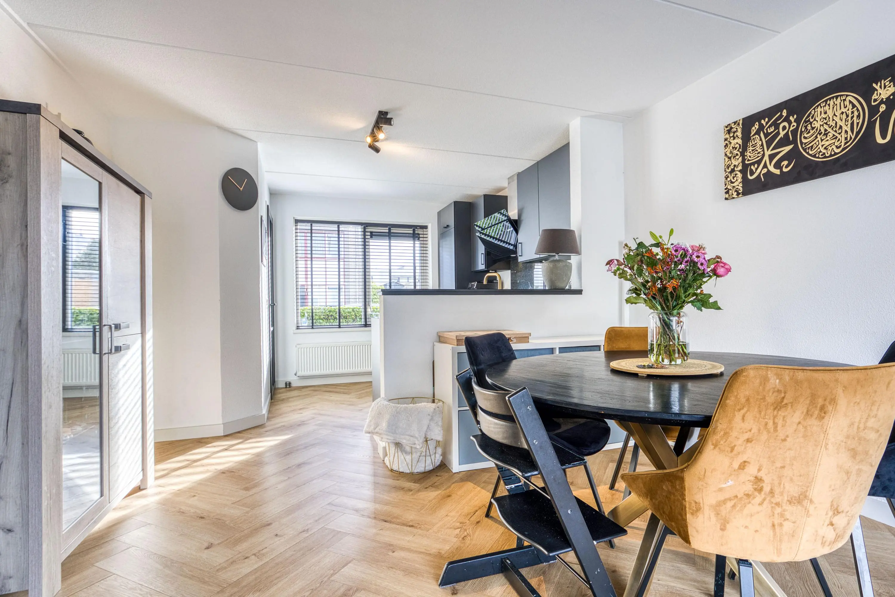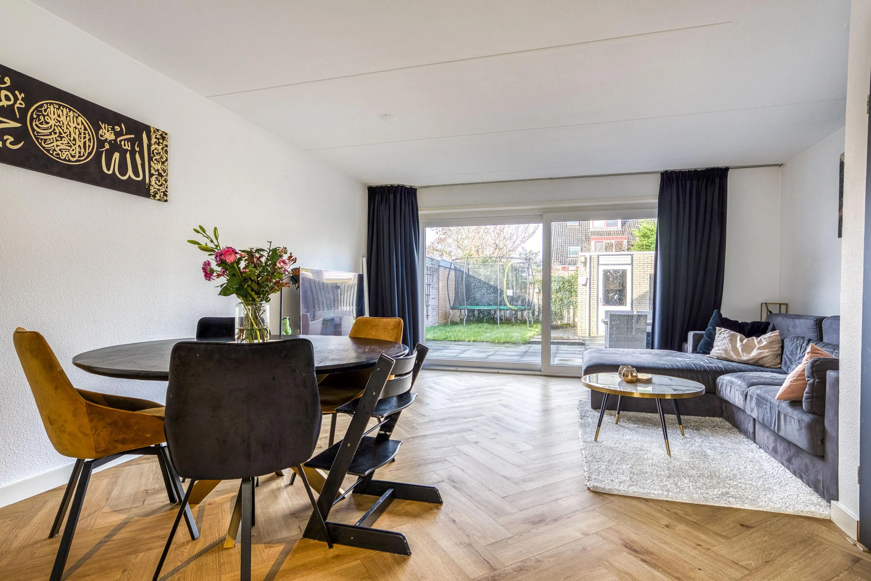 Via de entree kom je in de hal met toiletruimte en toegang tot de woonkamer. De woonkamer is licht en strak afgewerkt en voorzien van een moderne PVC visgraatvloer, wat zorgt voor een warme en eigentijdse uitstraling. Dankzij de grote raampartijen is er veel natuurlijke lichtinval en een prettig contact met de tuin.