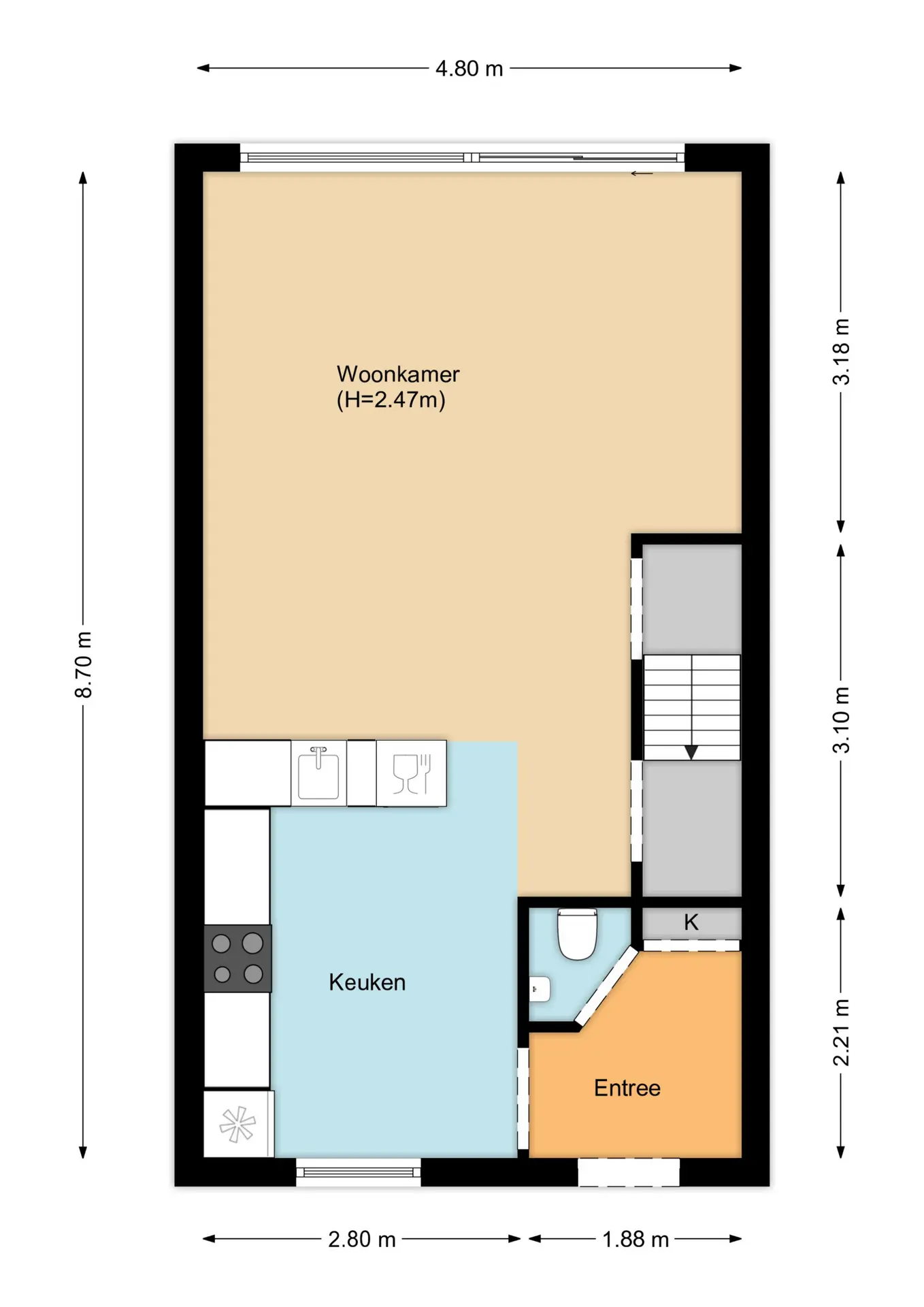 Aan de voorzijde van de woning bevindt zich de moderne keuken, uitgevoerd in een tijdloze stijl en voorzien van diverse inbouwapparatuur. Een praktische en comfortabele ruimte waar koken en wonen mooi samenkomen.