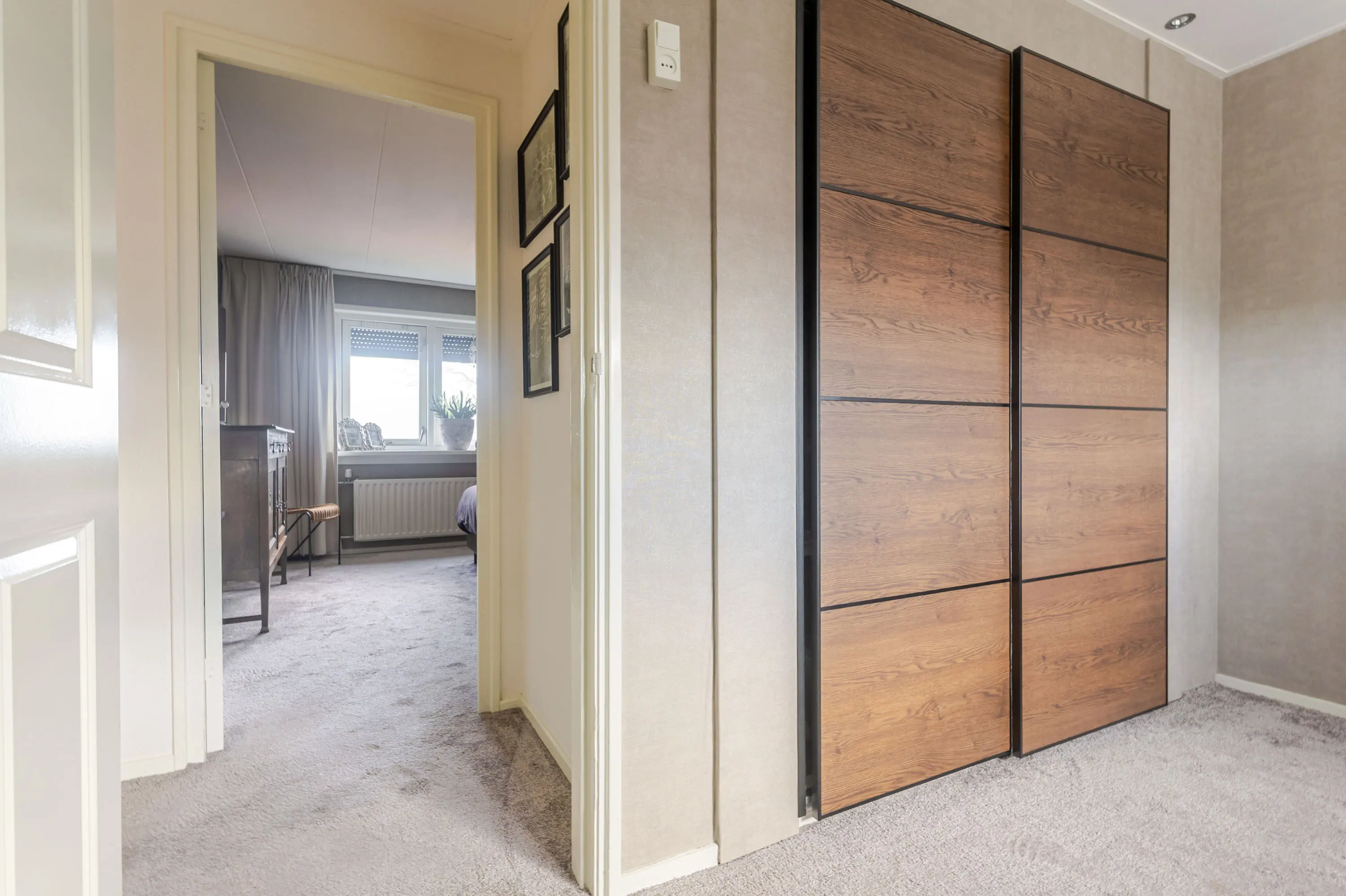 Overloop, 2-tal slaapkamers aan de achterzijde en een slaapkamer aan de voorzijde waarvan een tweetal slaapkamers zijn voorzien van vaste kasten. De luxe badkamer is netjes betegeld en hier treft u een douche, toilet en een wastafel. De gehele 1e verdieping is voorzien van rechte wanden.