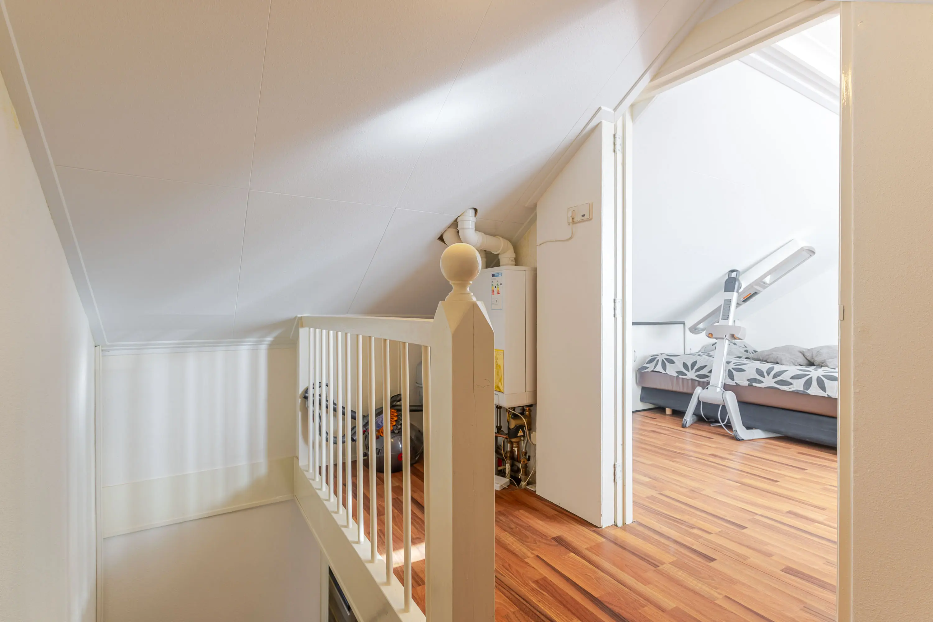 Bereikbaar via een vaste trap, overloop met opstelling van de C.V. ketel (Intergas, 2016), slaapkamer met een dakkapel.