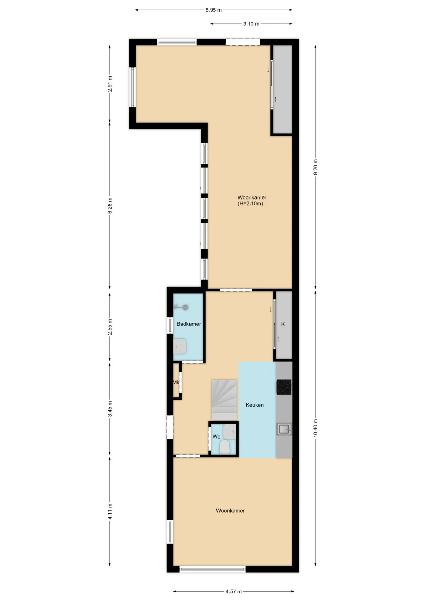 De garage aan de achterzijde is omgebouwd tot woonruimte en met een serre verbonden aan de originele woning. Hierdoor is een riante benedenverdieping ontstaan welke de bewoner(s) meerdere indelingsmogelijkheden geeft. Dus gelijkvloers wonen behoort zeker tot de mogelijkheden. Zoals van oudsher gebruikelijk is, bevindt zich de badkamer beneden en is het toilet apart. Dat geeft een groter comfort.