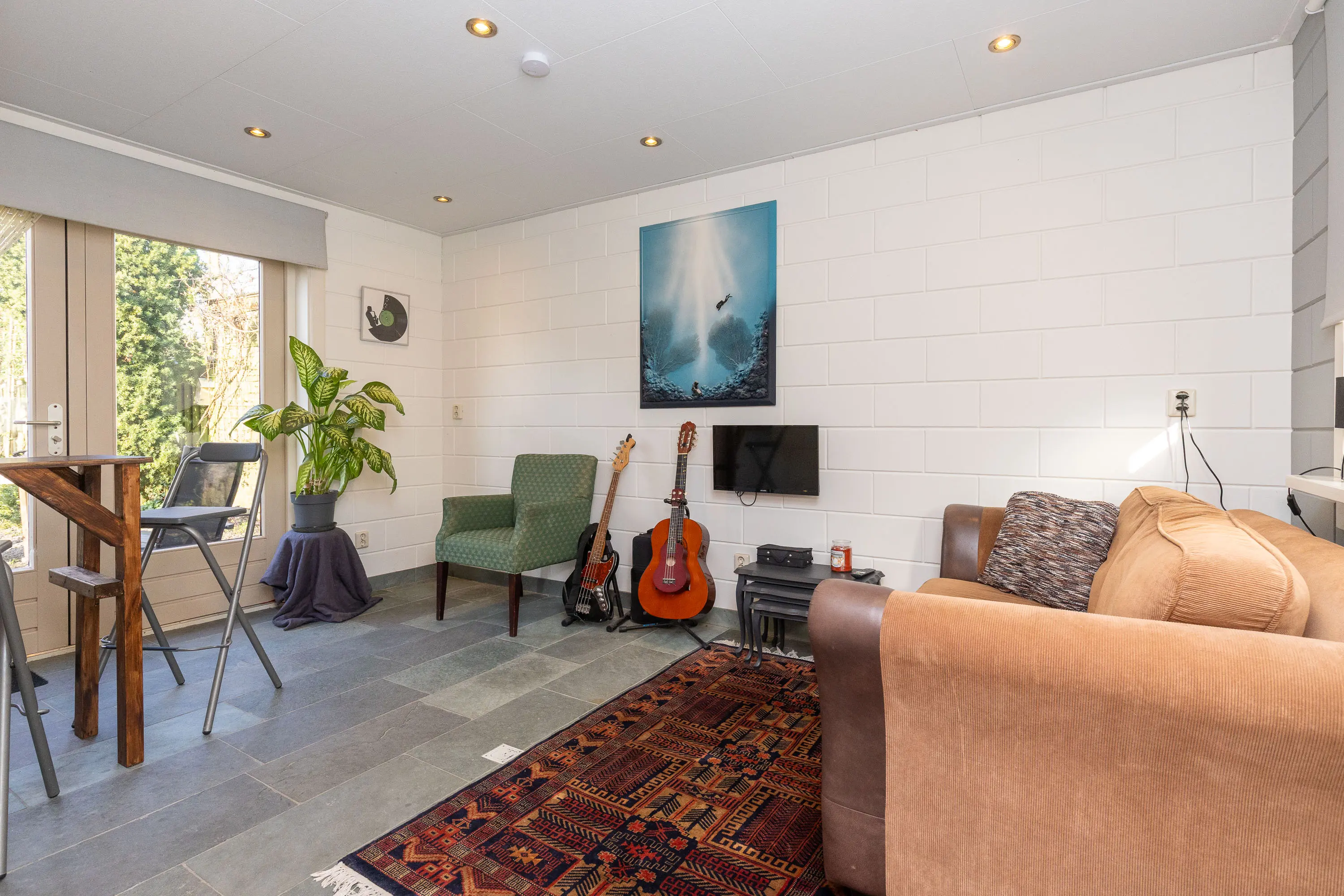 Via de tuin komt u vervolgens in het bijgebouw. Het bijgebouw met eigen toegang is voor meerdere doeleinden bruikbaar. Hebben uw pubers ruimte nodig? Een werkplek of praktijk aan huis? Inwonende ouders of schoonouders? Alles is hier mogelijk. De begane grond is voorzien van vloerverwarming. Thans zijn er twee slaapkamers op de eerste verdieping, een badkamer, toilet en keuken op de begane grond . De woonkamer van dit bijgebouw grenst eveneens aan de binnentuin. Er is zelfs nog ruimte inpandig voor een auto of een extra werkplek of slaapkamer op de begane grond. Voor het bijgebouw treft u twee parkeerplaatsen op eigen terrein en een laadpaal voor uw elektrische auto.