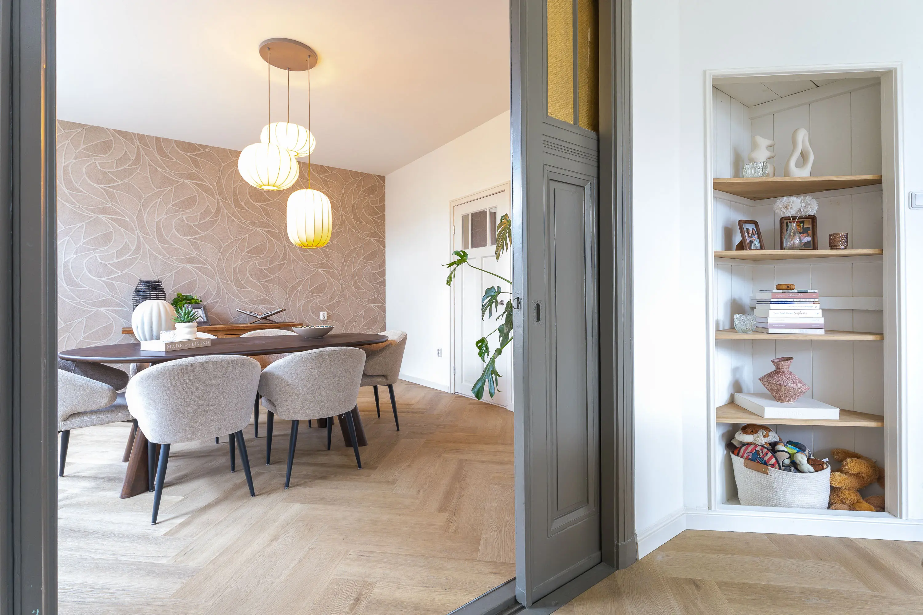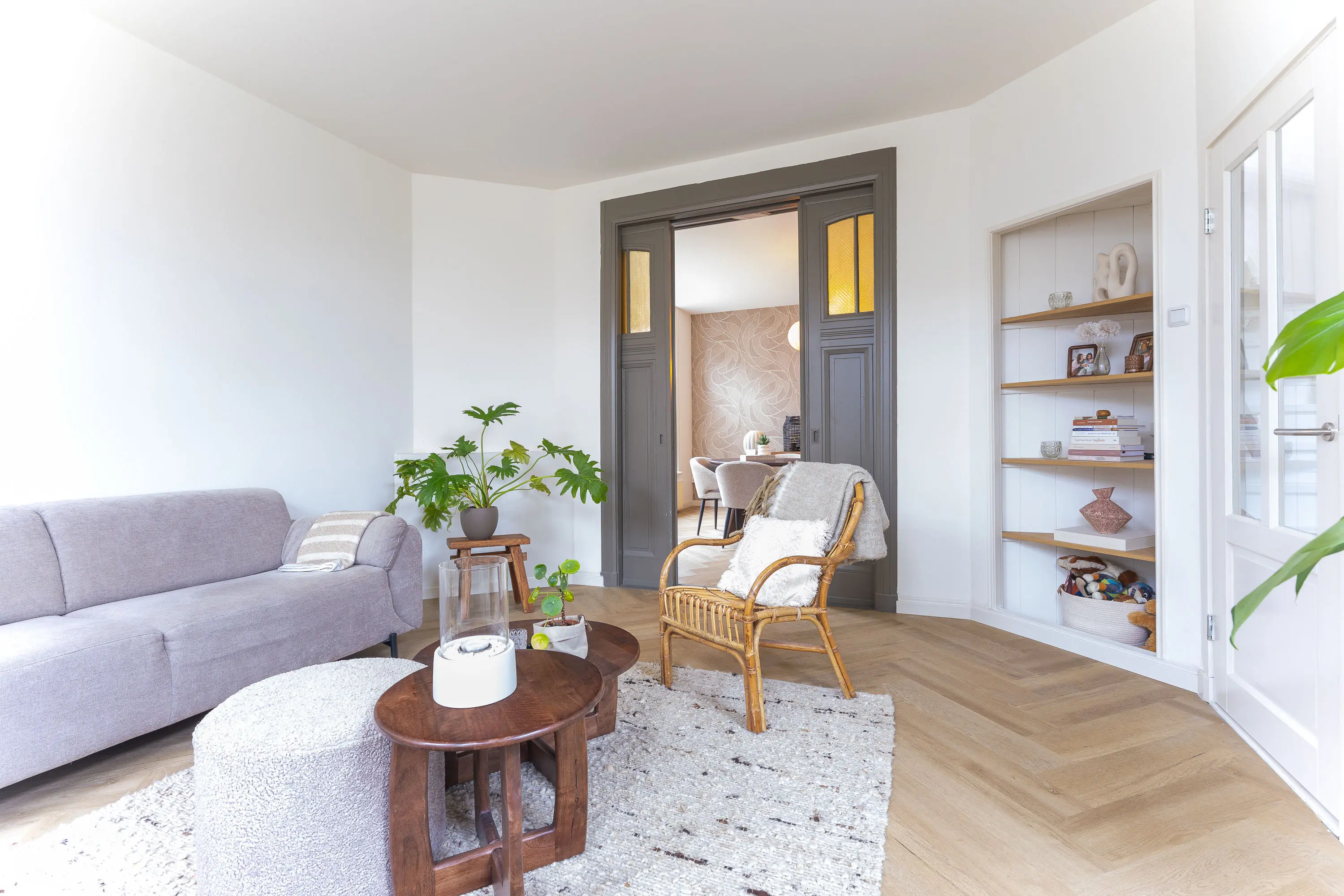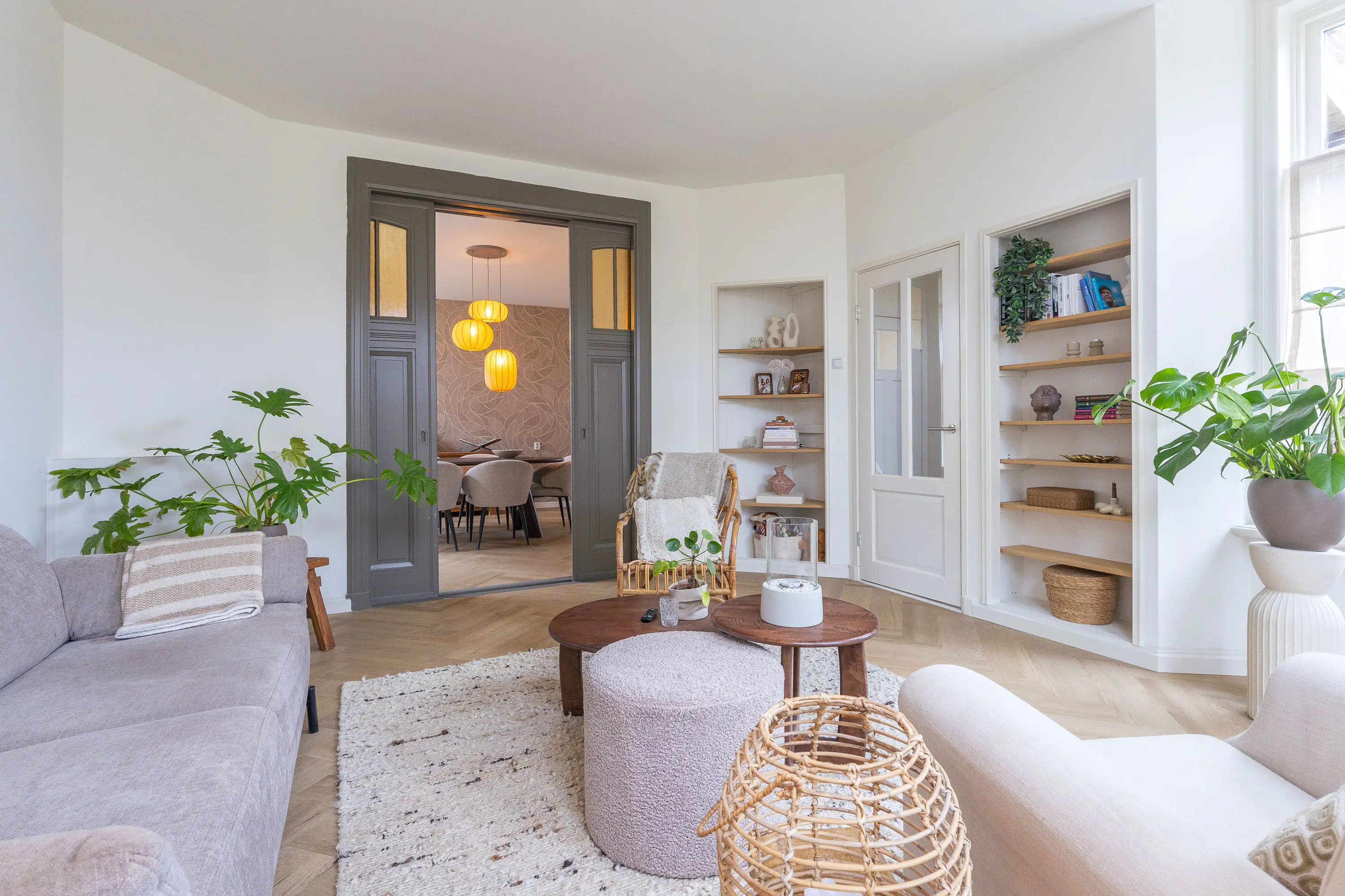 Bij binnenkomst straalt de woning direct warmte en comfort uit. Aan de linkerzijde van de hal bevindt zich de knusse woonkamer, die dankzij de suite deuren eenvoudig kan worden gescheiden. Ideaal voor gezellige avonden of juist een rustige plek.