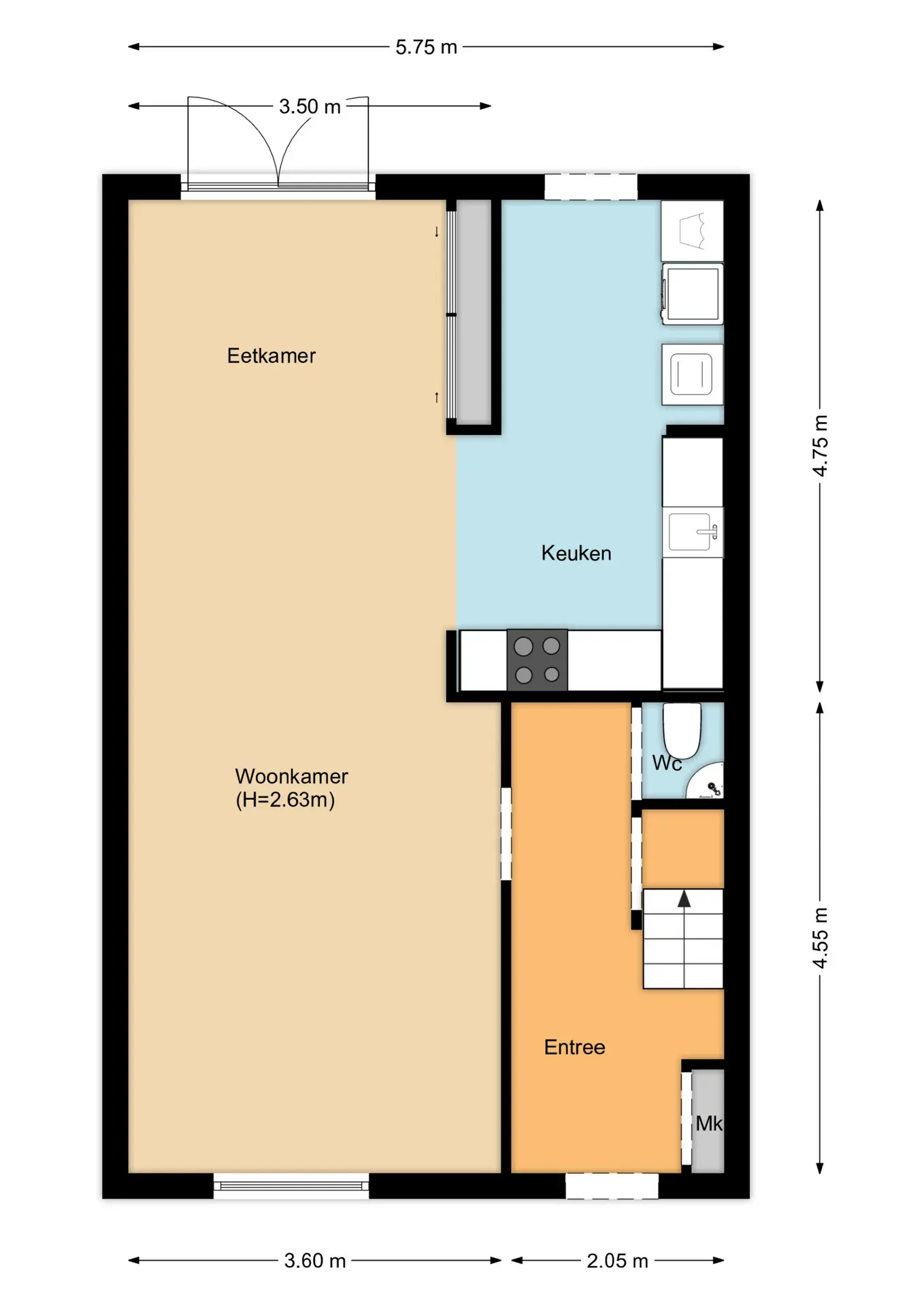 Vanuit de entree krijgt u toegang tot de hal waar zich de trap naar de eerste verdieping, meterkast, toilet met wastafel, en toegang tot de woonkamer zich bevinden.