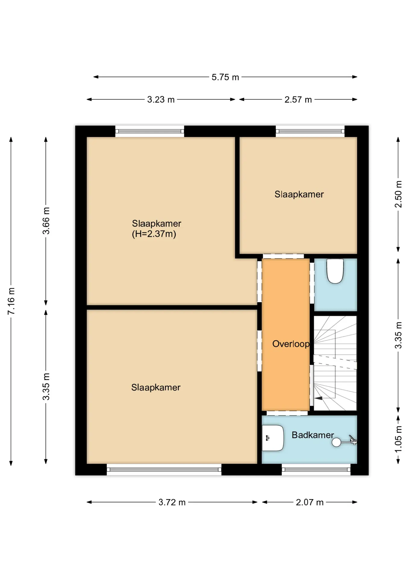 Middels de vaste trap krijgt u toegang tot de overloop, vaste trap naar de tweede verdieping, drie ruime slaapkamers en de badkamer. Op deze verdieping is tevens een apart toilet gerealiseerd.