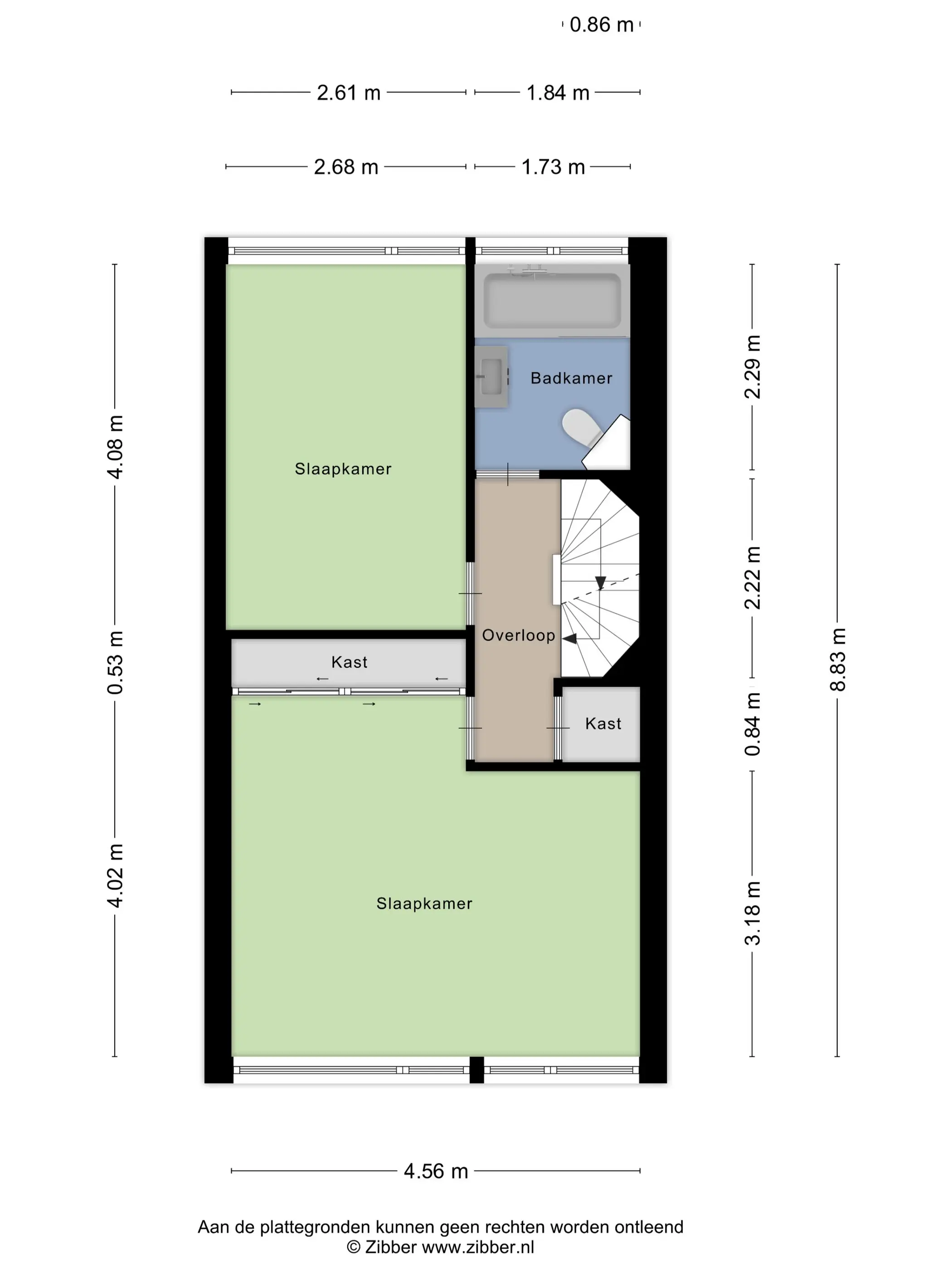 Op de eerste verdieping zijn twee slaapkamers en de badkamer gesitueerd. De slaapkamer aan de voorzijde is extra ruim doordat deze is samengevoegd uit twee kamers en kan eenvoudig weer worden opgesplitst indien gewenst. Aan de achterzijde bevindt zich de tweede slaapkamer.