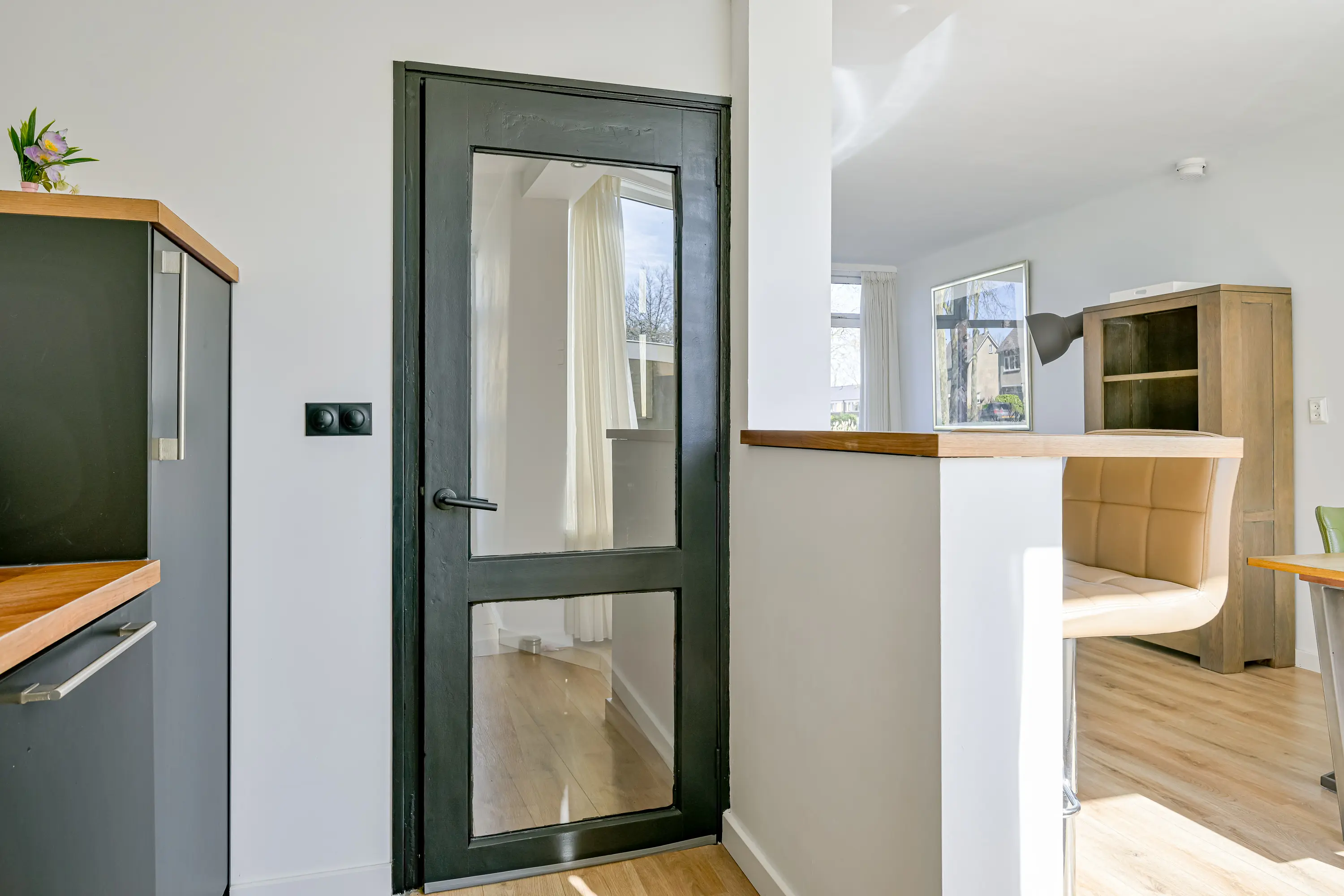 Via de voordeur, de hal met de meterkast en het toilet betreedt u de moderne open keuken met aansluitend de woonkamer. De keuken is in 2020 geplaatst en van alle gemakken voorzien. Denk hierbij aan een vaatwasser, koel-vriescombinatie, hete lucht oven, kookplaat en een afzuigkap. Verder is hier voldoende ruimte om al uw keukengerei in op te bergen. Aansluitend aan de keuken vindt u een prettige bijkeuken met onder andere een opstelplaats voor wasmachine en droger. Aan de voorzijde van de woning bevindt zich een ruim zitgedeelte. Vanuit de woonkamer heeft u een prettig zicht op de voortuin en de waterpartij wat de straat een parkachtige sfeer geeft. De gehele benedenverdieping is voorzien van een moderne laminaatvloer en de wanden zijn allemaal strak afgewerkt met glad stucwerk. Geheel van deze tijd dus!