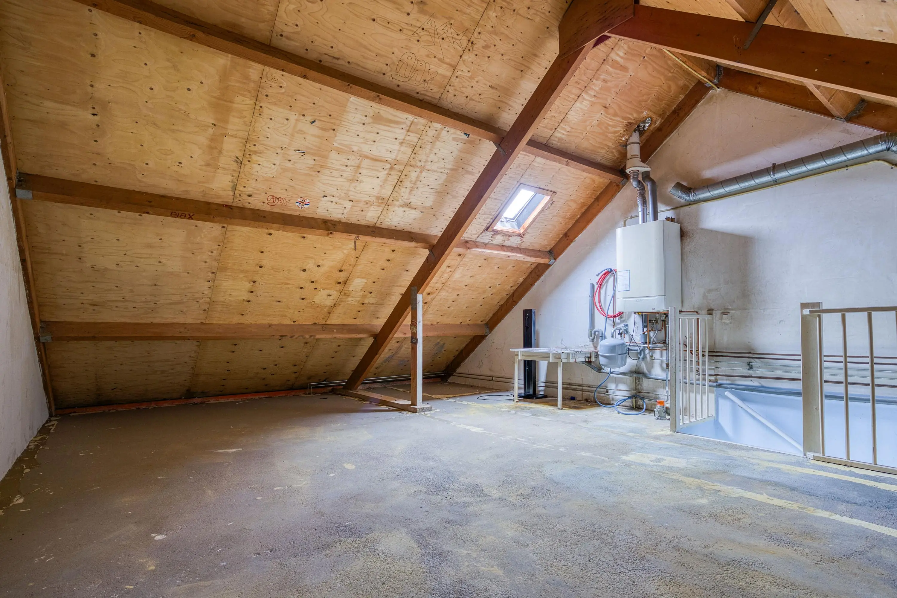 De zolder is meegenomen in het totaal aan vierkante meters woonoppervlakte, maar door de beperkte afmeting van het dakraam wordt deze ruimte formeel niet als woonoppervlakte gerekend.