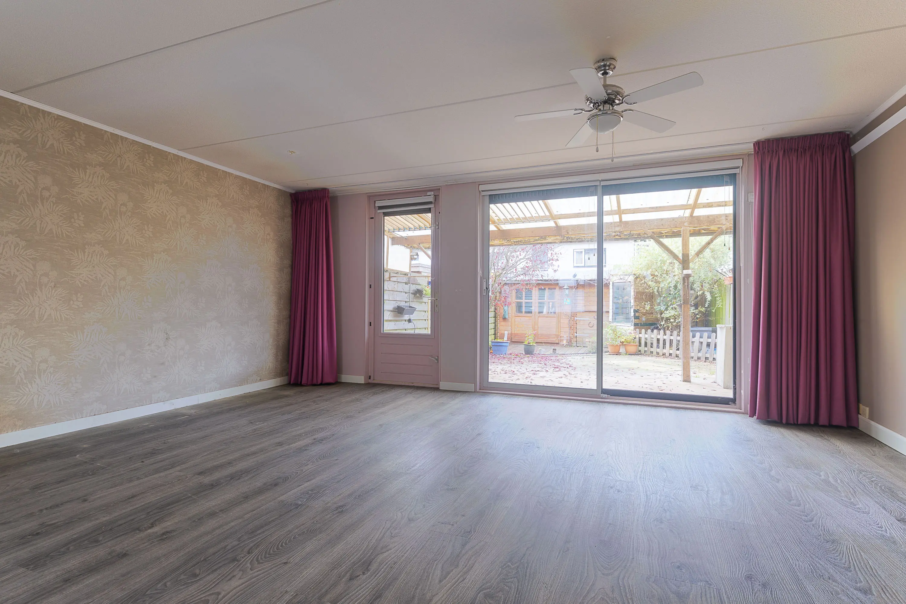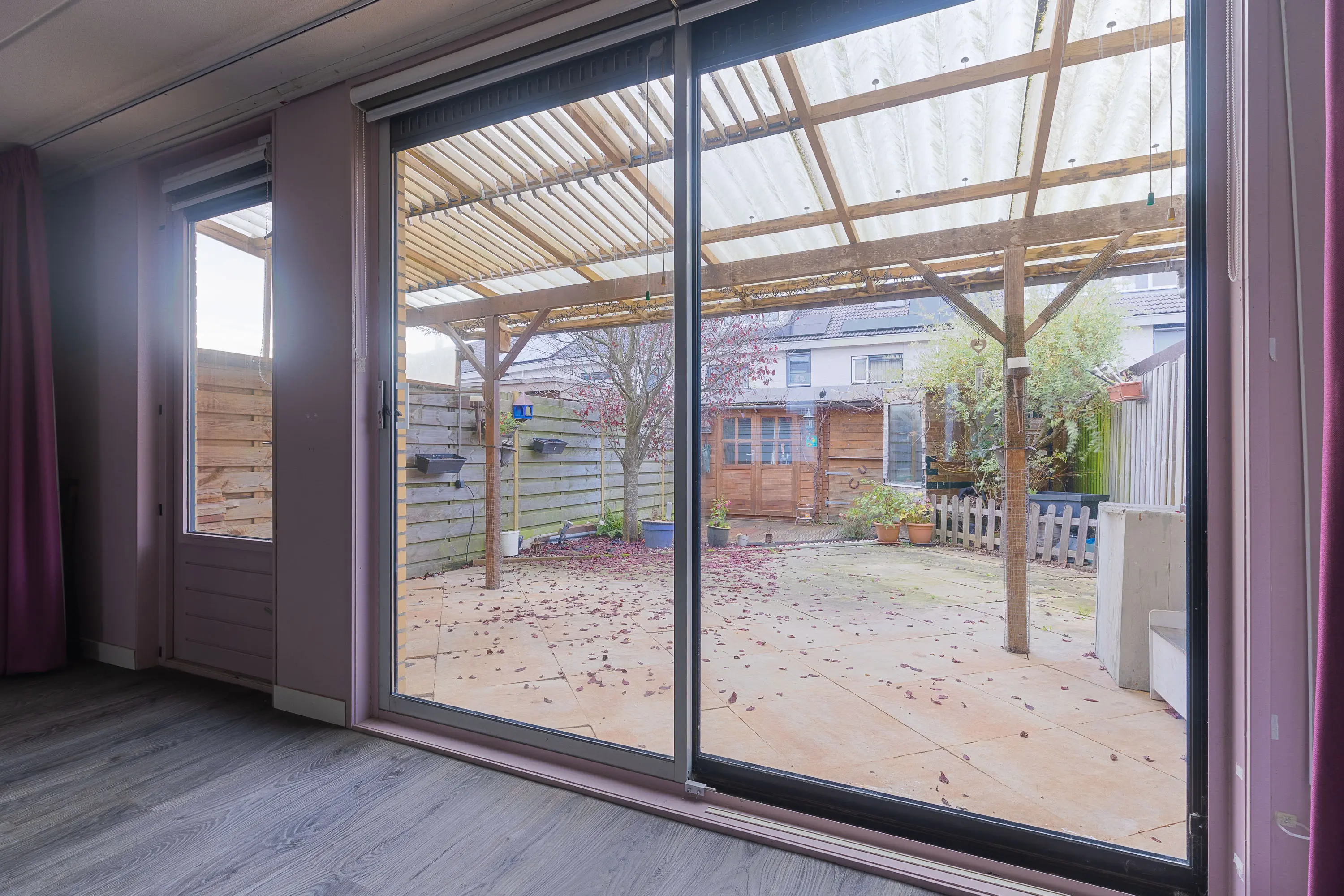 De voortuin is strak betegeld en de achtertuin biedt alles voor buiten genieten. De overkapping aan de woning maakt het mogelijk om beschut buiten te zitten. Achterin vindt u een houten berging en een tweede berging met toegang tot de achtergelegen steeg, ideaal voor fietsen, scooters of tuinspullen.