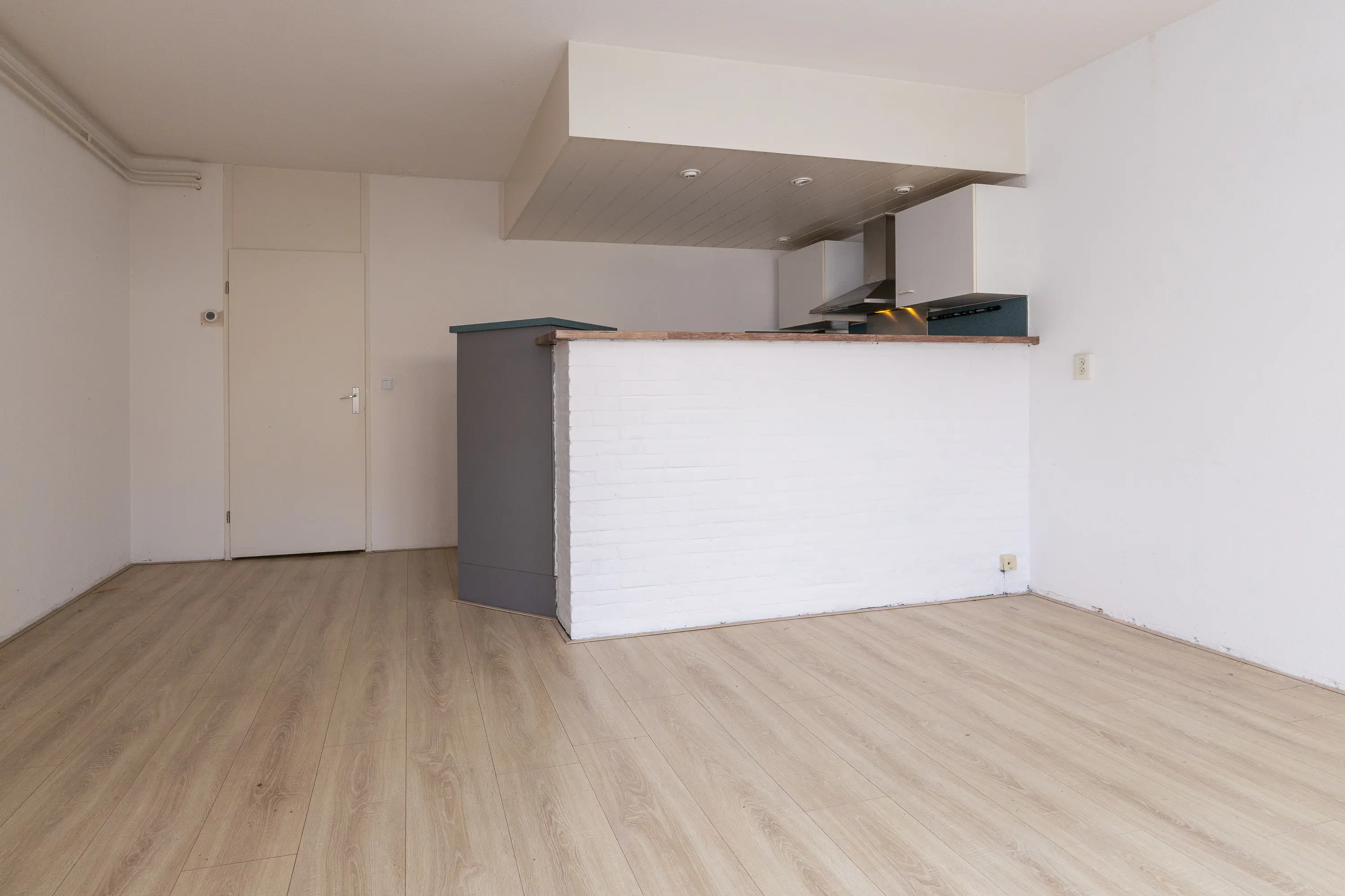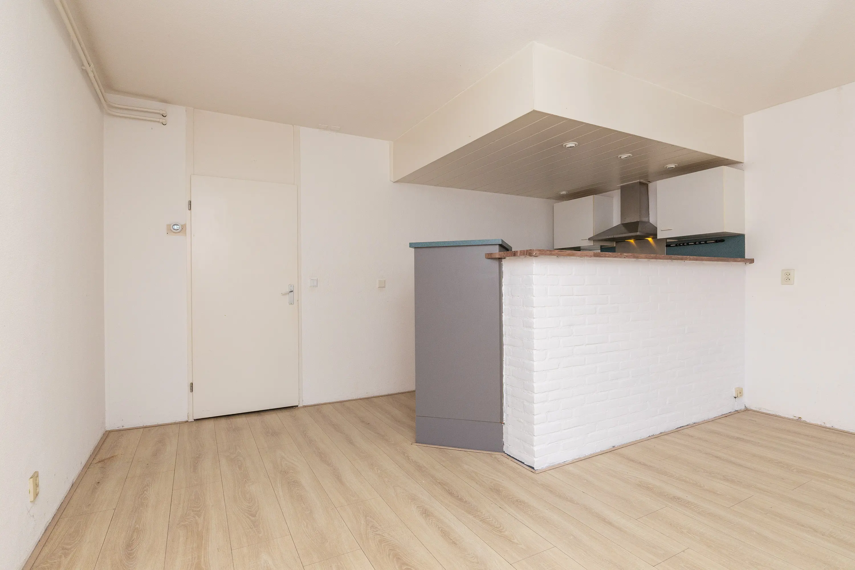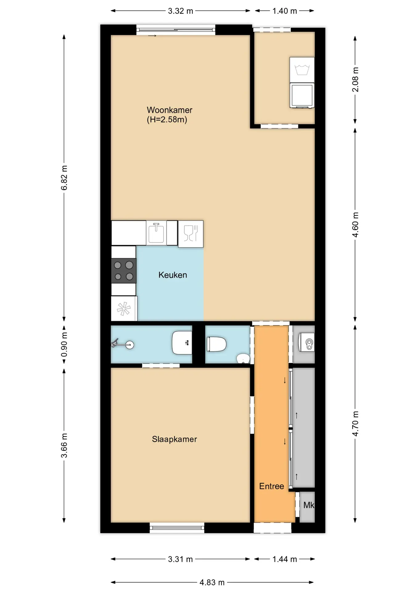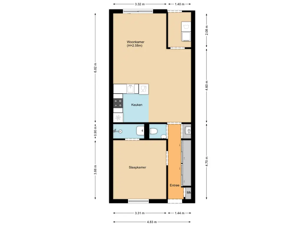 Entree, slaapkamer aan de linkerzijde met aansluitend de badkamer voorzien van een douche en wastafelmeubel. Het toilet is in de hal geplaatst. Via de lange hal bereik je de woonkamer met half open keuken. Aan de zijkant van de woonkamer is een ruimte gecreëerd voor de wasmachine. De tuin is via de woonkamer bereikbaar.