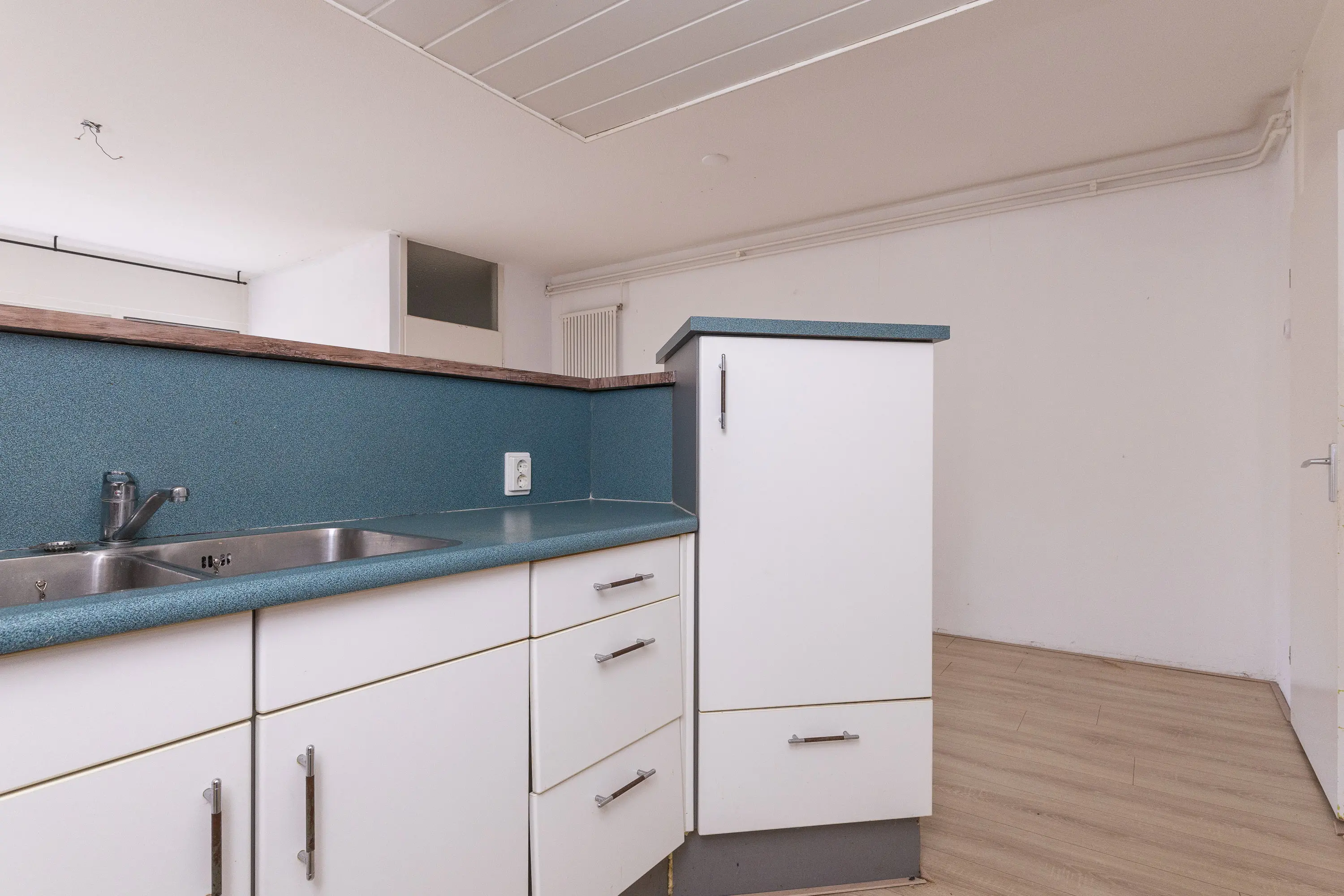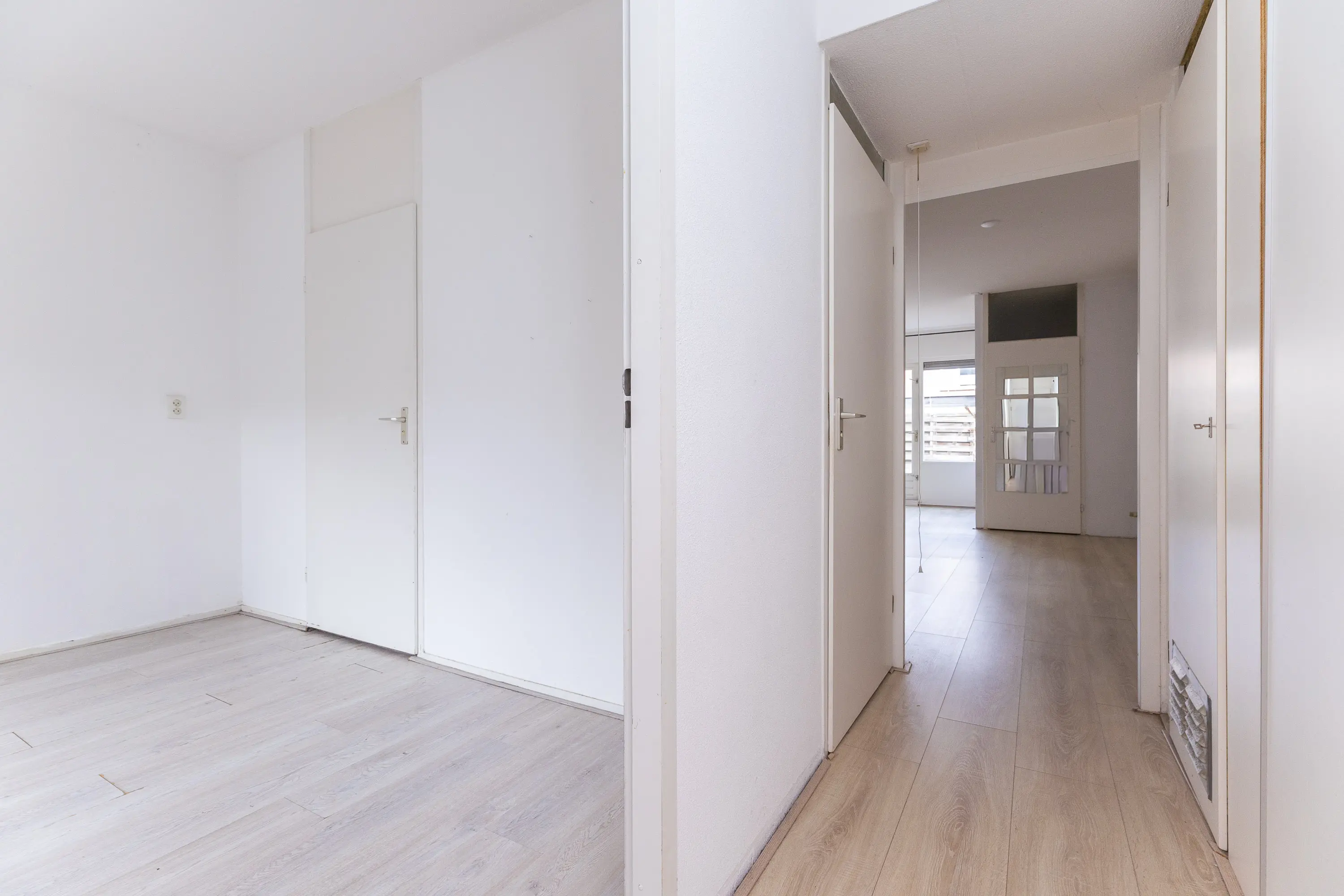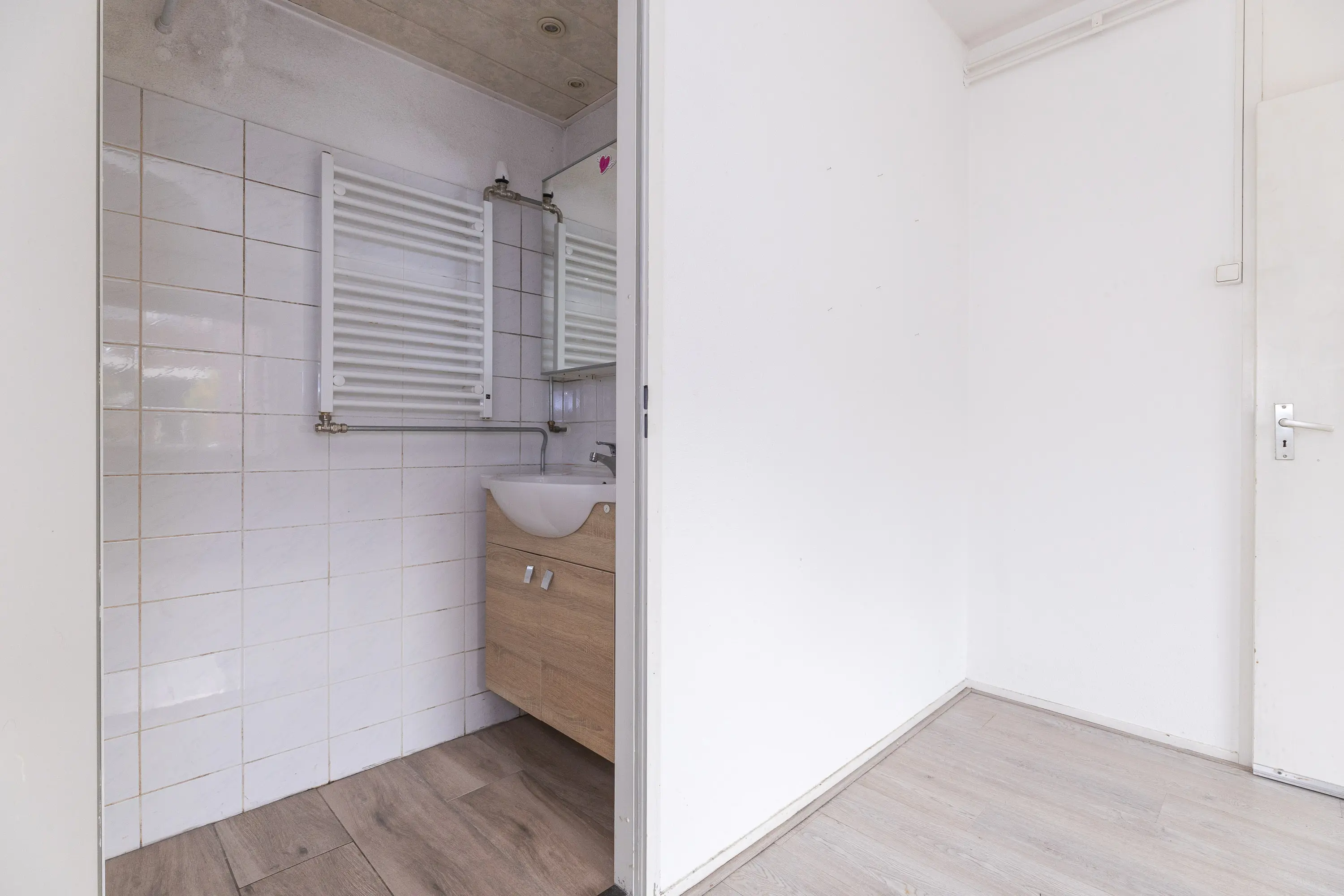 Entree, slaapkamer aan de linkerzijde met aansluitend de badkamer voorzien van een douche en wastafelmeubel. Het toilet is in de hal geplaatst. Via de lange hal bereik je de woonkamer met half open keuken. Aan de zijkant van de woonkamer is een ruimte gecreëerd voor de wasmachine. De tuin is via de woonkamer bereikbaar.