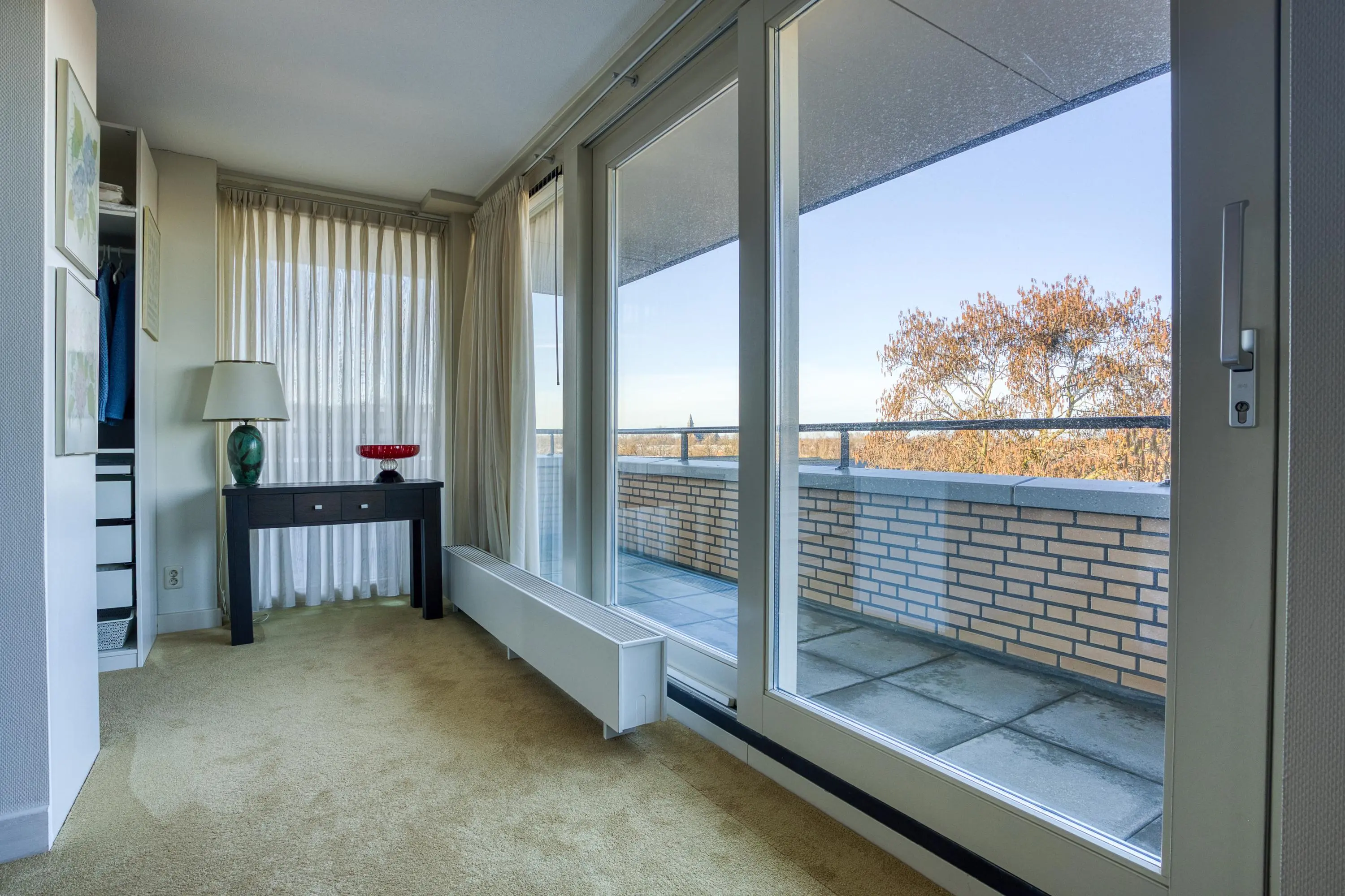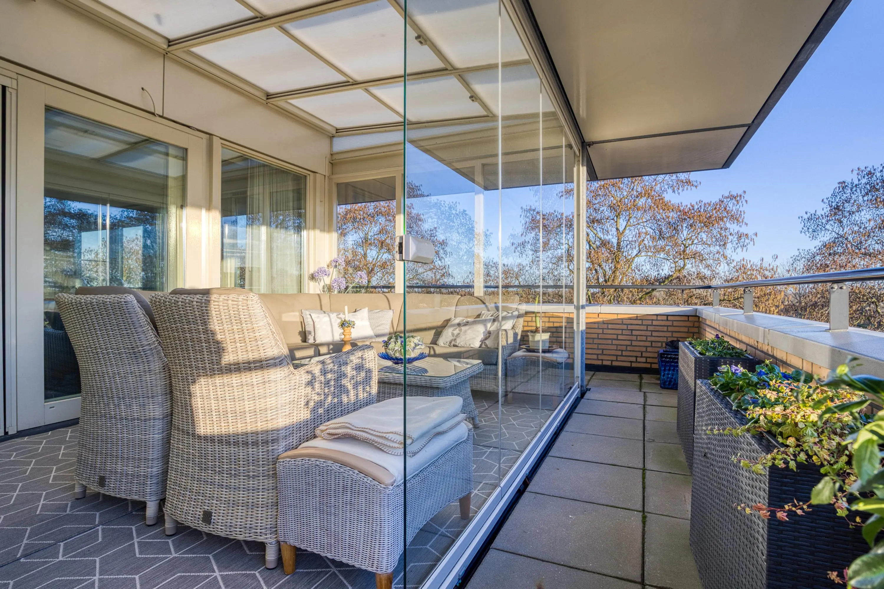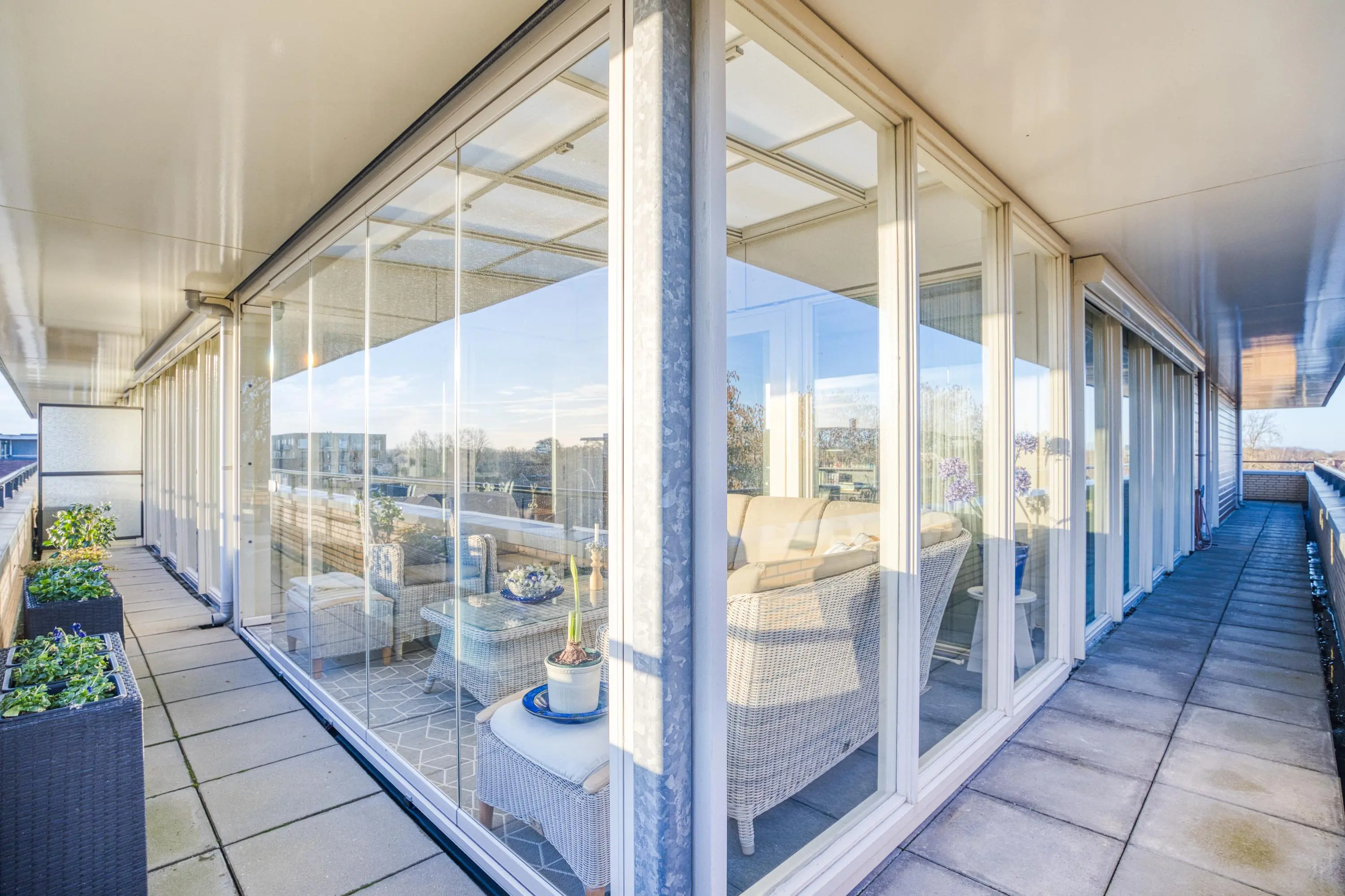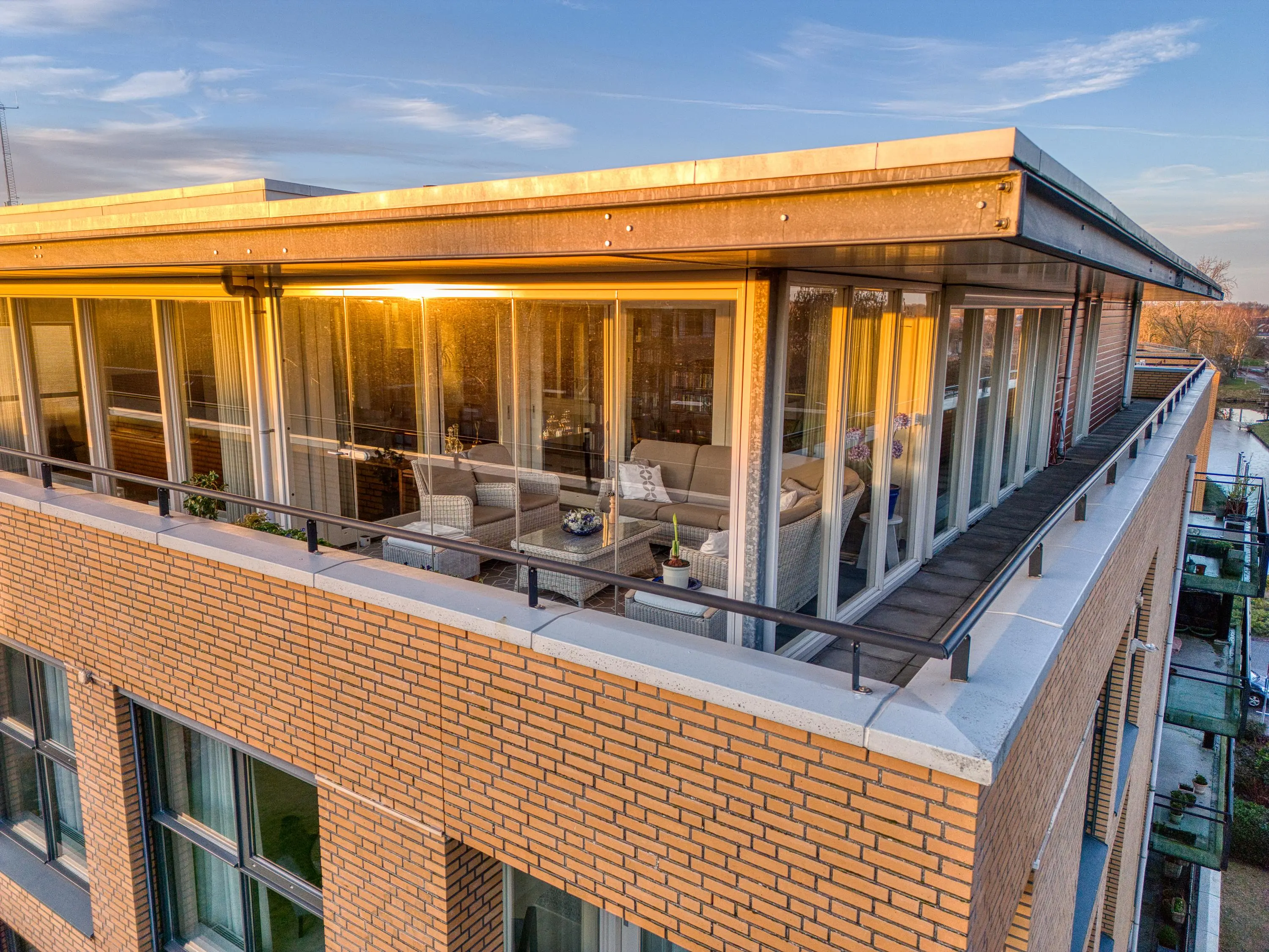 Het buitenterras is maar liefst zo’n 14 m2 (op het Zuid/Zuid/Oost) is er één van ongekend niveau; het geheel kan worden afgesloten door een inklapbare glazen wand en het eveneens te openen dak. Het hele jaar door kunt u daardoor op dit fijne plekje buiten genieten van het fraaie uitzicht. Daarnaast zijn bijna alle ruimtes van het appartement buitenom via een balkon bereikbaar en zijn er rondom de woning diverse elektrisch bedienbare screens geplaatst.