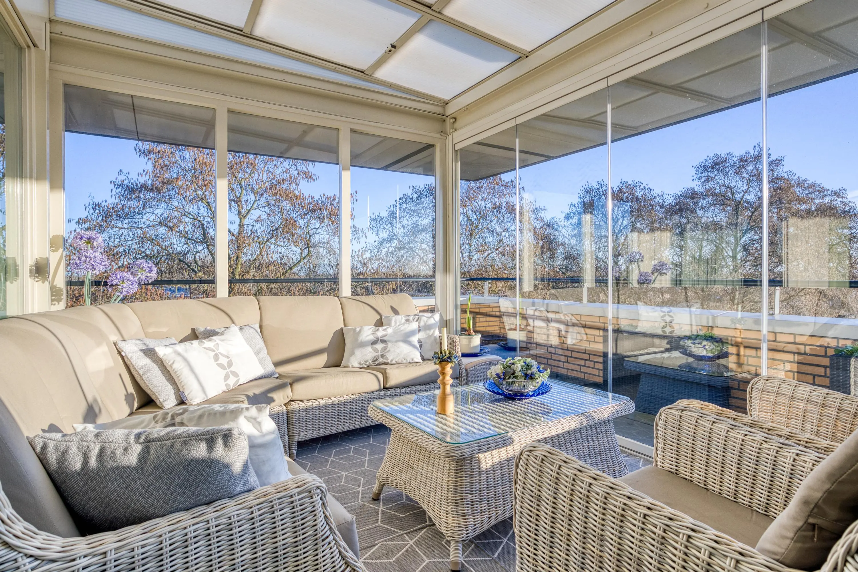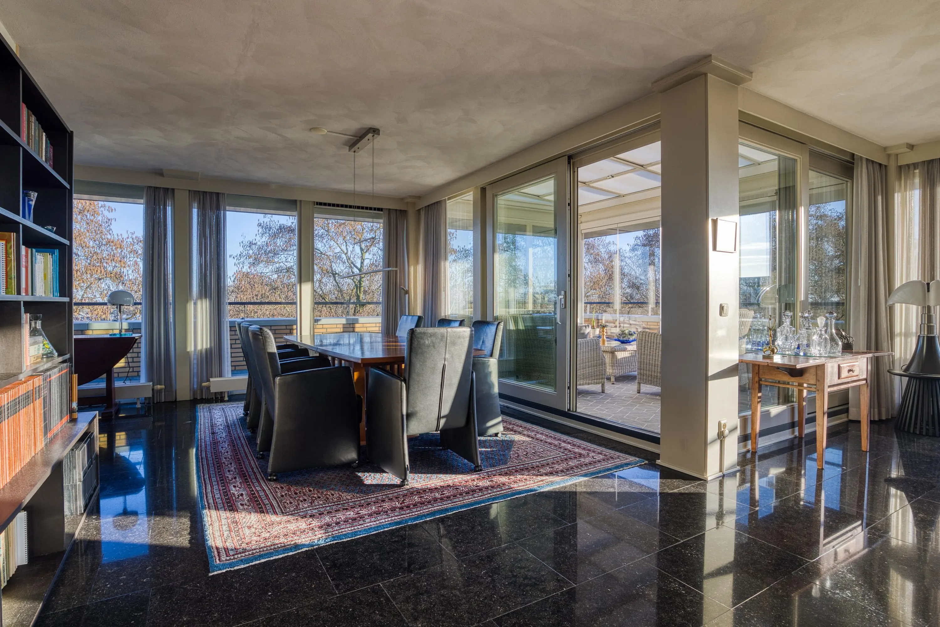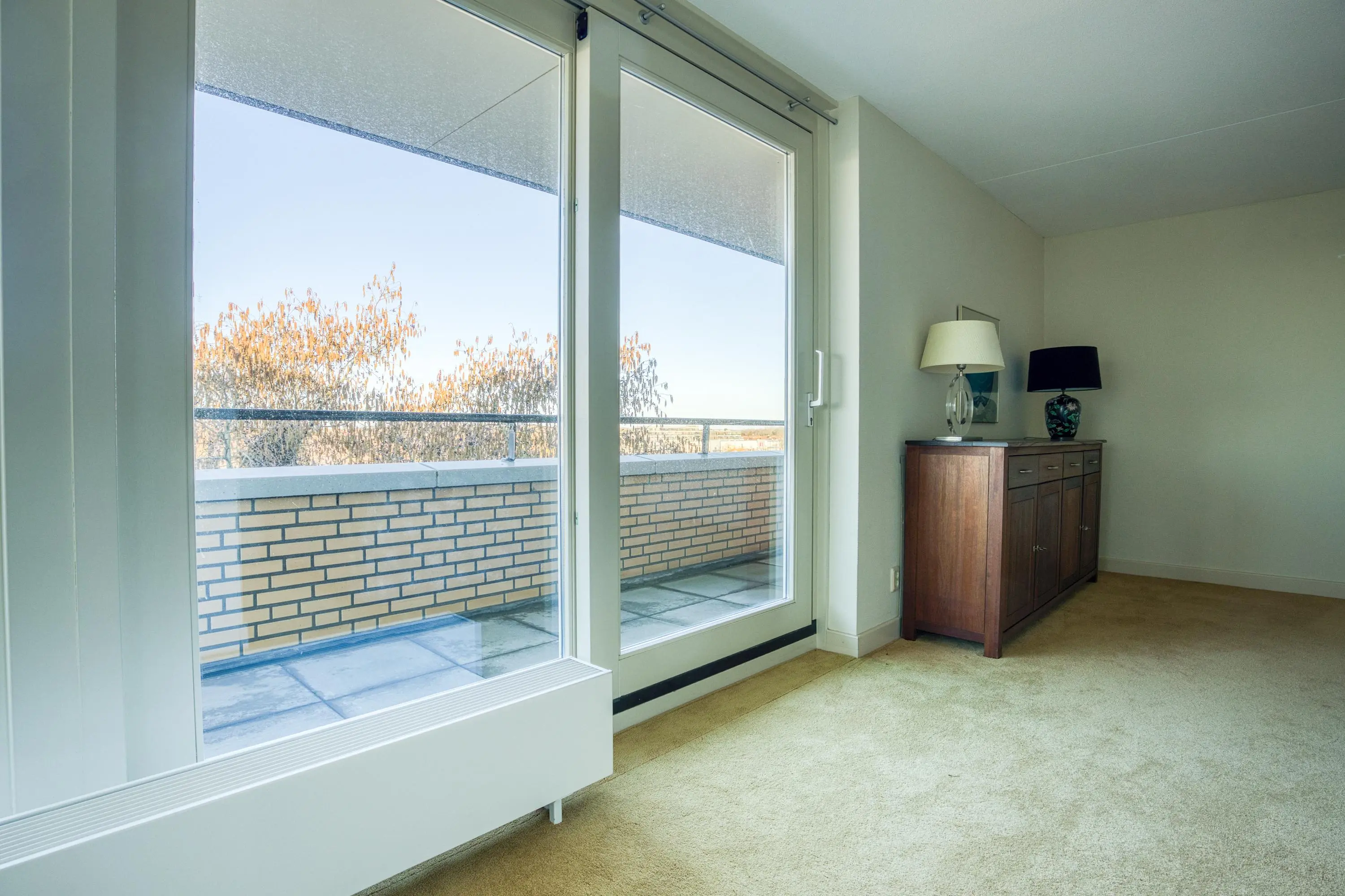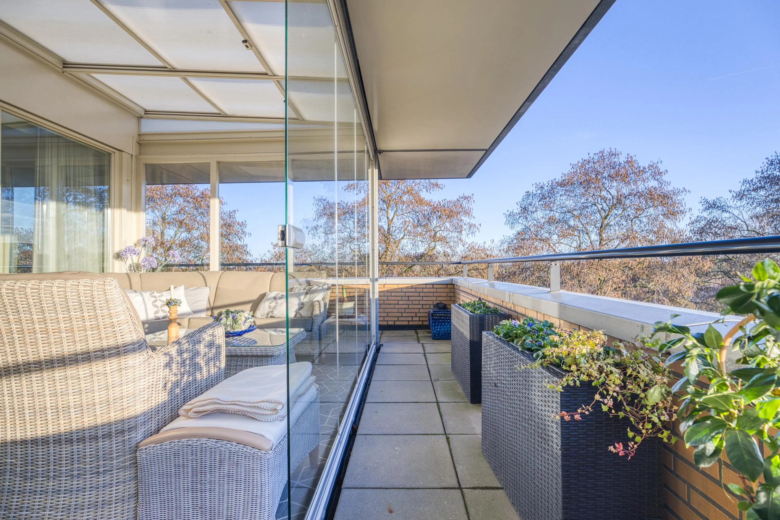 Het buitenterras is maar liefst zo’n 14 m2 (op het Zuid/Zuid/Oost) is er één van ongekend niveau; het geheel kan worden afgesloten door een inklapbare glazen wand en het eveneens te openen dak. Het hele jaar door kunt u daardoor op dit fijne plekje buiten genieten van het fraaie uitzicht. Daarnaast zijn bijna alle ruimtes van het appartement buitenom via een balkon bereikbaar en zijn er rondom de woning diverse elektrisch bedienbare screens geplaatst.