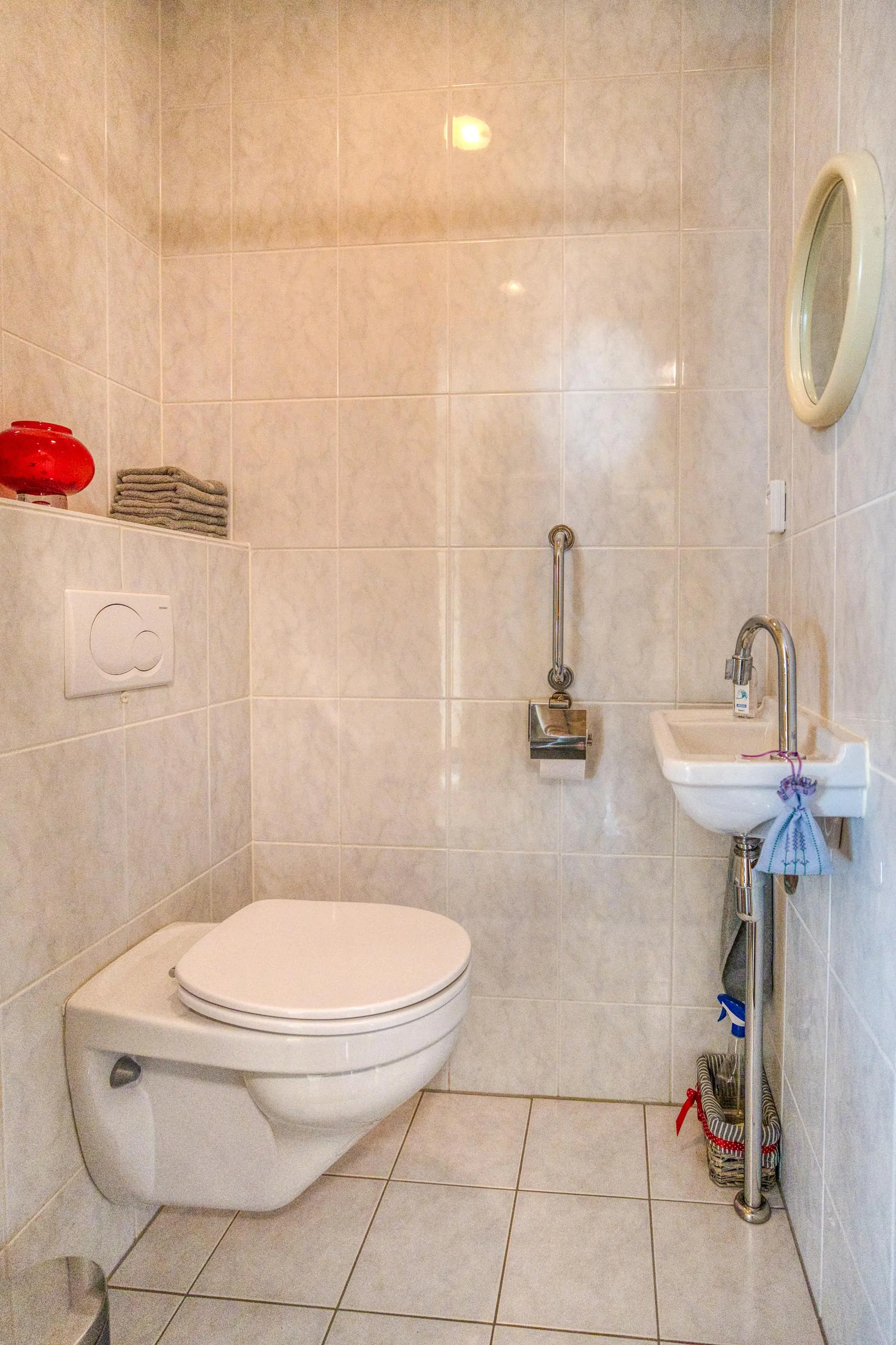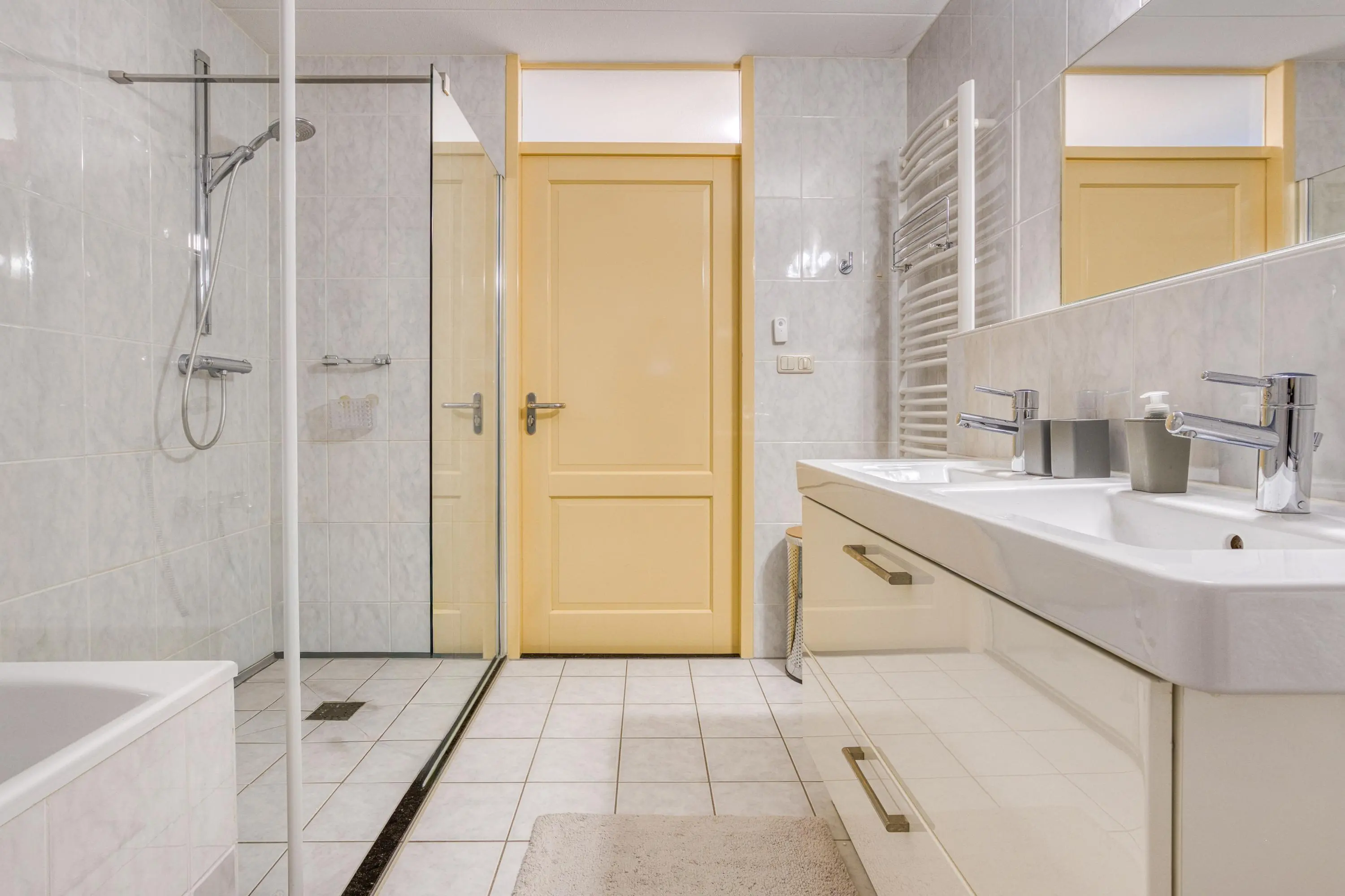 De badkamer is uitgevoerd in fijne lichte kleuren en voorzien van ligbad, inloopdouche, badkamermeubel met dubbele wastafel, designradiator en een wandcloset. In de hal treft u een 2e, separate toiletruimte.
