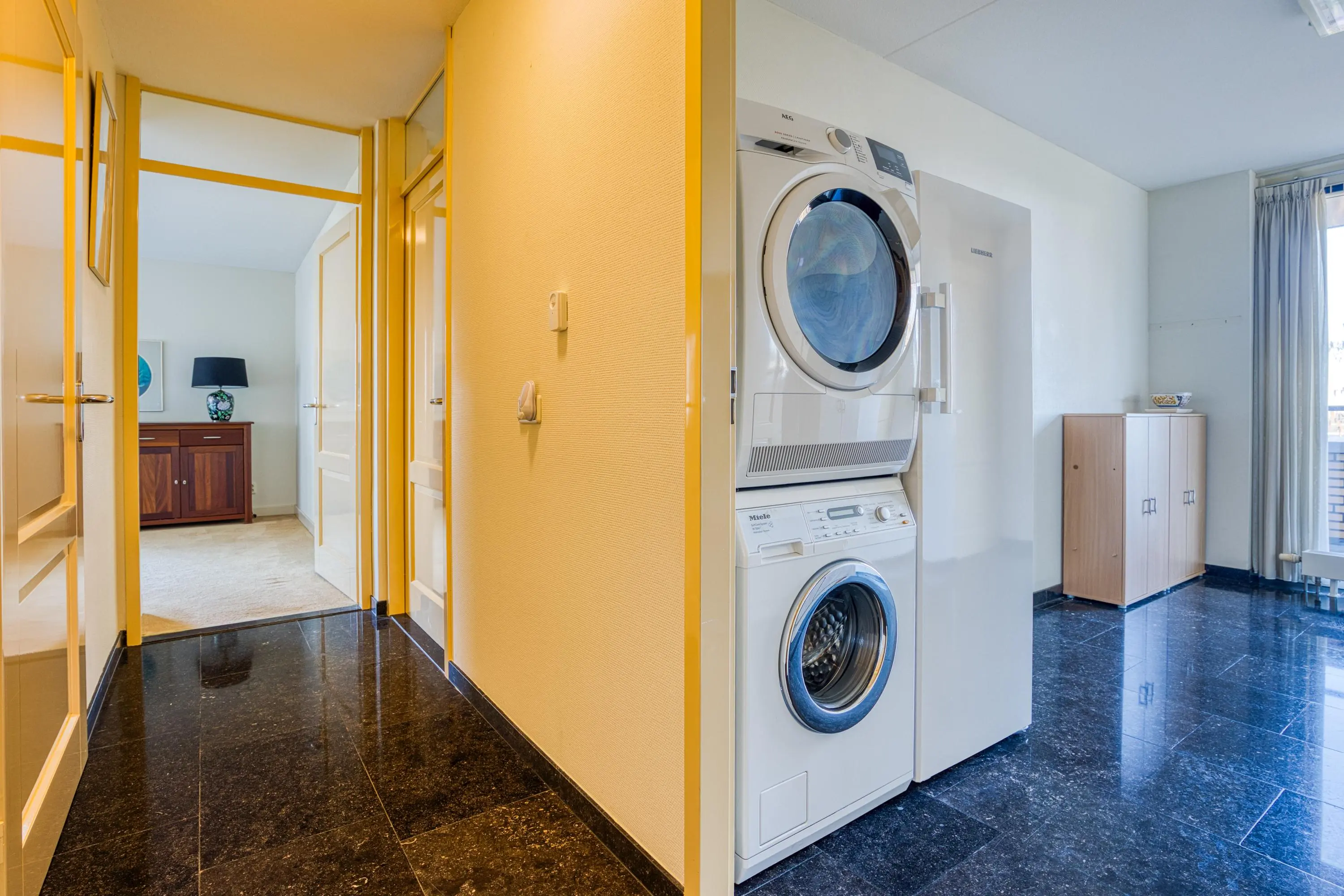 Via een tag biedt de beveiligde entree op de begane grond, u toegang om met lift (of trap) de 5e verdieping te bereiken naar dit penthouse. Bij binnenkomst in de royale hal valt direct de enorme woonruimte op.