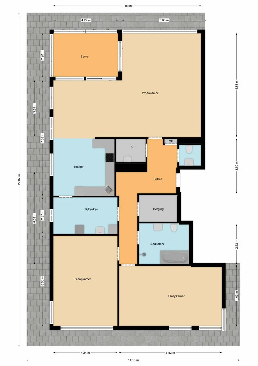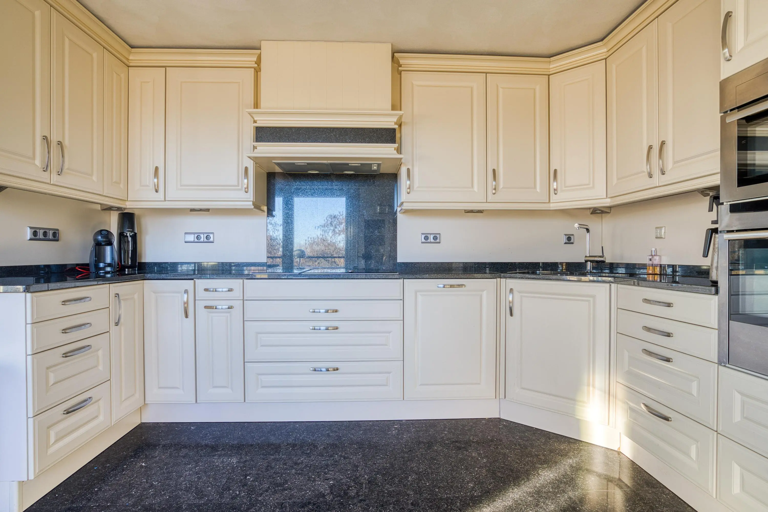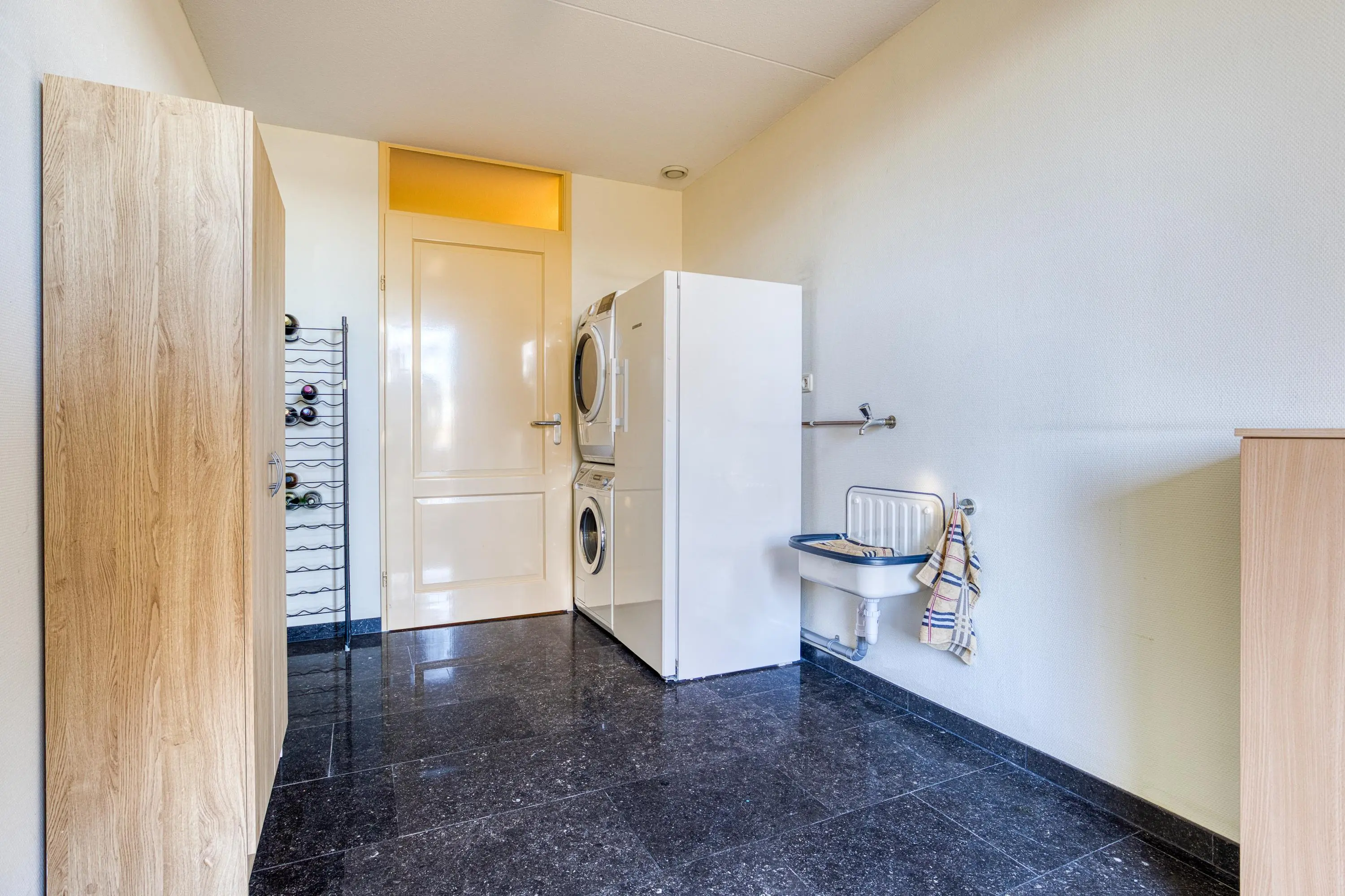 Via de keuken die werkelijk van alle luxe gemakken is voorzien (o.a. natuurstenen aanrichtblad, inductiekookplaat, vaatwasmachine, combi-oven), is ook de bijkeuken bereikbaar welke is voorzien van een uitstortgootsteen en ruimte voor de wasmachine en droger.