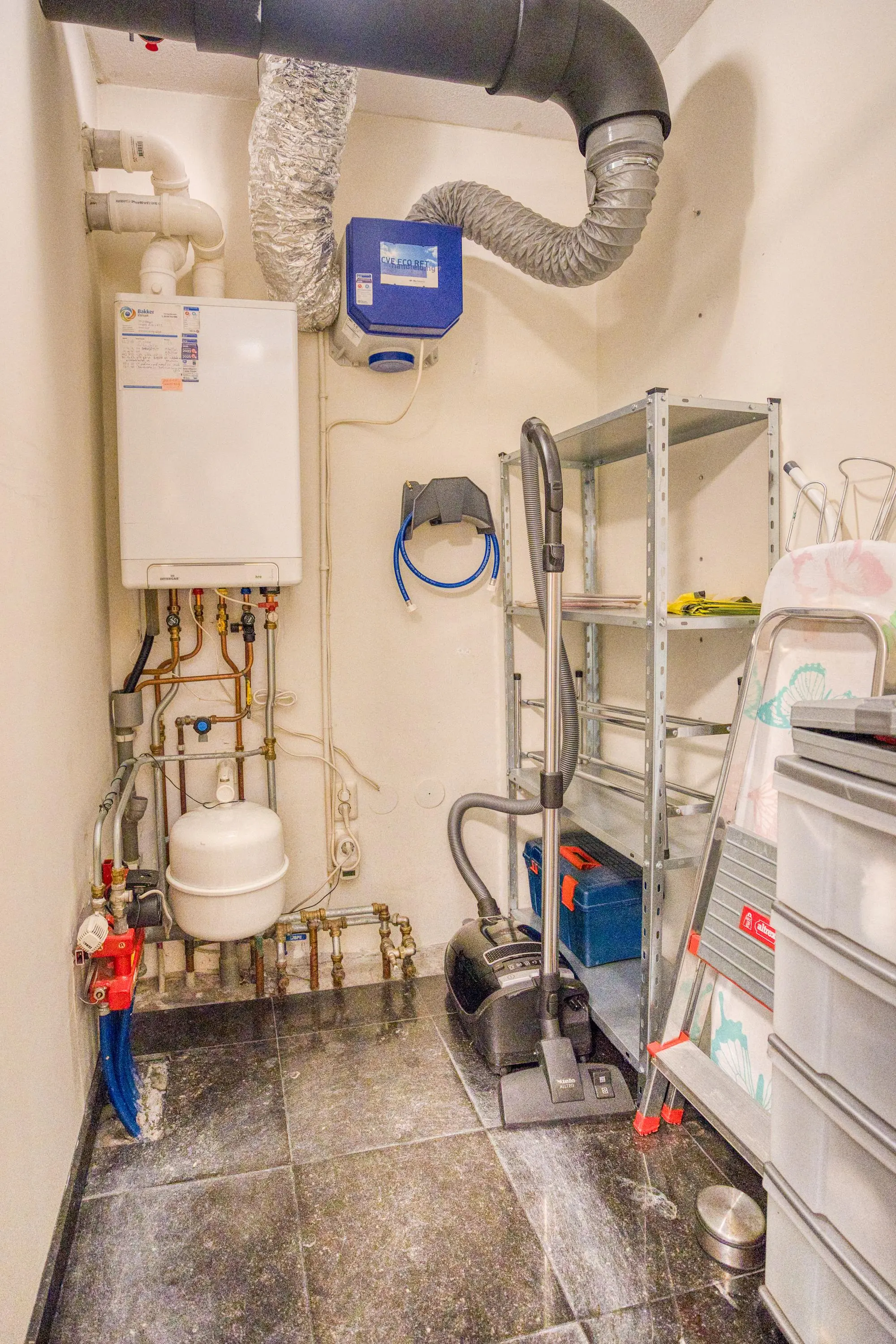 De C.V. ketel bevindt zich samen met de M.V.-unit in de technische ruimte met bovendien extra bergruimte.
