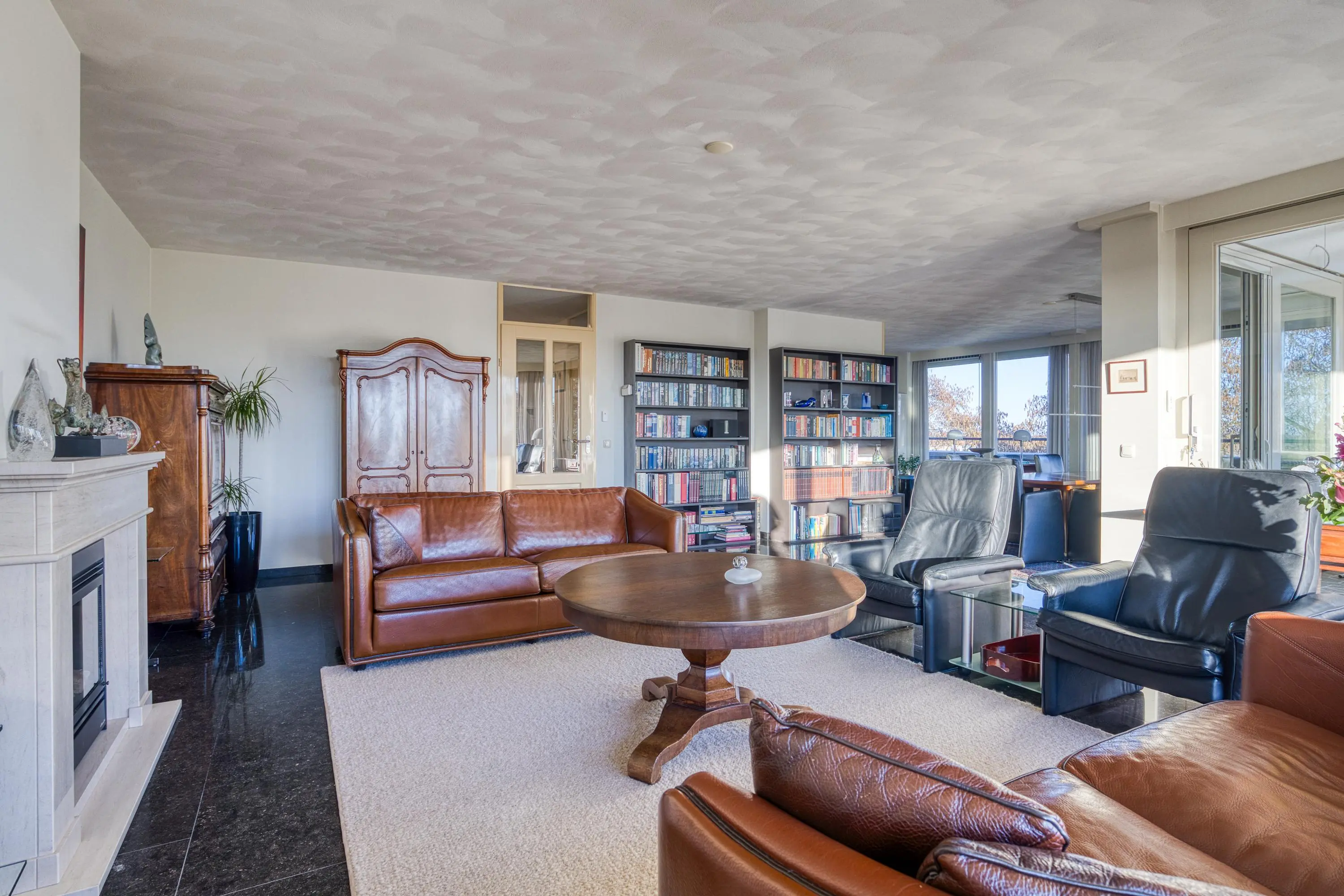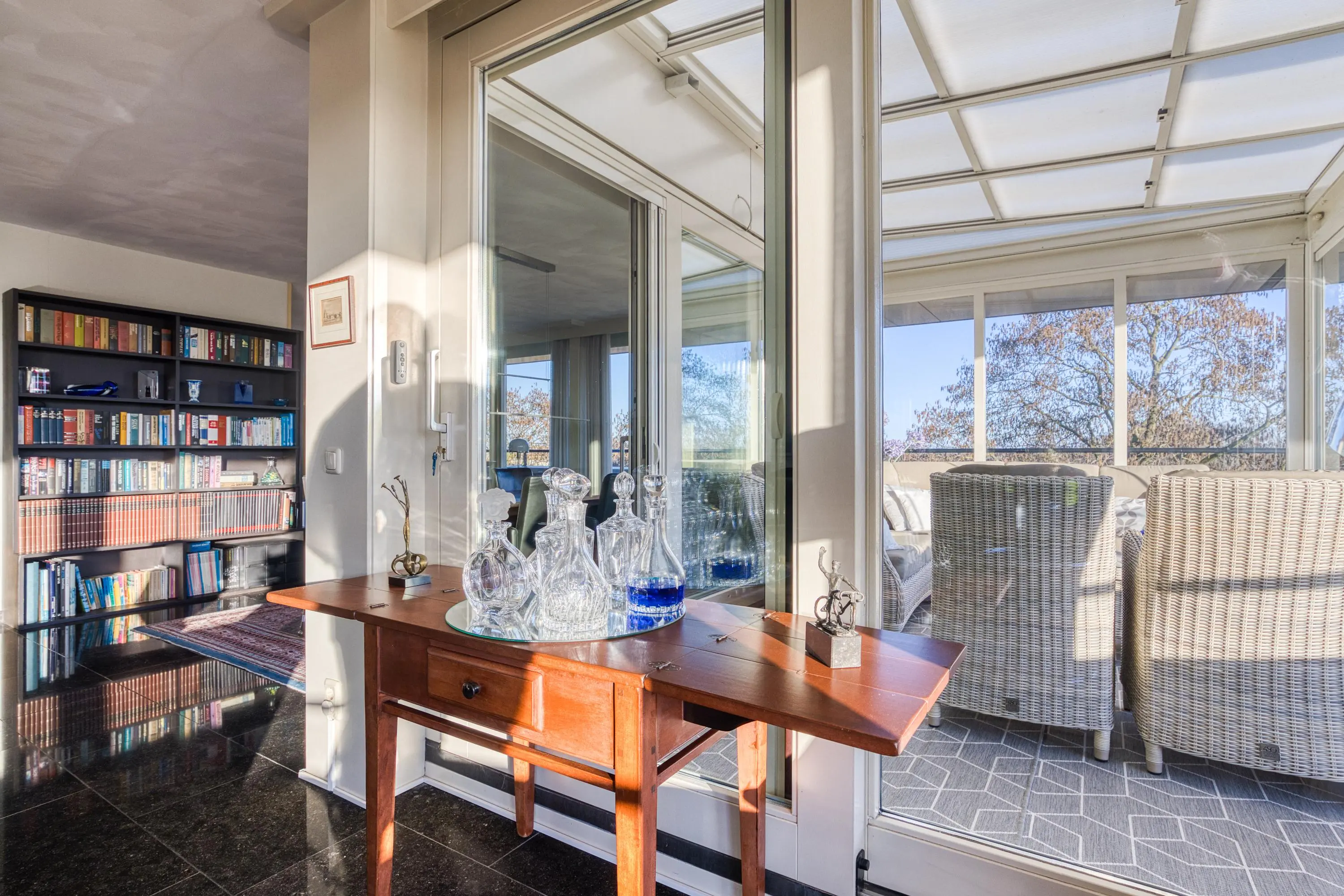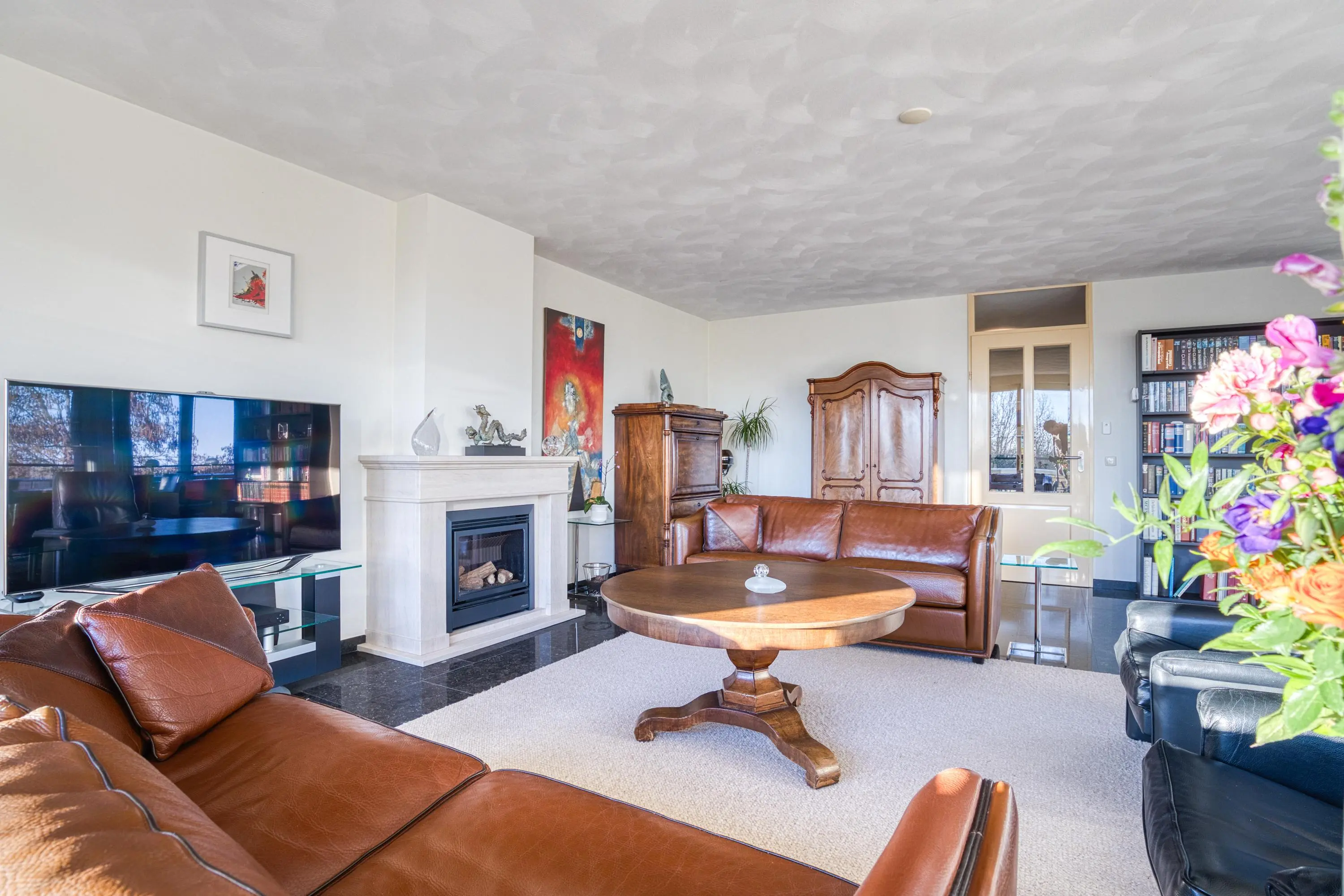 De woonkamer is een heerlijke plek om te vertoeven, niet in de laatste plaats door de ruimte en de gigantische raampartij die u een fenomenaal uitzicht biedt en zorgt voor veel lichtinval. De stijlvolle gashaard, de natuurstenen vloer, strak afgewerkte muren en plafonds zorgen voor een warme uitstraling.