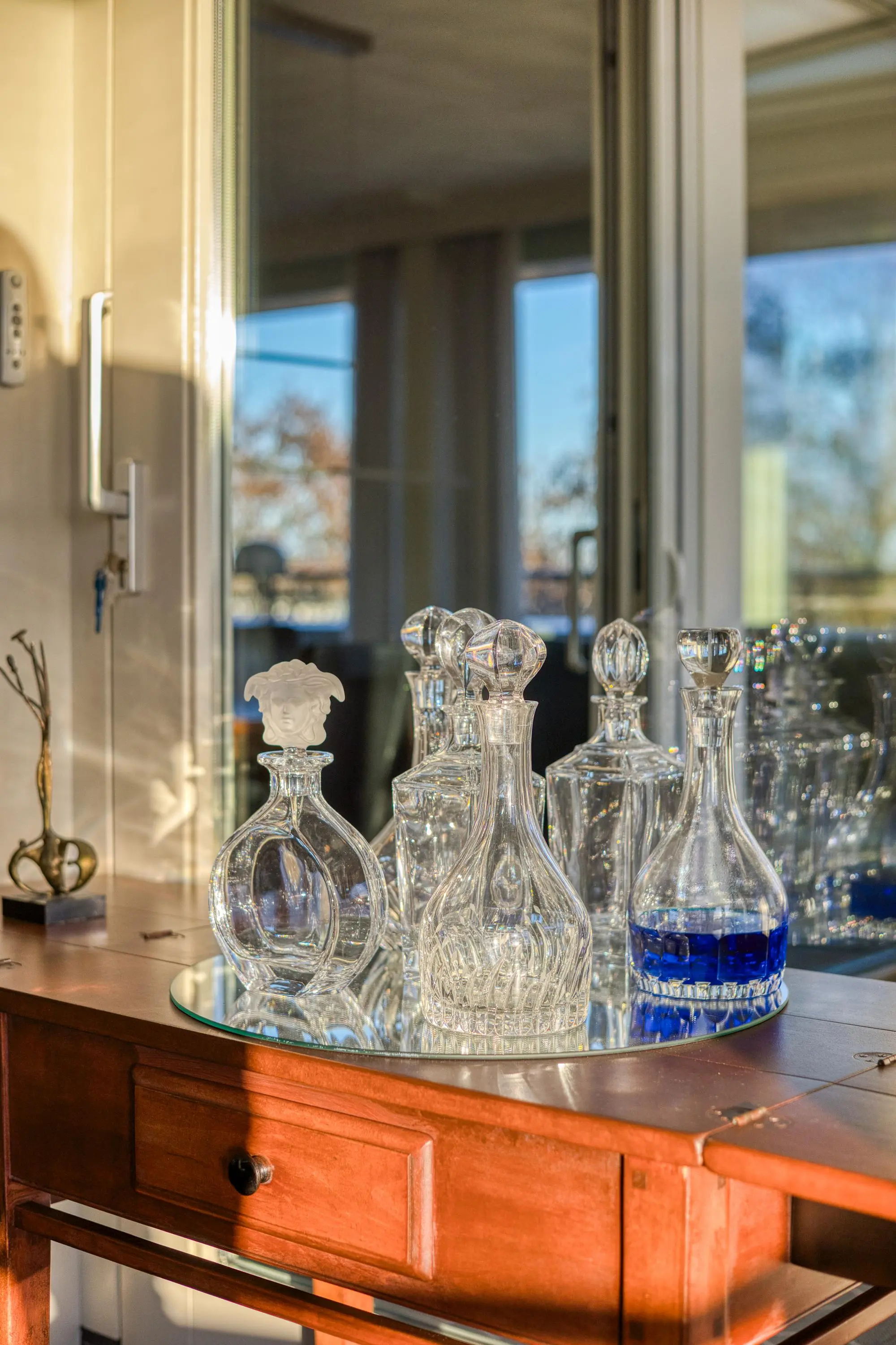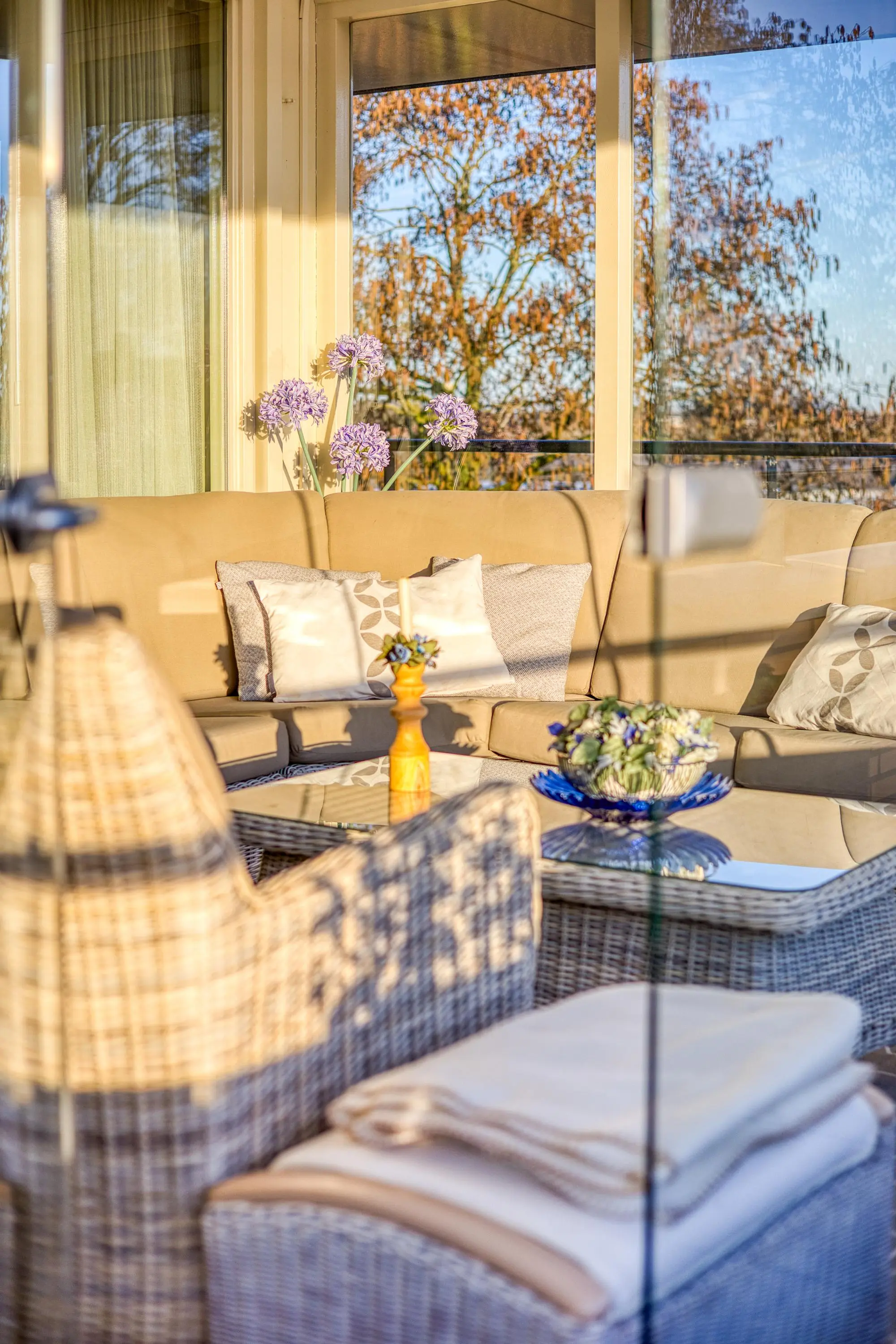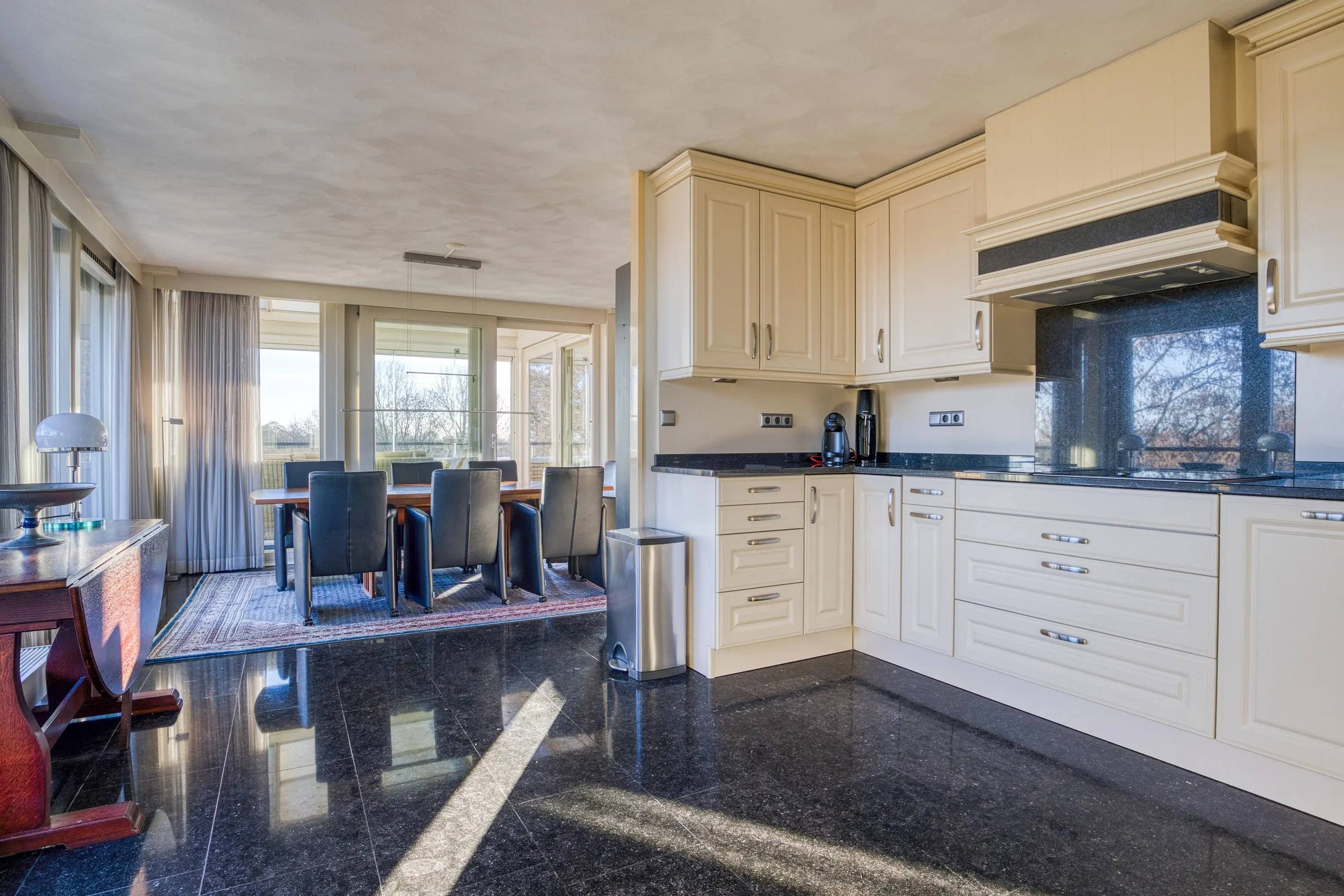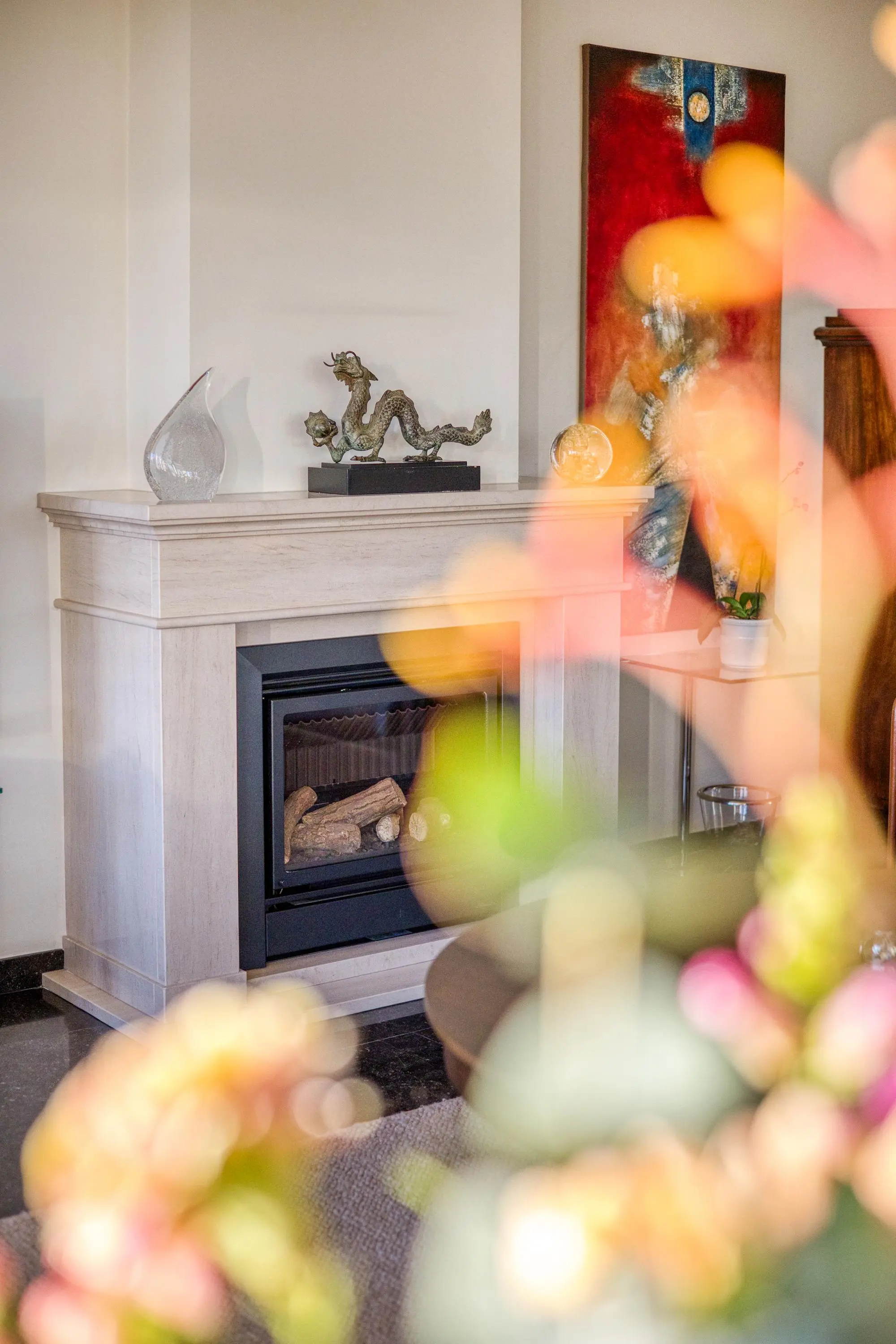De woonkamer is een heerlijke plek om te vertoeven, niet in de laatste plaats door de ruimte en de gigantische raampartij die u een fenomenaal uitzicht biedt en zorgt voor veel lichtinval. De stijlvolle gashaard, de natuurstenen vloer, strak afgewerkte muren en plafonds zorgen voor een warme uitstraling.