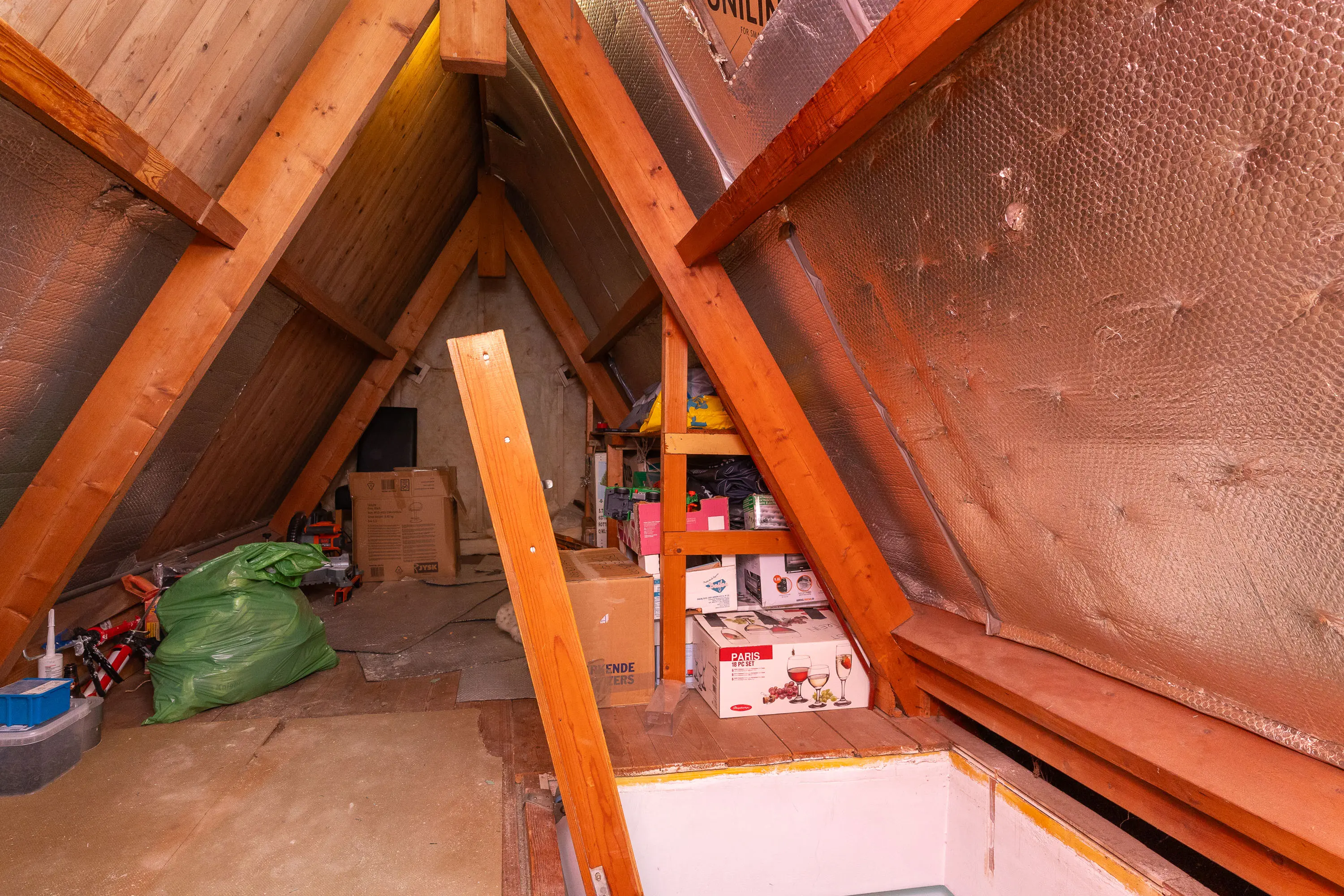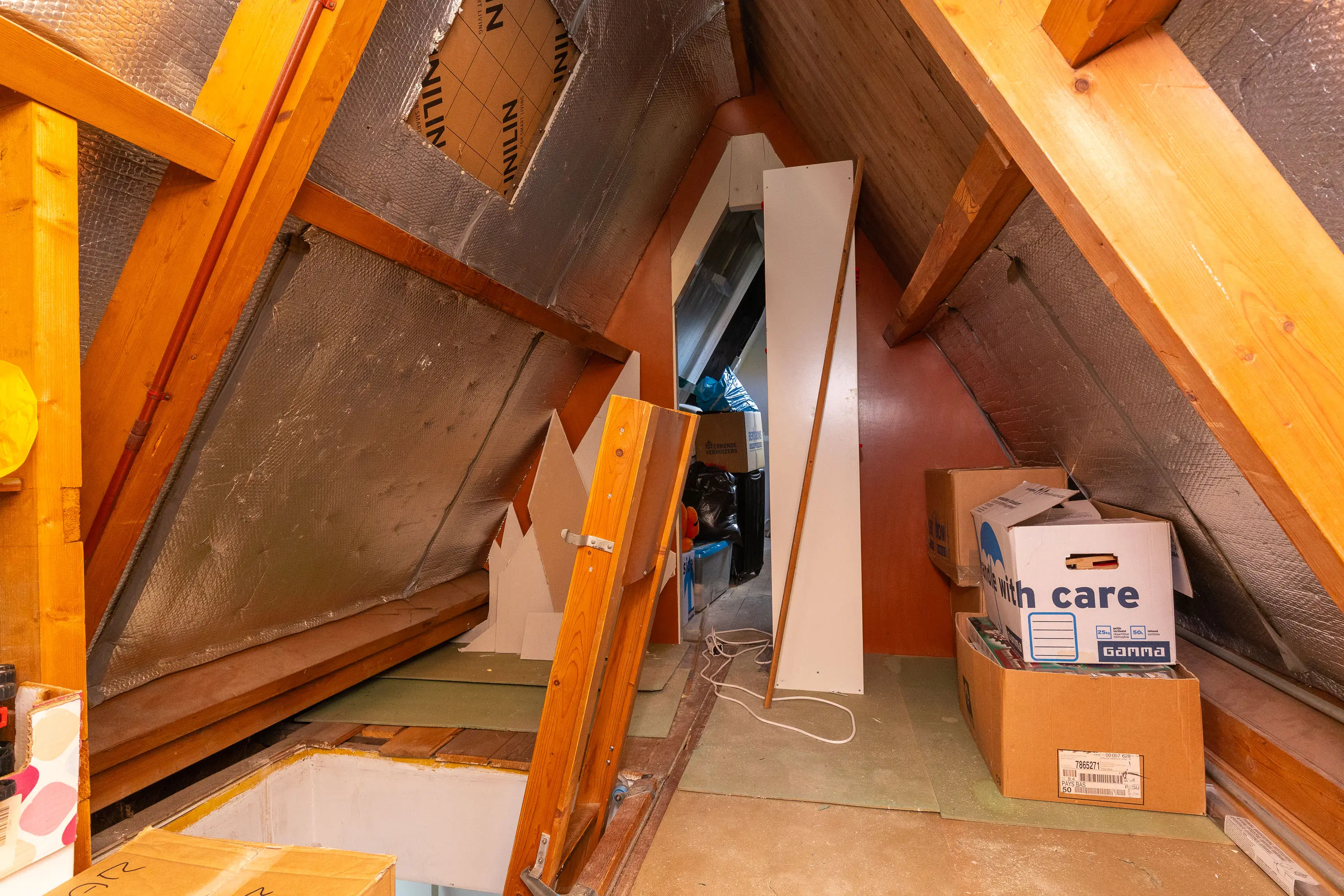 Via een vlizotrap bereik je de opbergzolder. Perfect voor het opbergen van seizoensspullen, koffers of gereedschap — extra bergruimte is altijd handig!