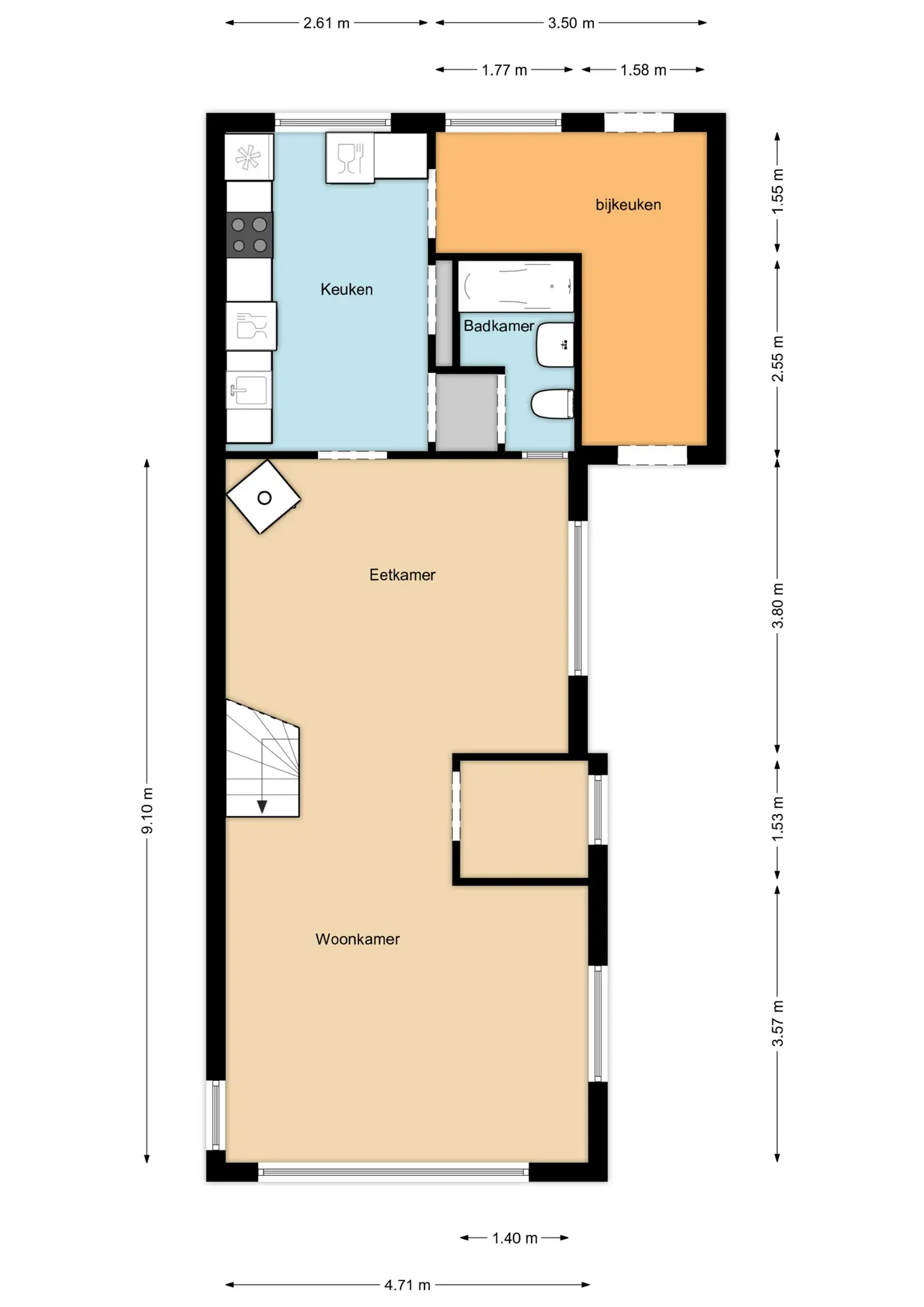 Op de begane grond vind je een royale woonkamer met veel lichtinval en voldoende ruimte voor een gezellige zithoek en eethoek. De keuken biedt volop mogelijkheden om naar eigen wens te moderniseren en vormt samen met de bijkeuken een praktische indeling. Verder bevindt zich op deze verdieping de badkamer, handig en comfortabel op de begane grond gesitueerd.