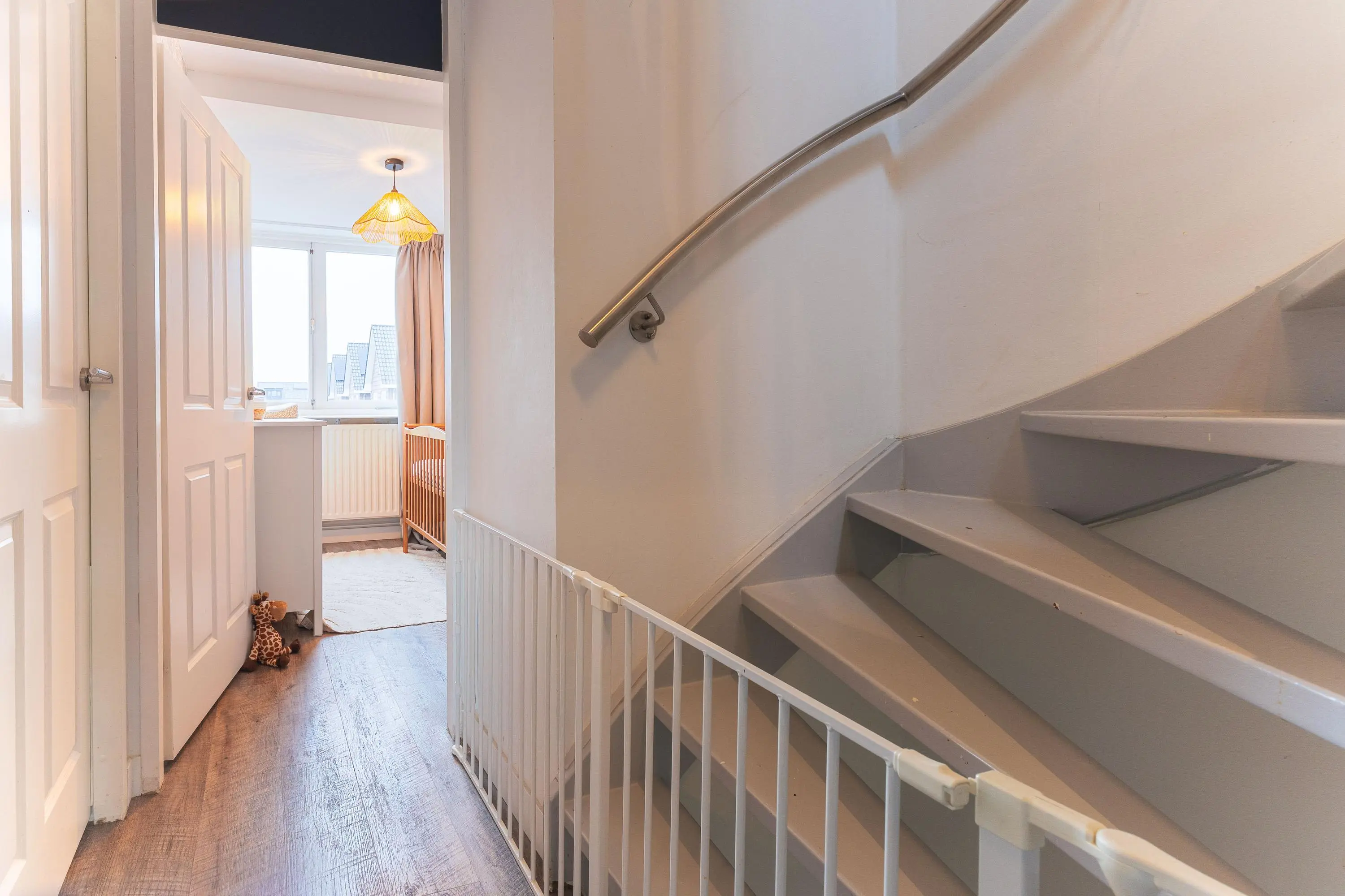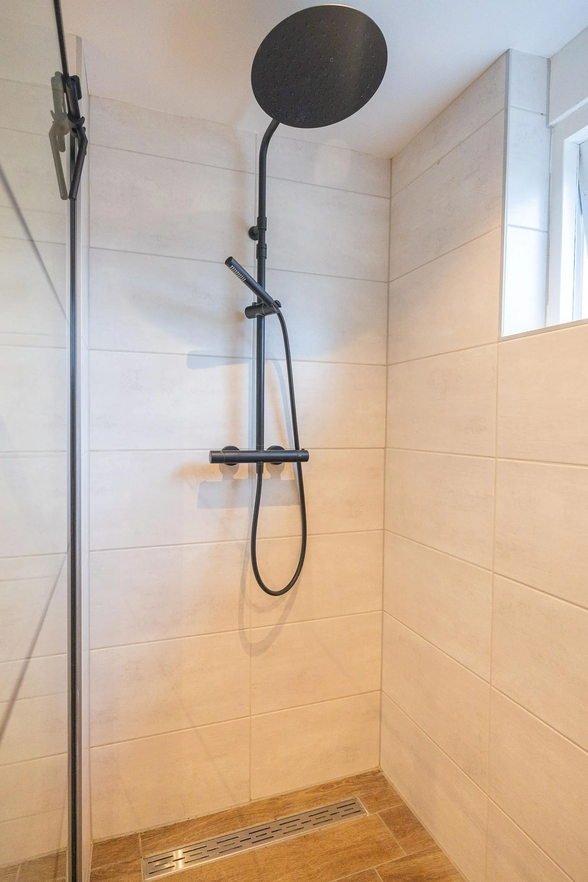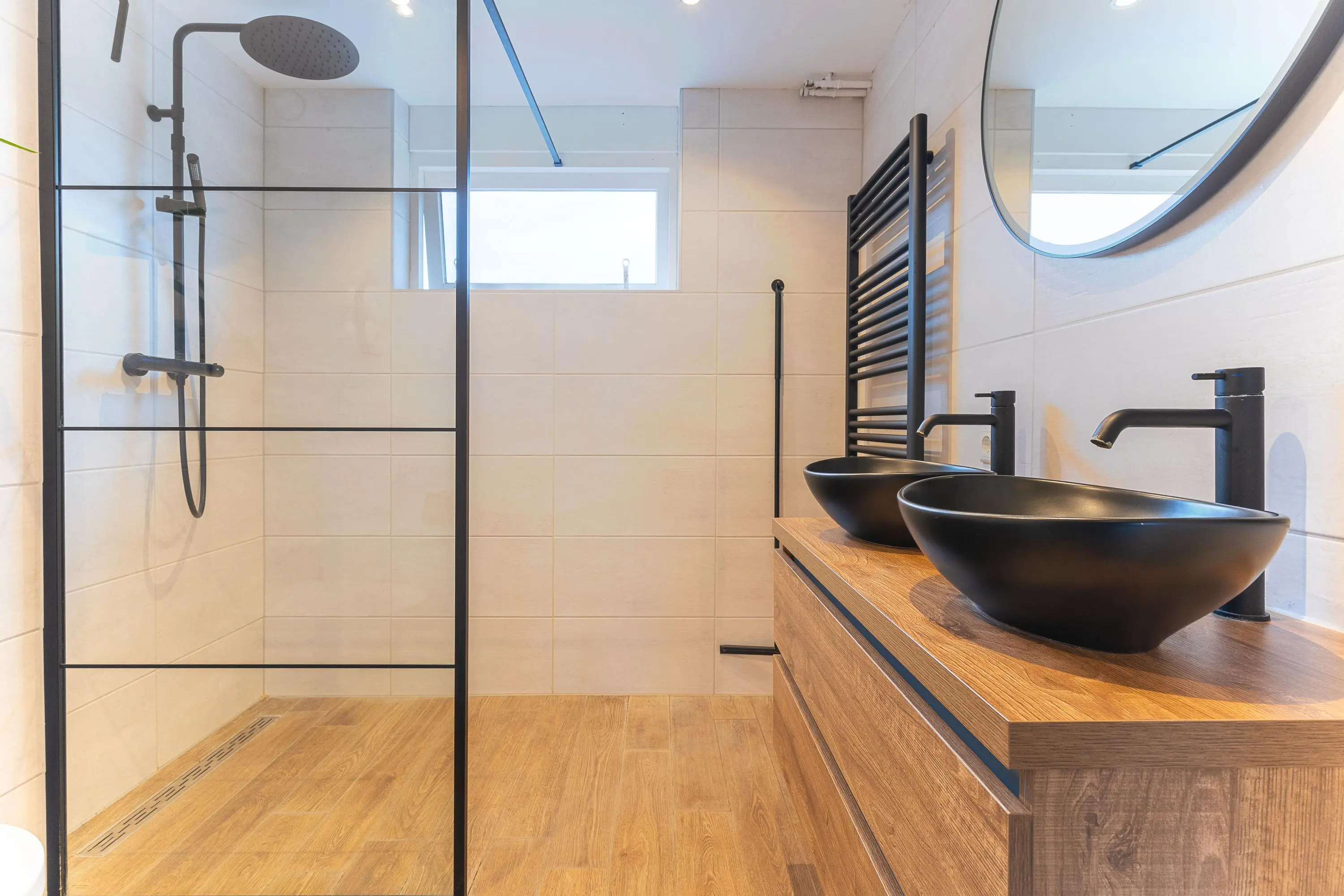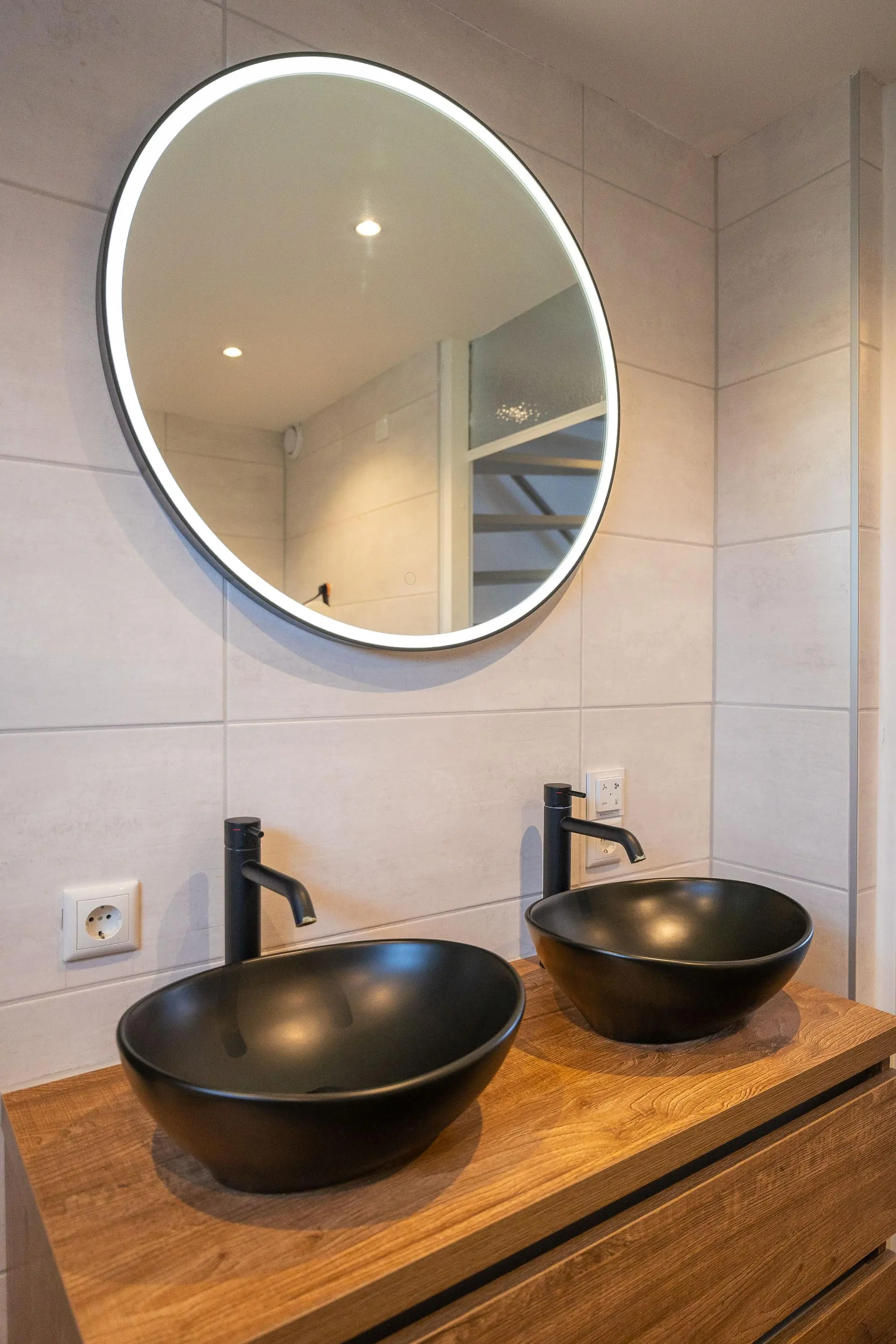 Via de trap in de woonkamer bereik je de eerste verdieping met drie fijne slaapkamers. De prachtige badkamer is stijlvol afgewerkt en beschikt over een royale inloopdouche, toilet, dubbele wastafel met meubel en een verwarmde spiegel – luxe en comfort in één.