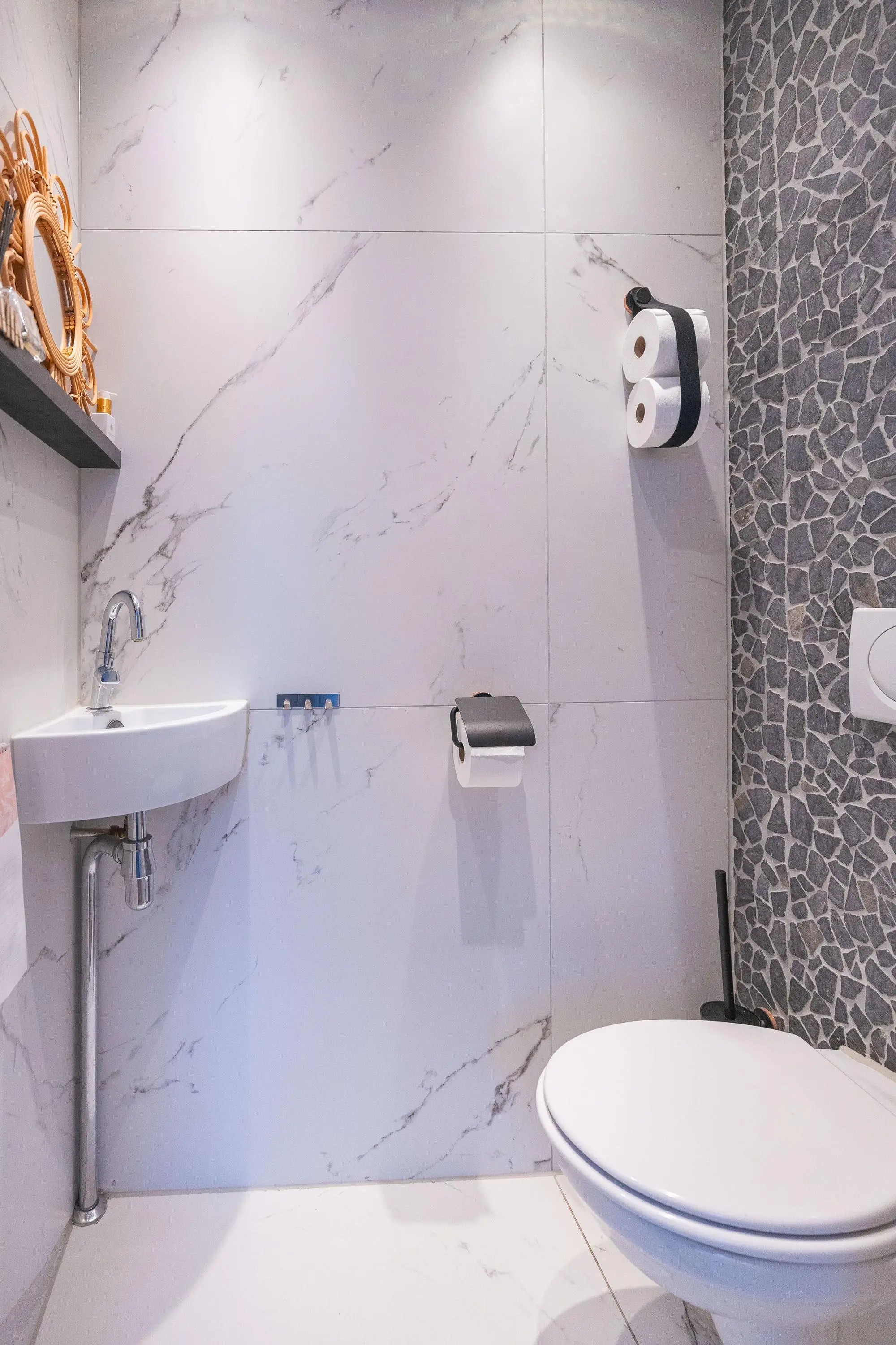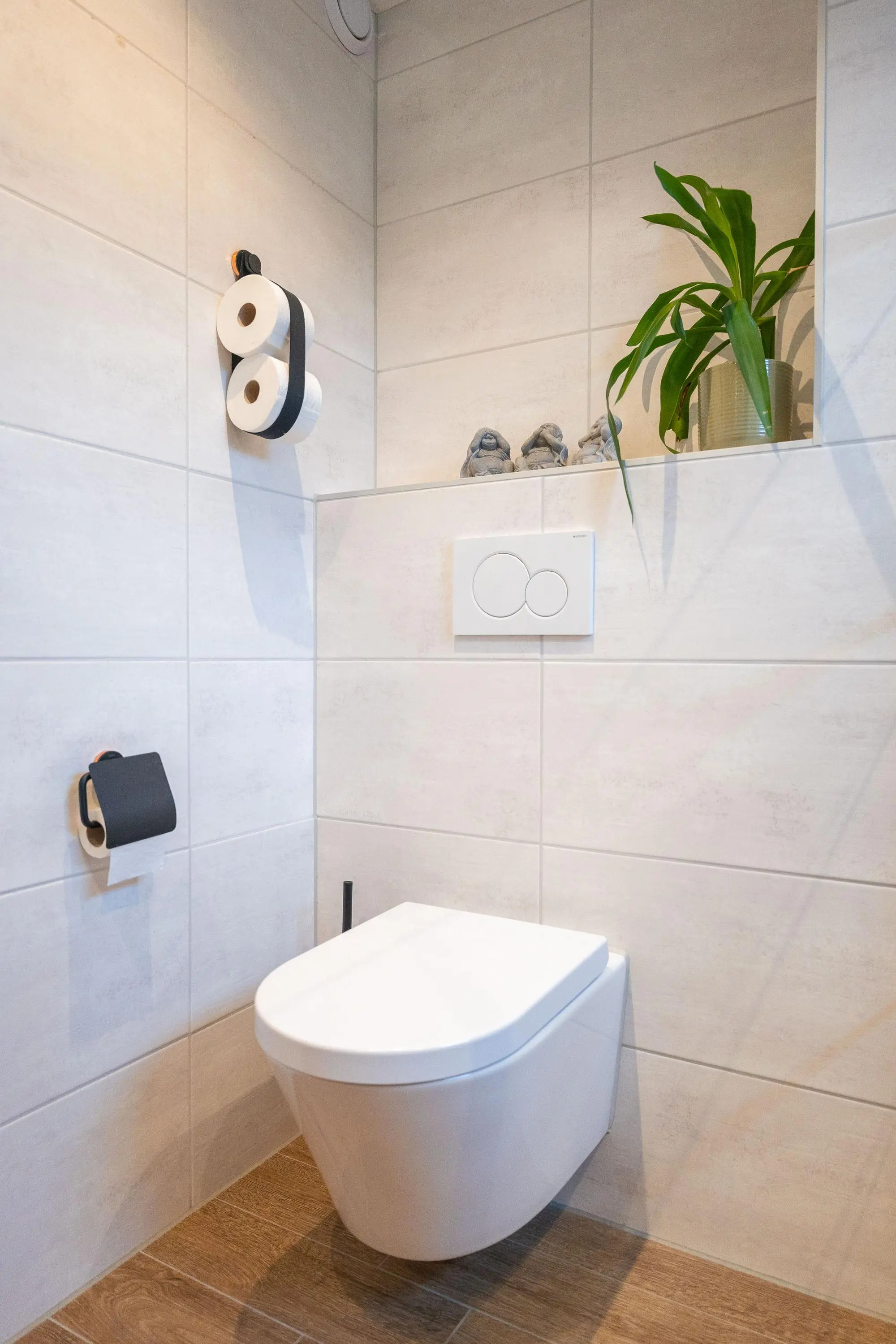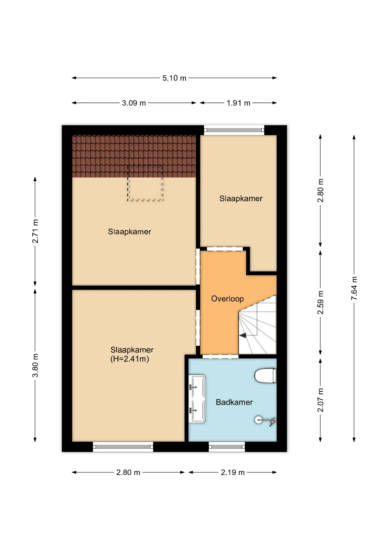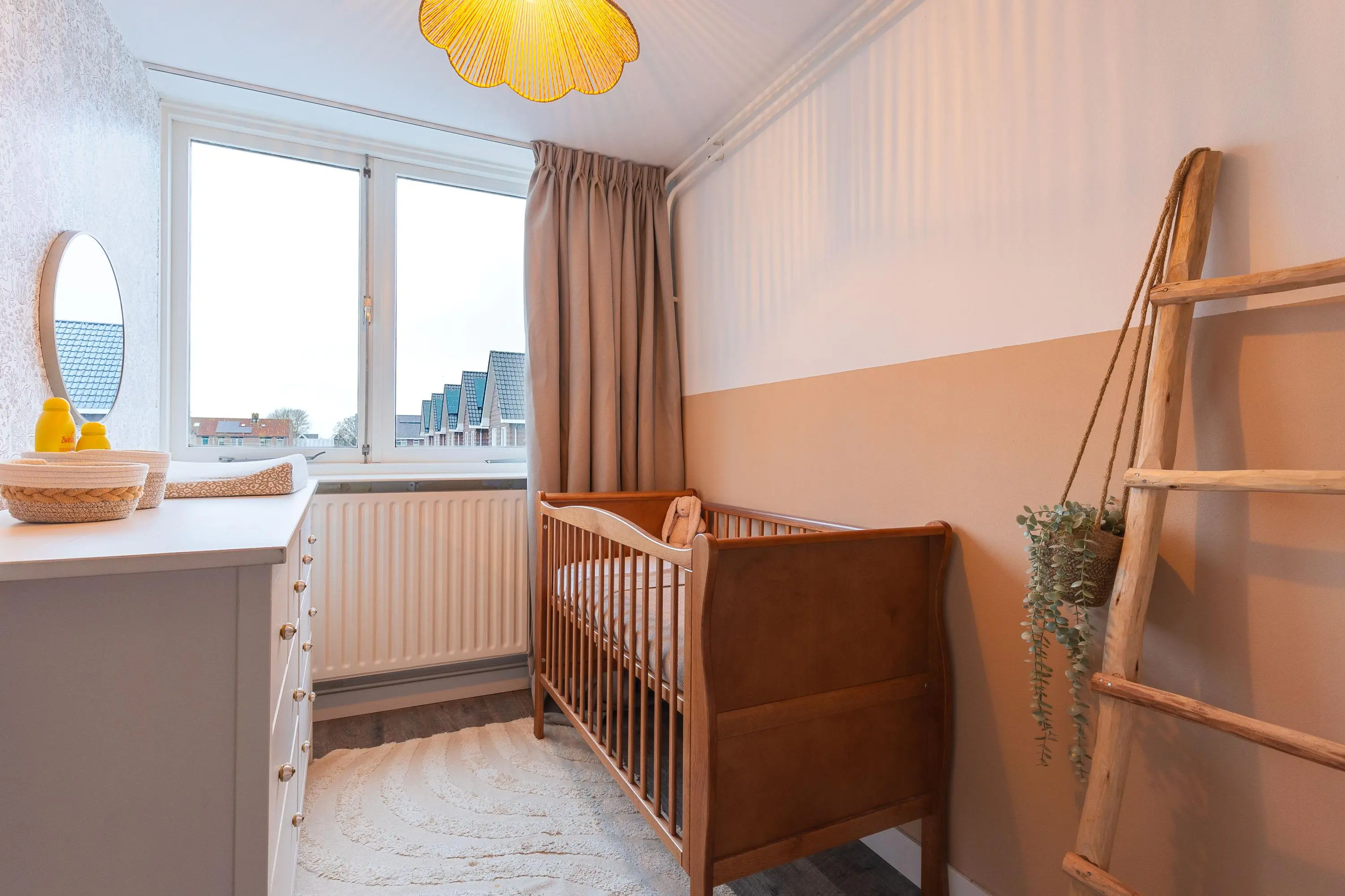 Via de trap in de woonkamer bereik je de eerste verdieping met drie fijne slaapkamers. De prachtige badkamer is stijlvol afgewerkt en beschikt over een royale inloopdouche, toilet, dubbele wastafel met meubel en een verwarmde spiegel – luxe en comfort in één.