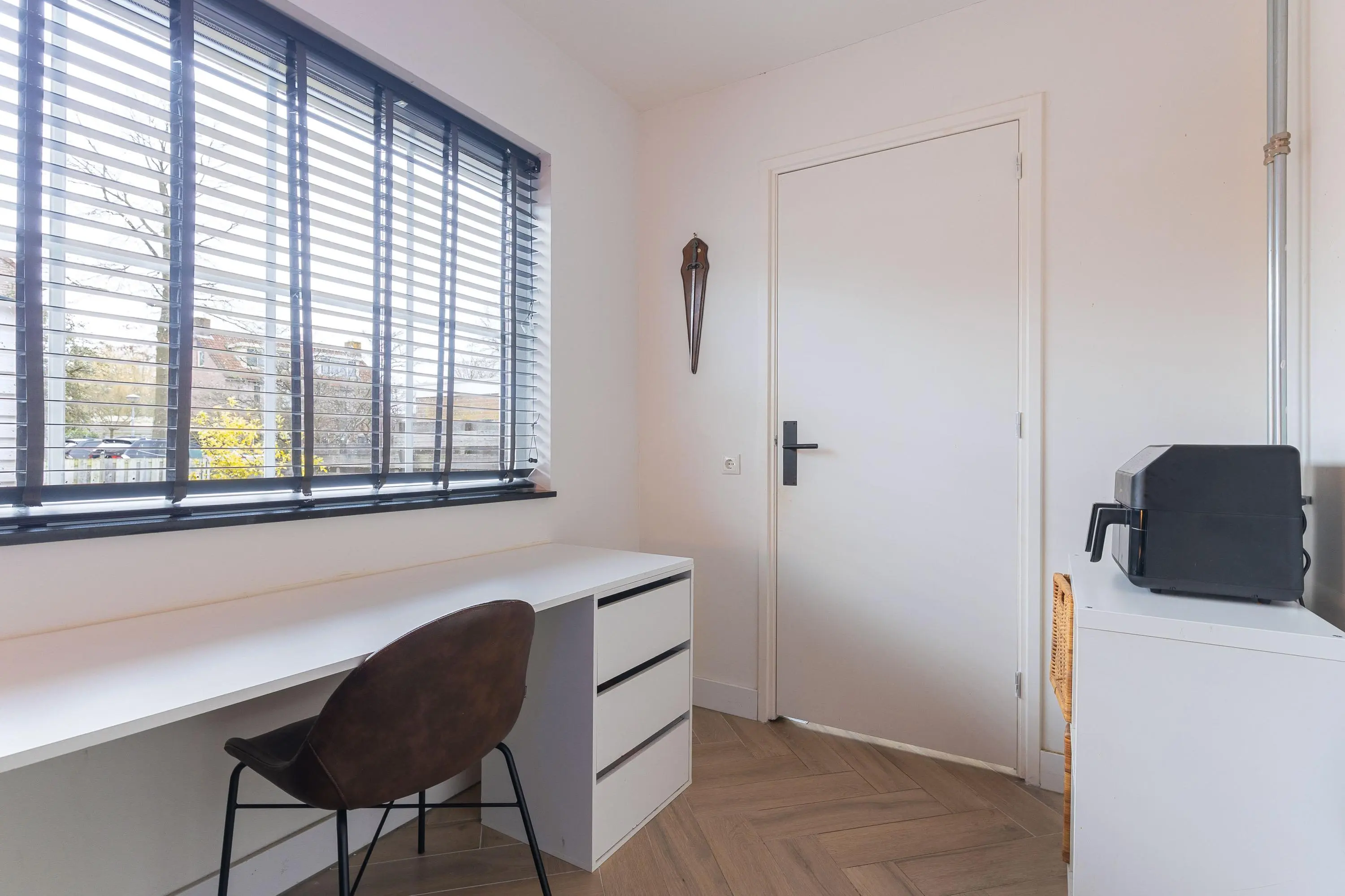 Via de entree bereik je de hal met modern toilet en een aparte kantoorruimte aan de voorzijde – ideaal voor thuiswerken of een praktijk aan huis.
