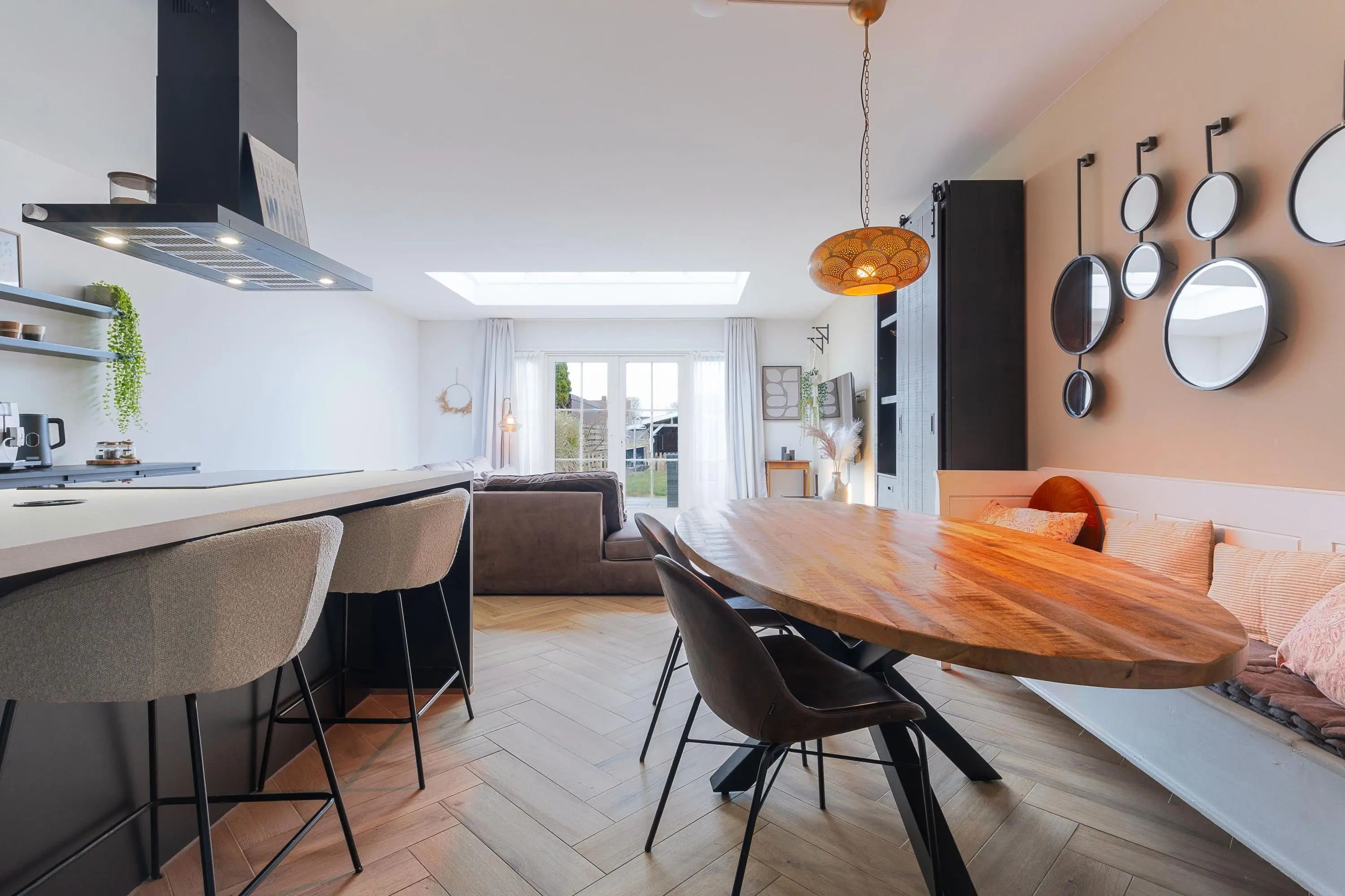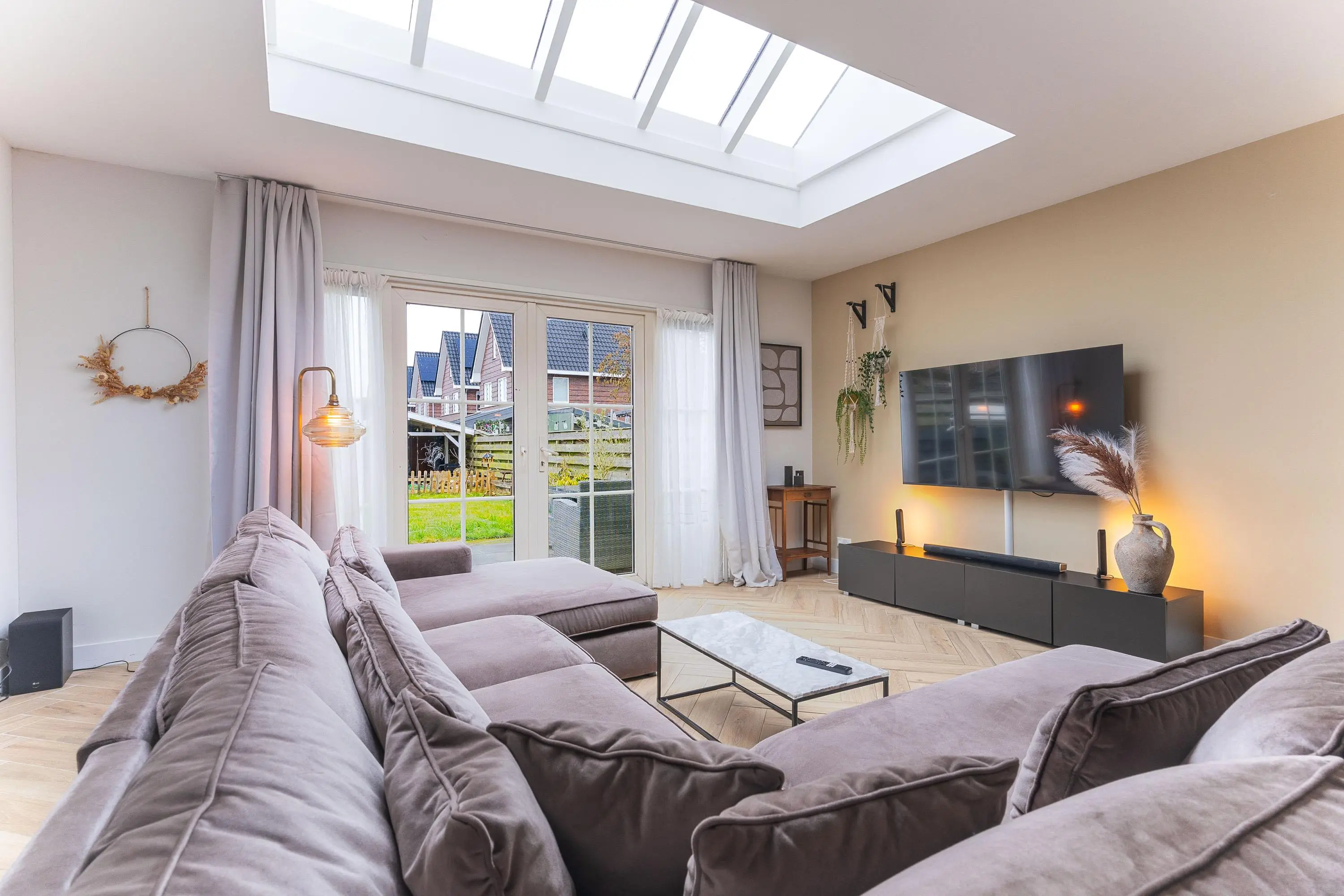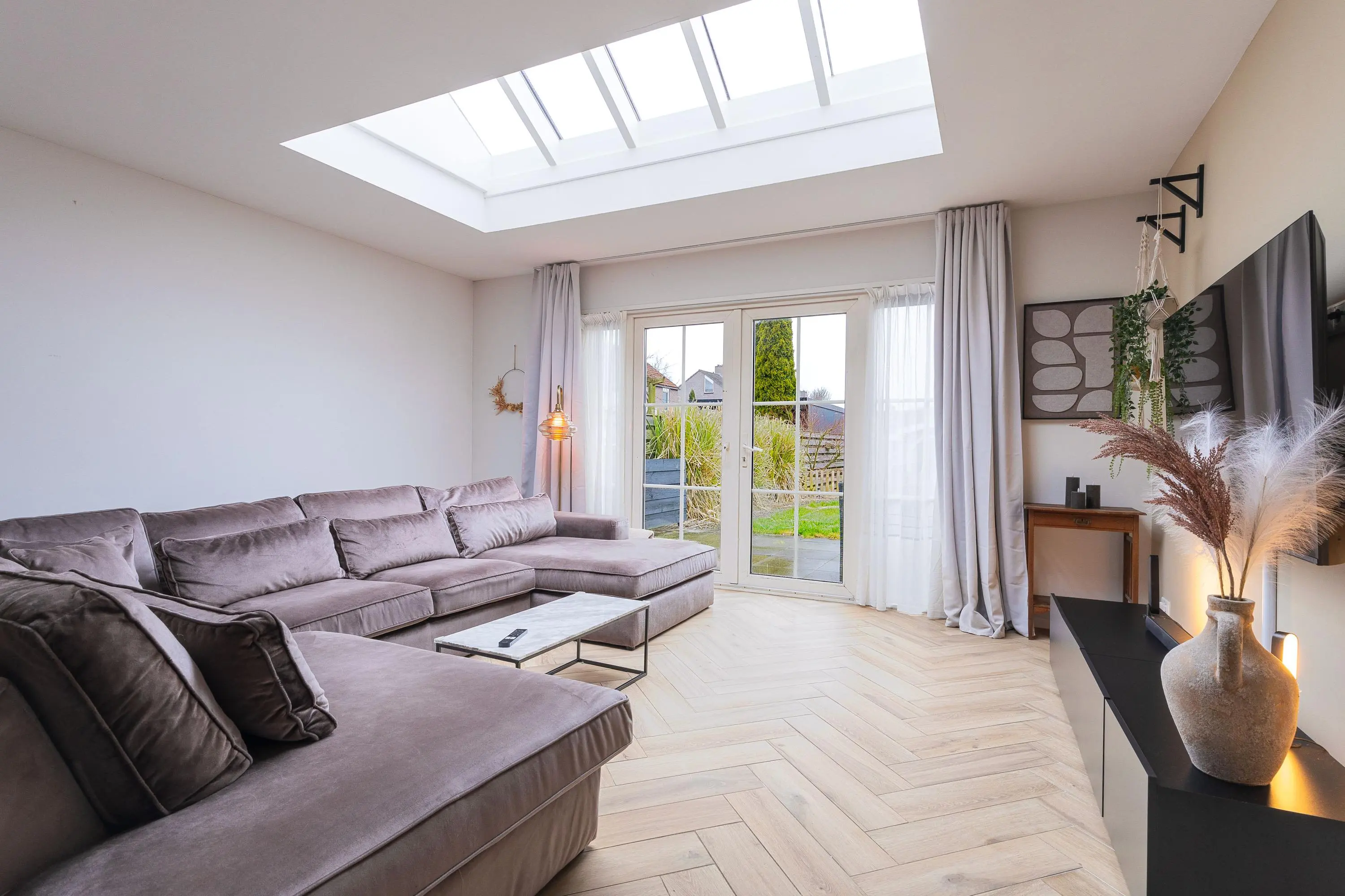 De openslaande deuren creëren een mooie connectie met de tuin en zorgen voor een heerlijk ruimtelijk gevoel.