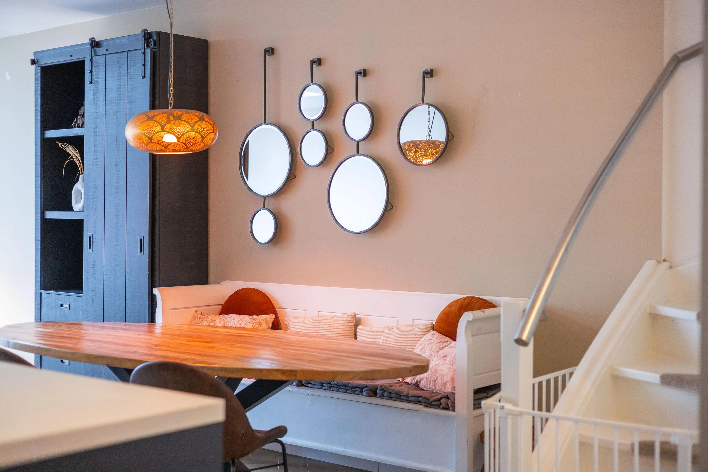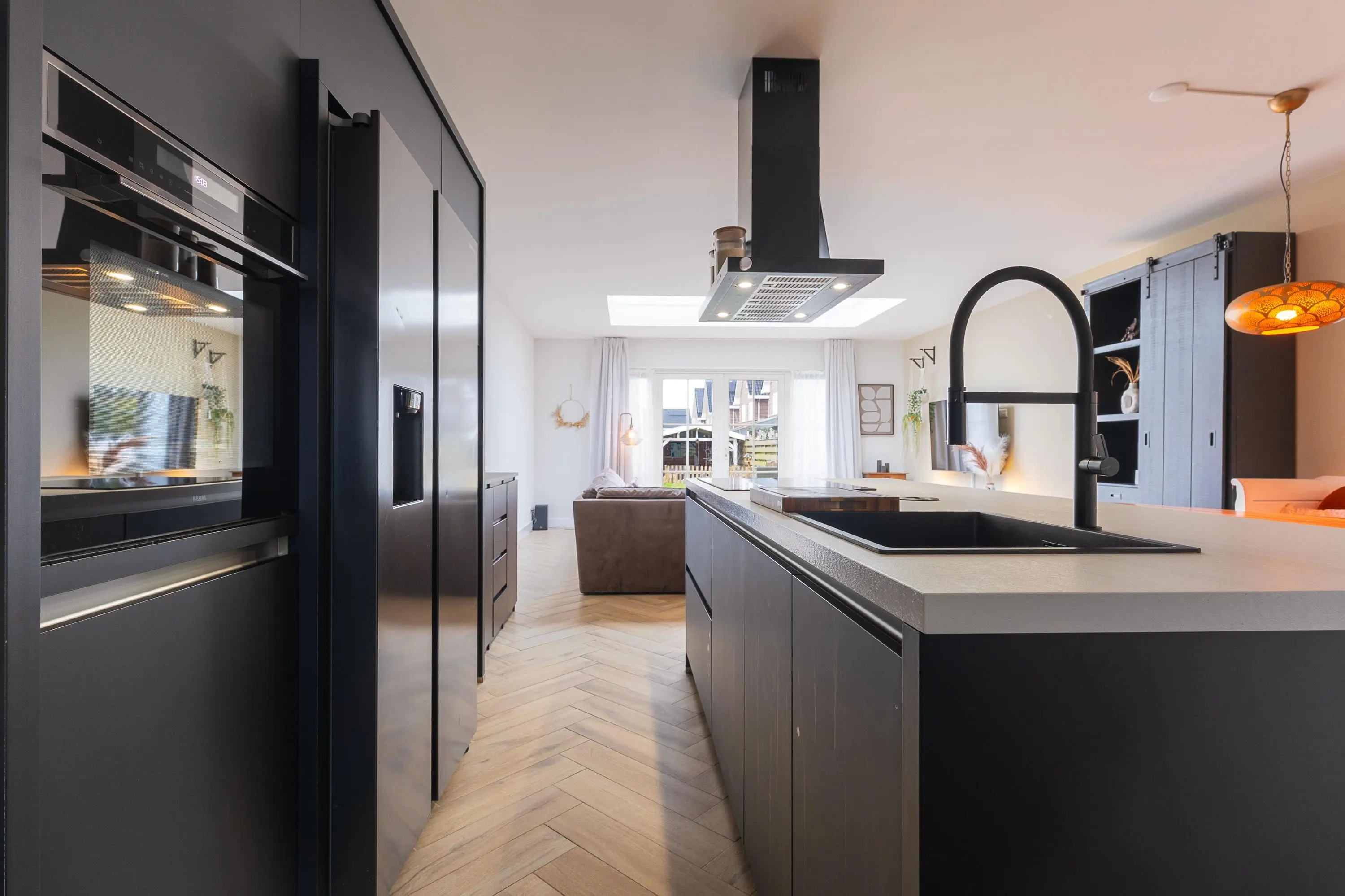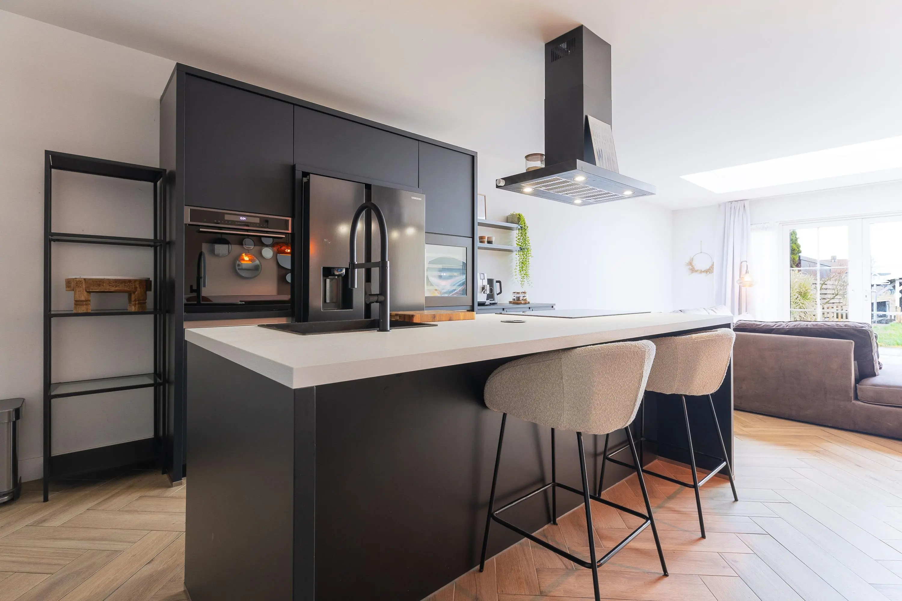 De openslaande deuren creëren een mooie connectie met de tuin en zorgen voor een heerlijk ruimtelijk gevoel.