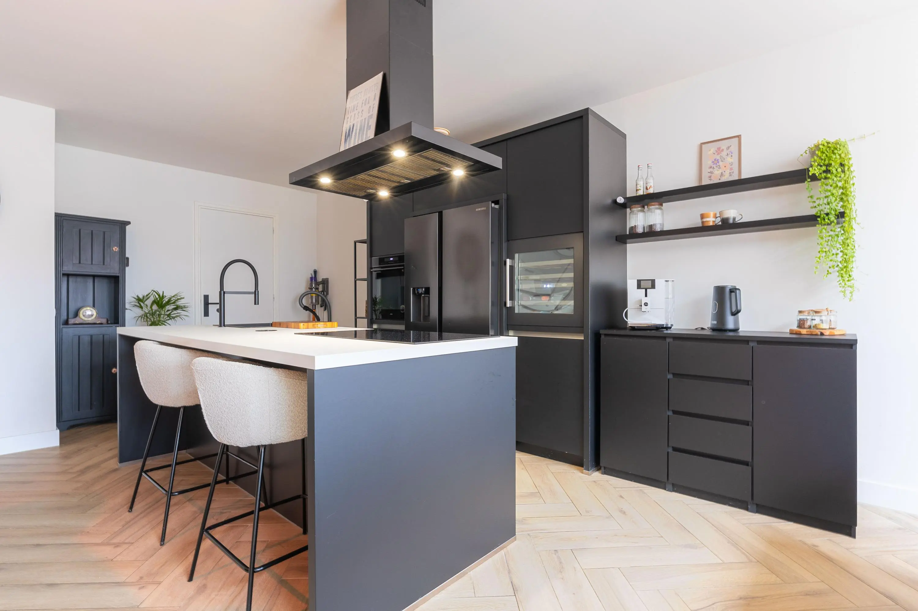 De royale, uitgebouwde leefruimte is werkelijk het hart van de woning. De prachtige visgraatvloer met vloerverwarming zorgt voor comfort en uitstraling. De schitterende open woonkeuken met kookeiland is een droom voor iedere hobbykok. Voorzien van diverse inbouwapparatuur en een wijnkoeler is dit dé plek om uitgebreid te koken en te genieten met vrienden en familie.
