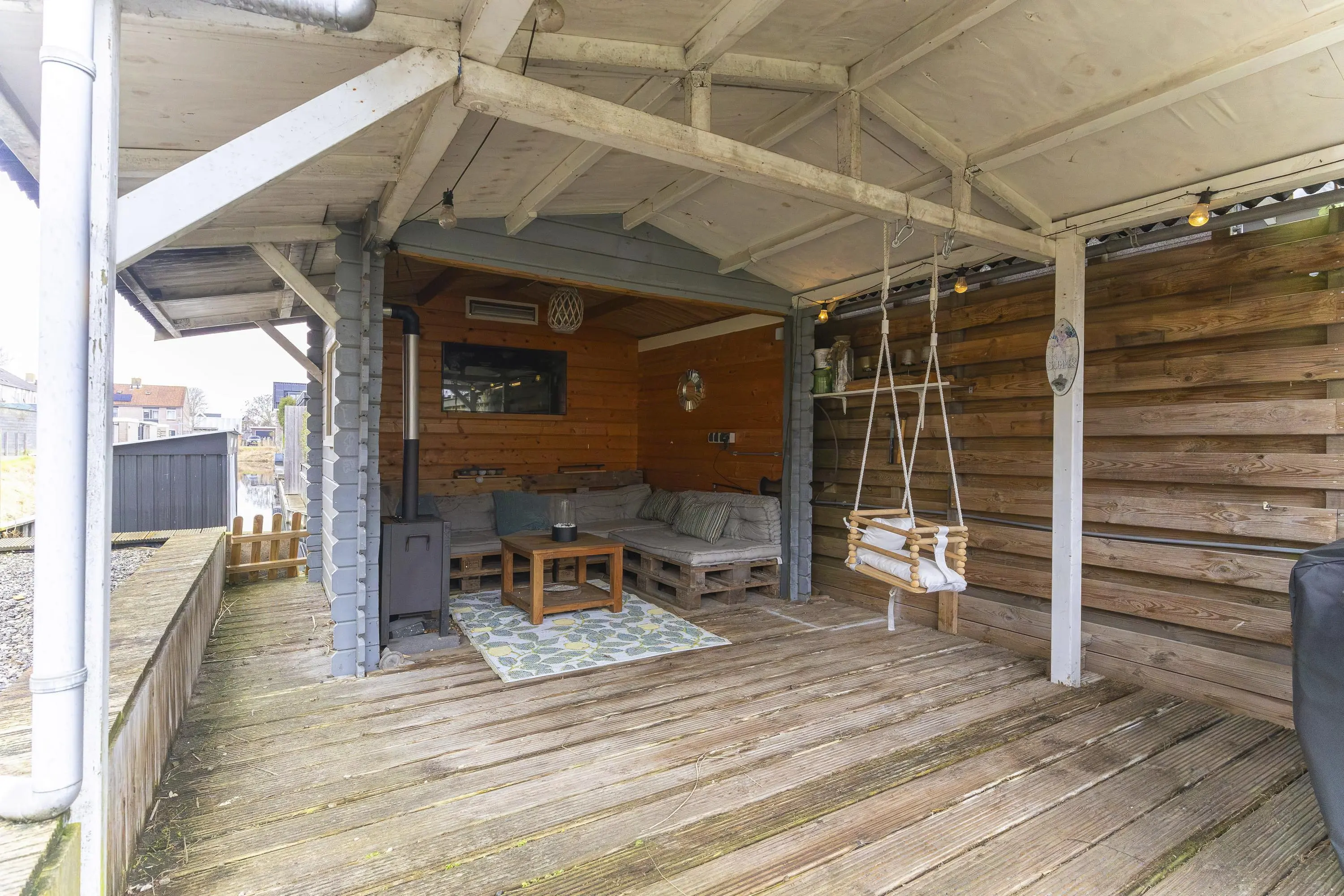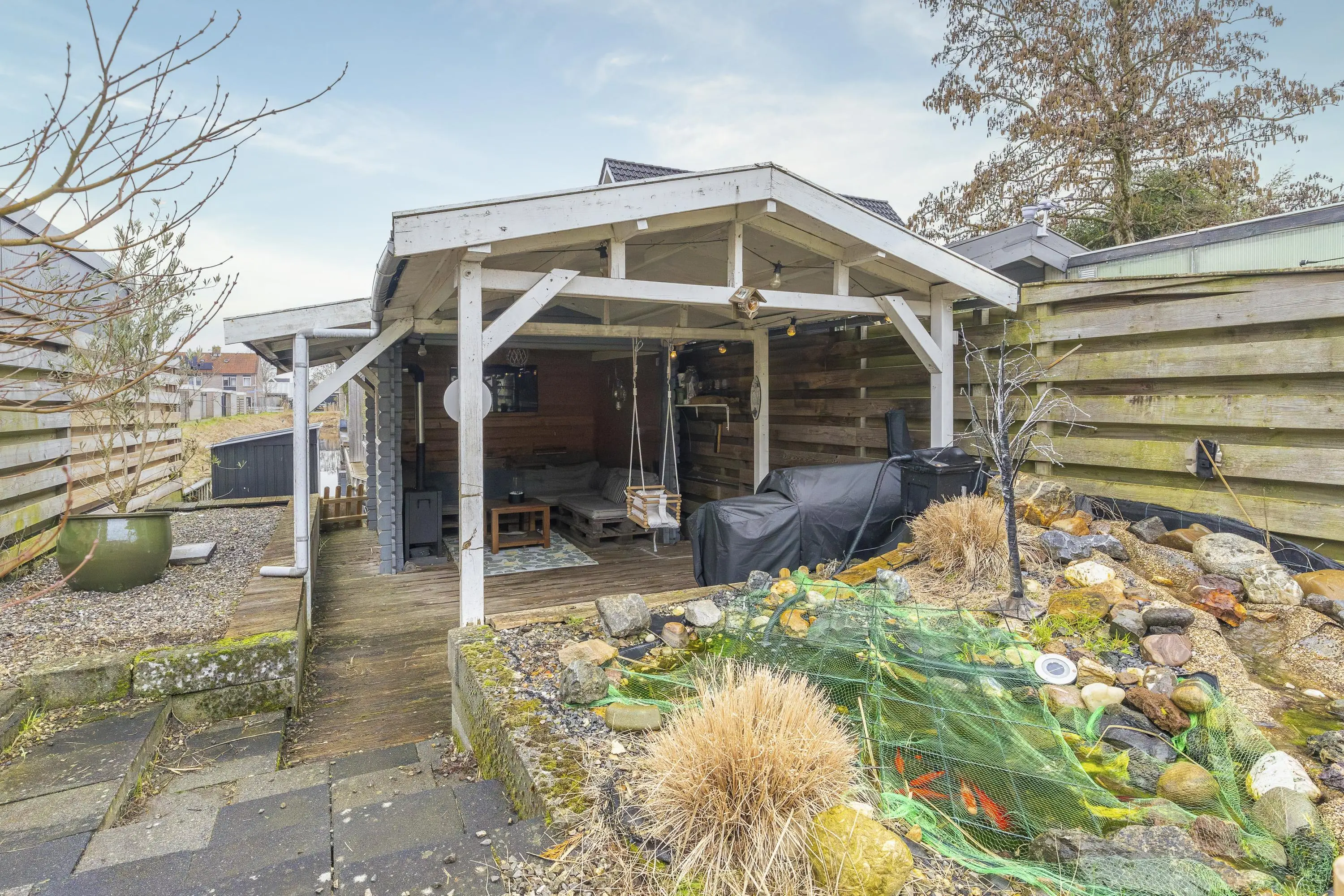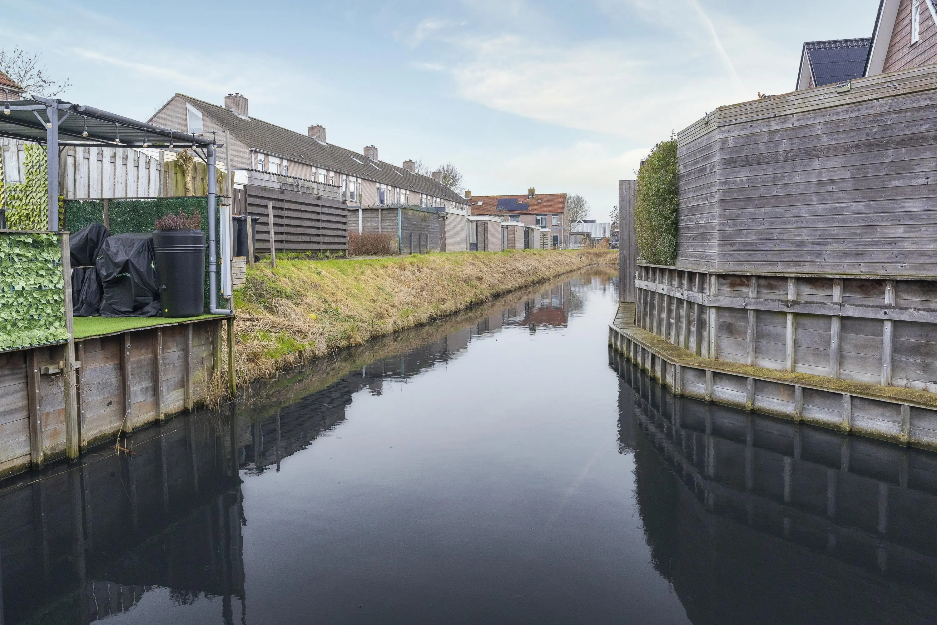 De diepe achtertuin op het noordwesten biedt volop zon in de middag en avond – hier geniet je van de ondergaande zon. De tuin ligt aan doorgaand vaarwater en beschikt over een eigen steiger.