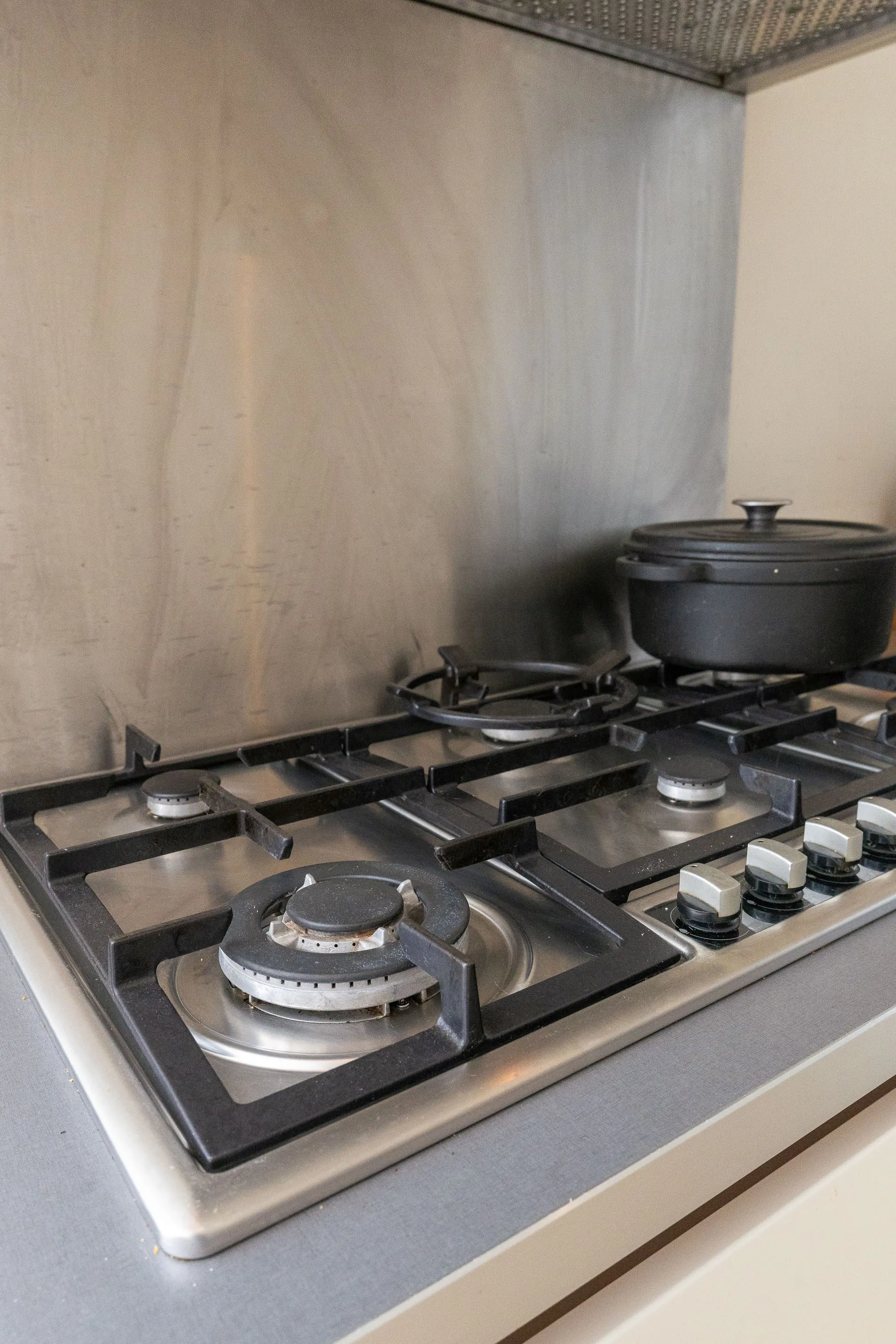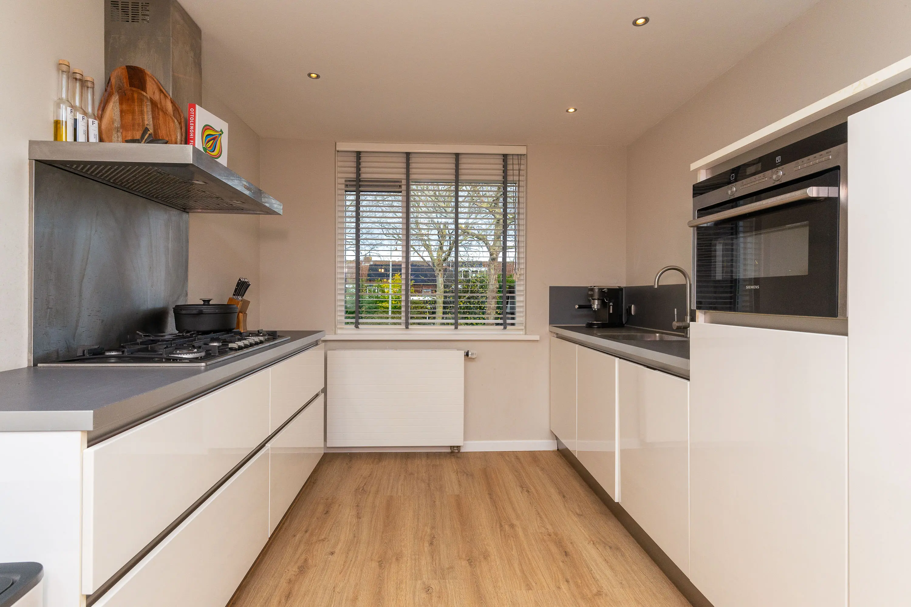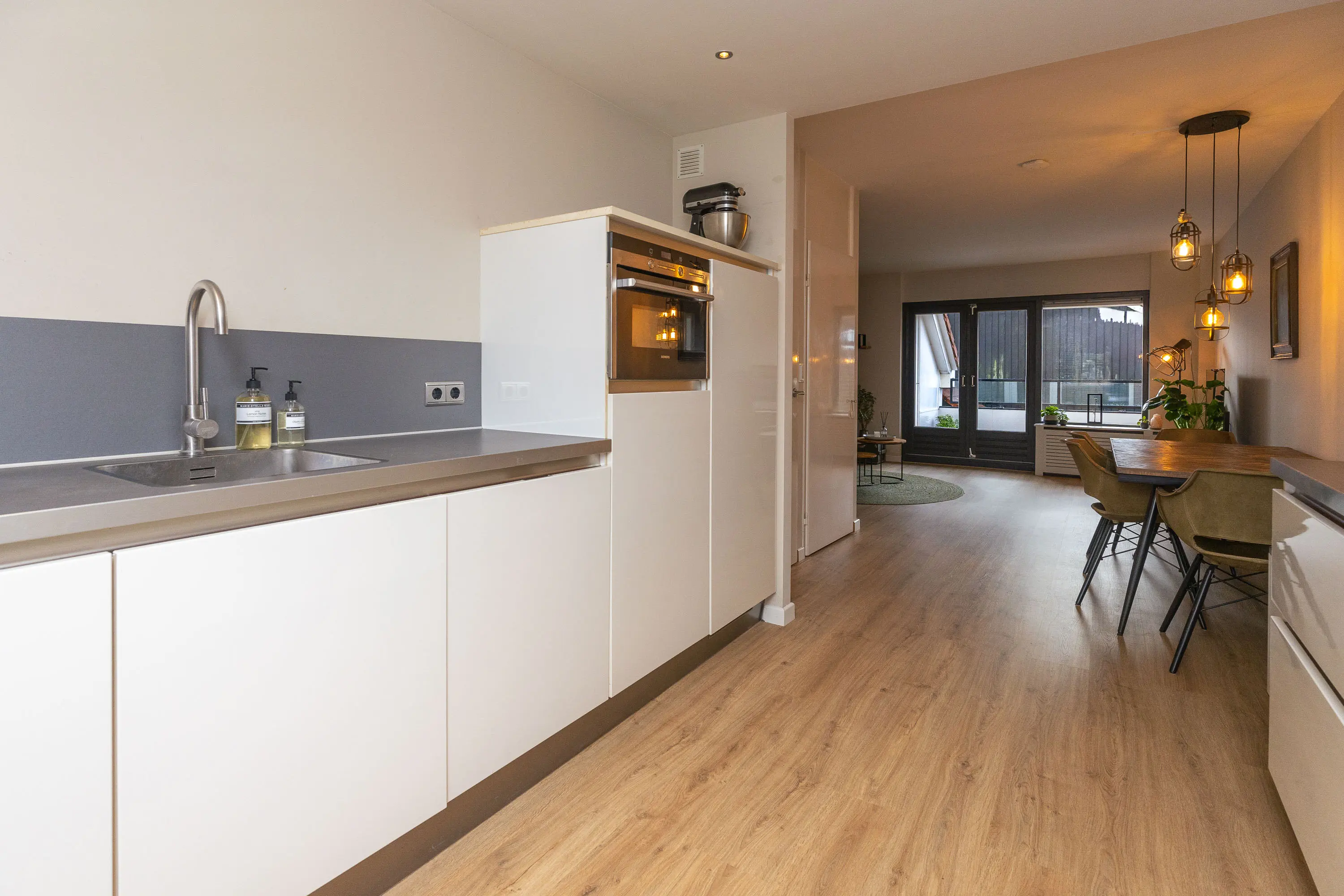 Aan de voorzijde ligt de luxe, greep loze keuken in een ruime hoekopstelling. Compleet met o.a. vaatwasser, 5-pits gaskookplaat, oven, koelkast, 4-lade vriezer en handige besteklade. Kortom: koken wordt hier een feestje.