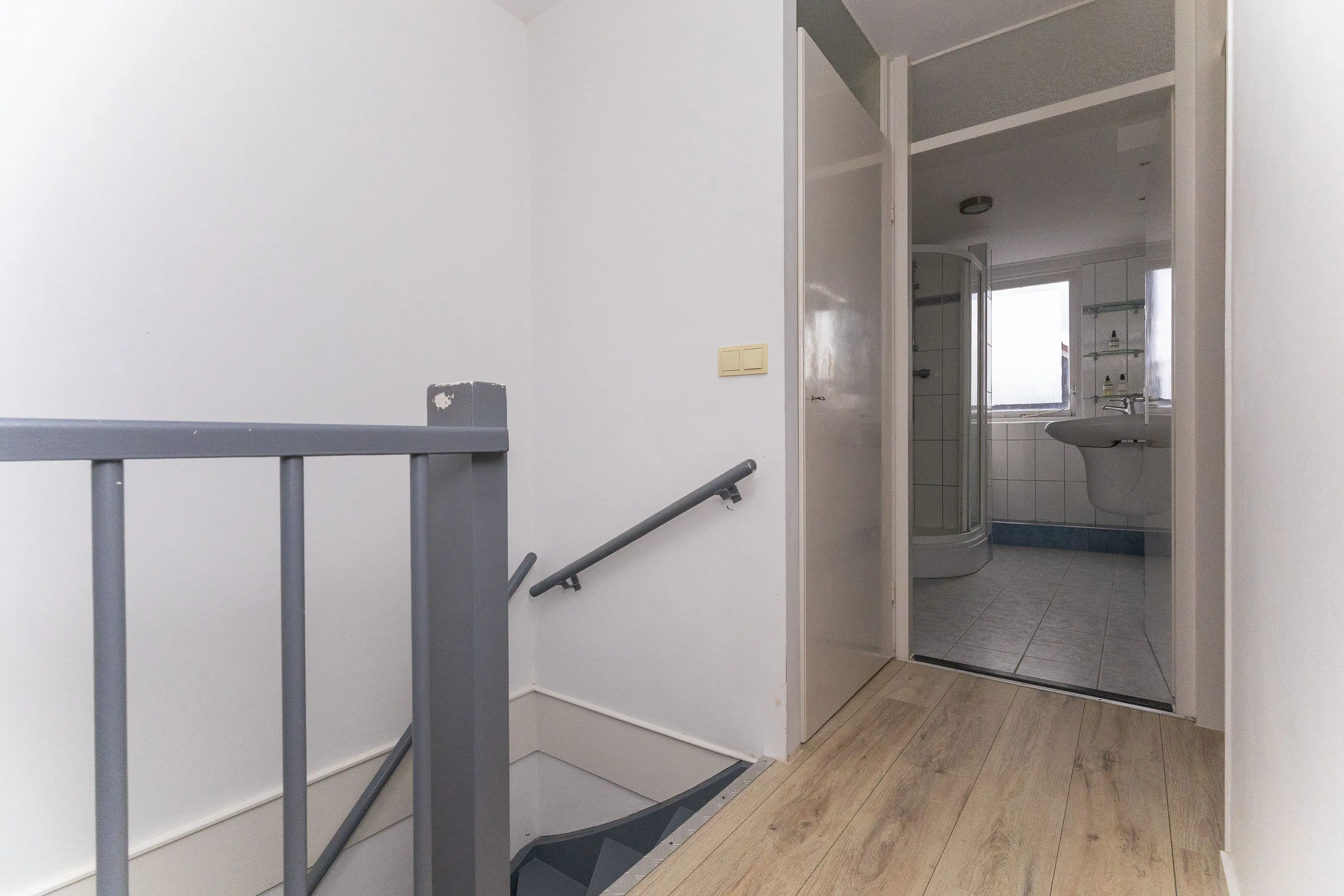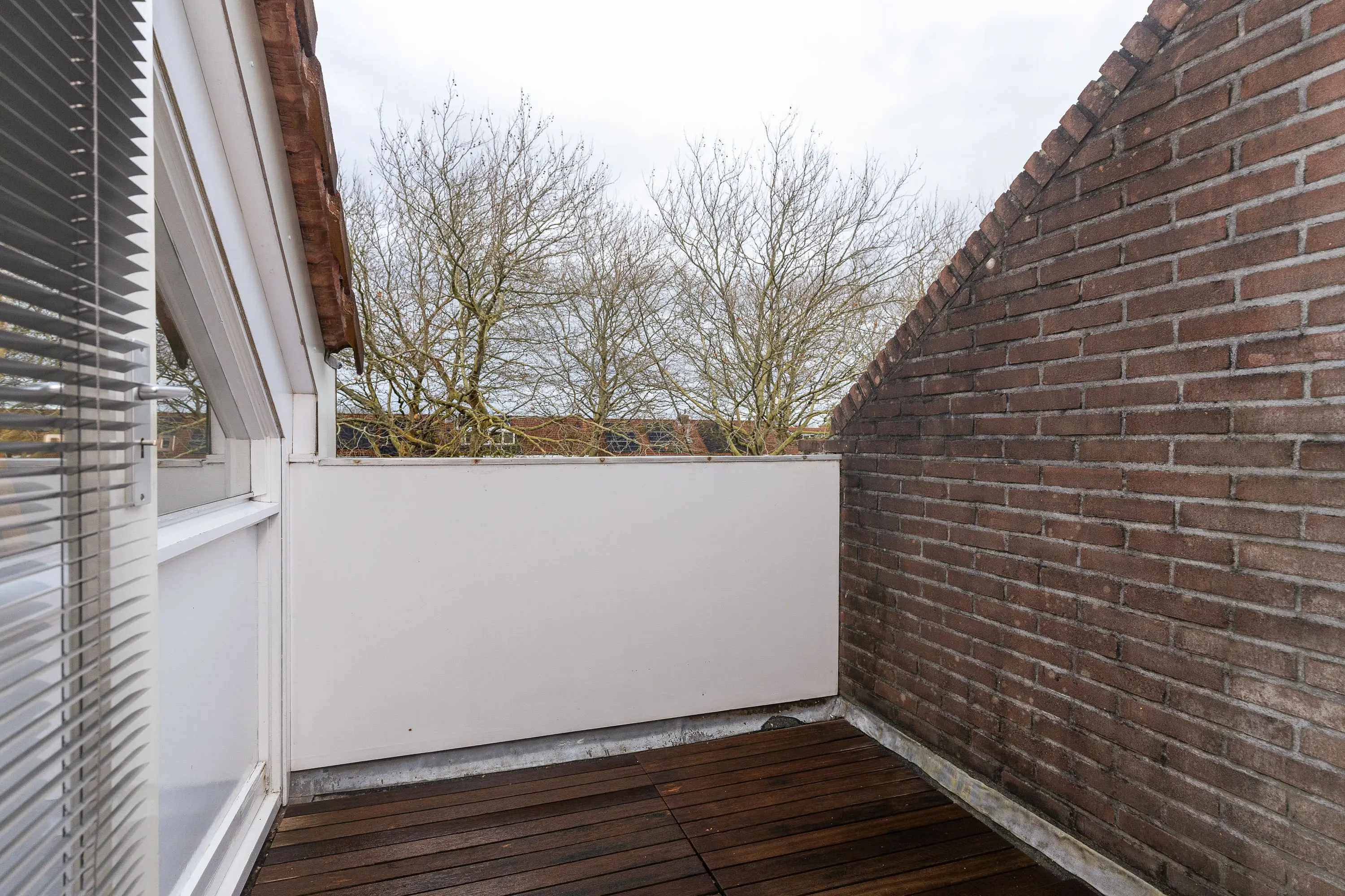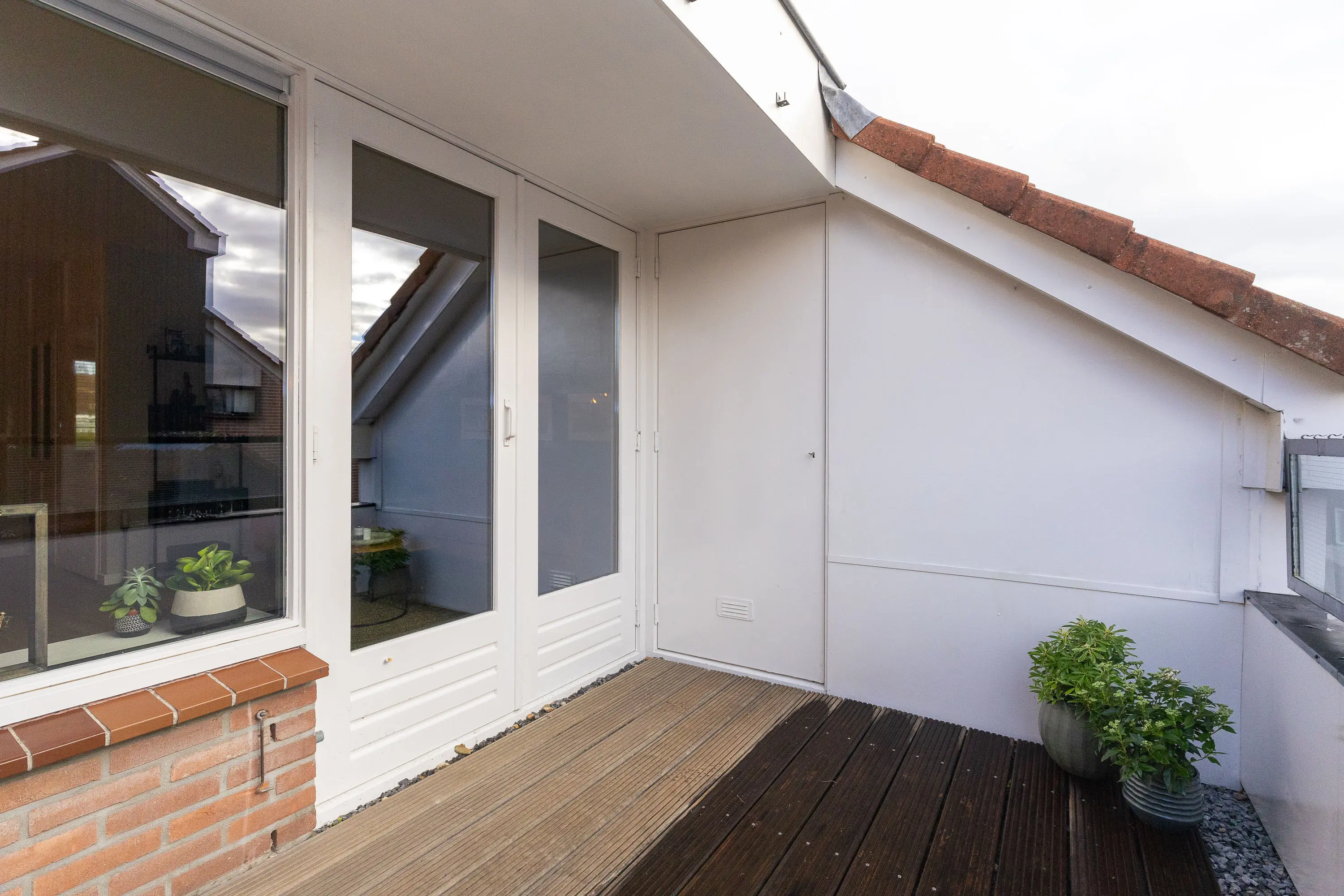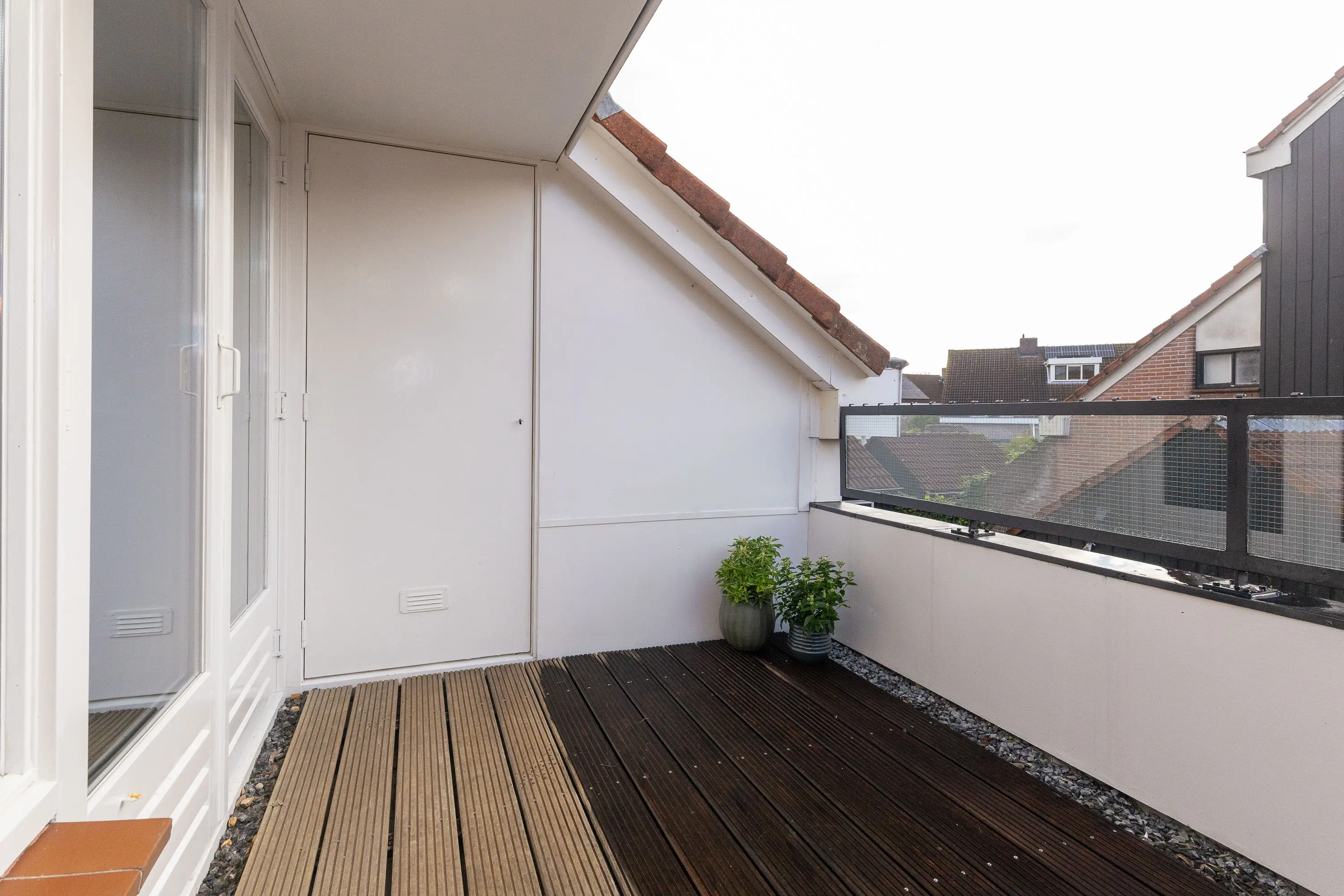 Op de overloop vind je een vaste kast én toegang tot het tweede balkon. Verder zijn er twee nette slaapkamers met doorlopende laminaatvloer en een lichte badkamer met douche, toilet, wastafel, wasmachine-aansluiting en ruimte voor een droger.