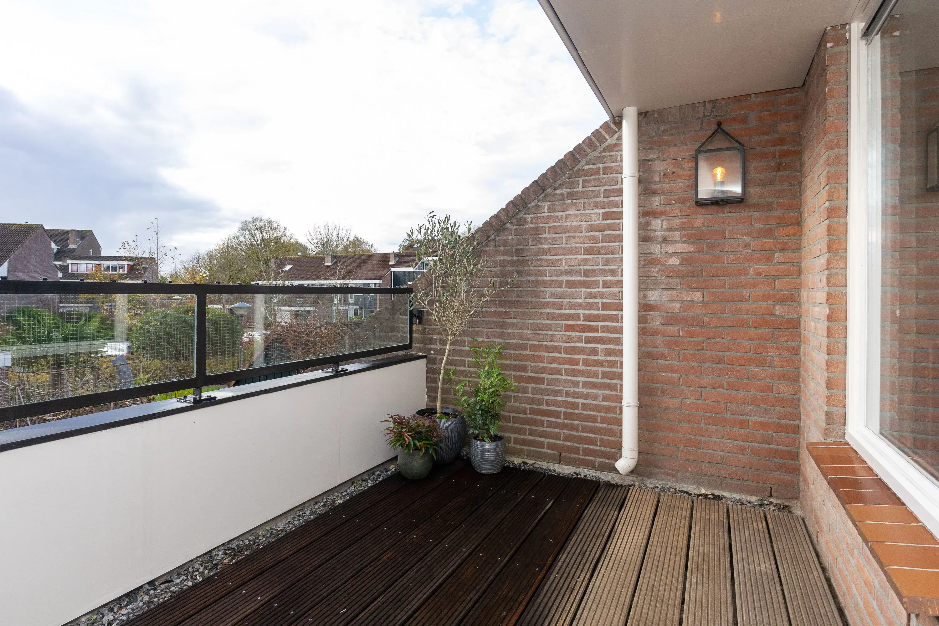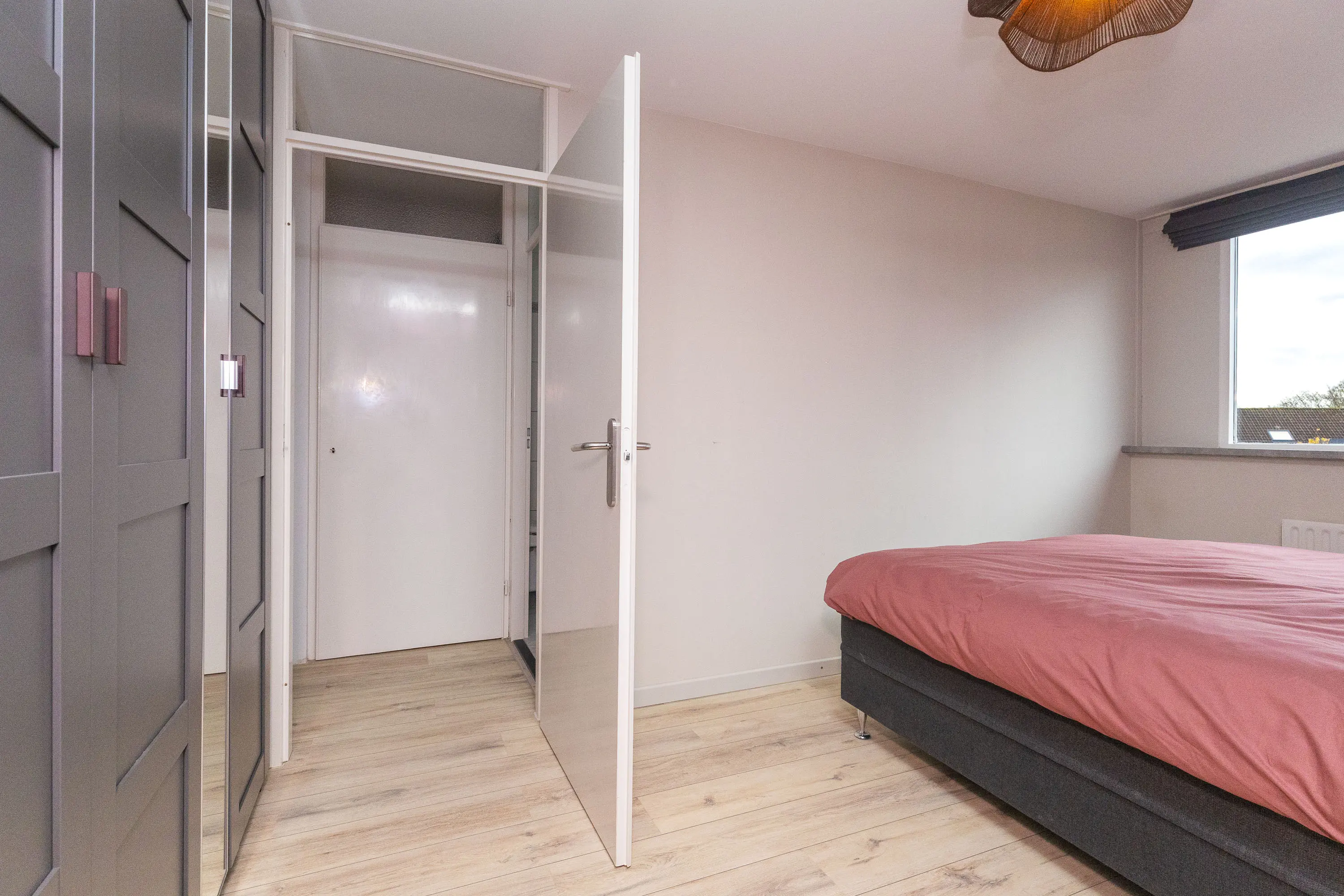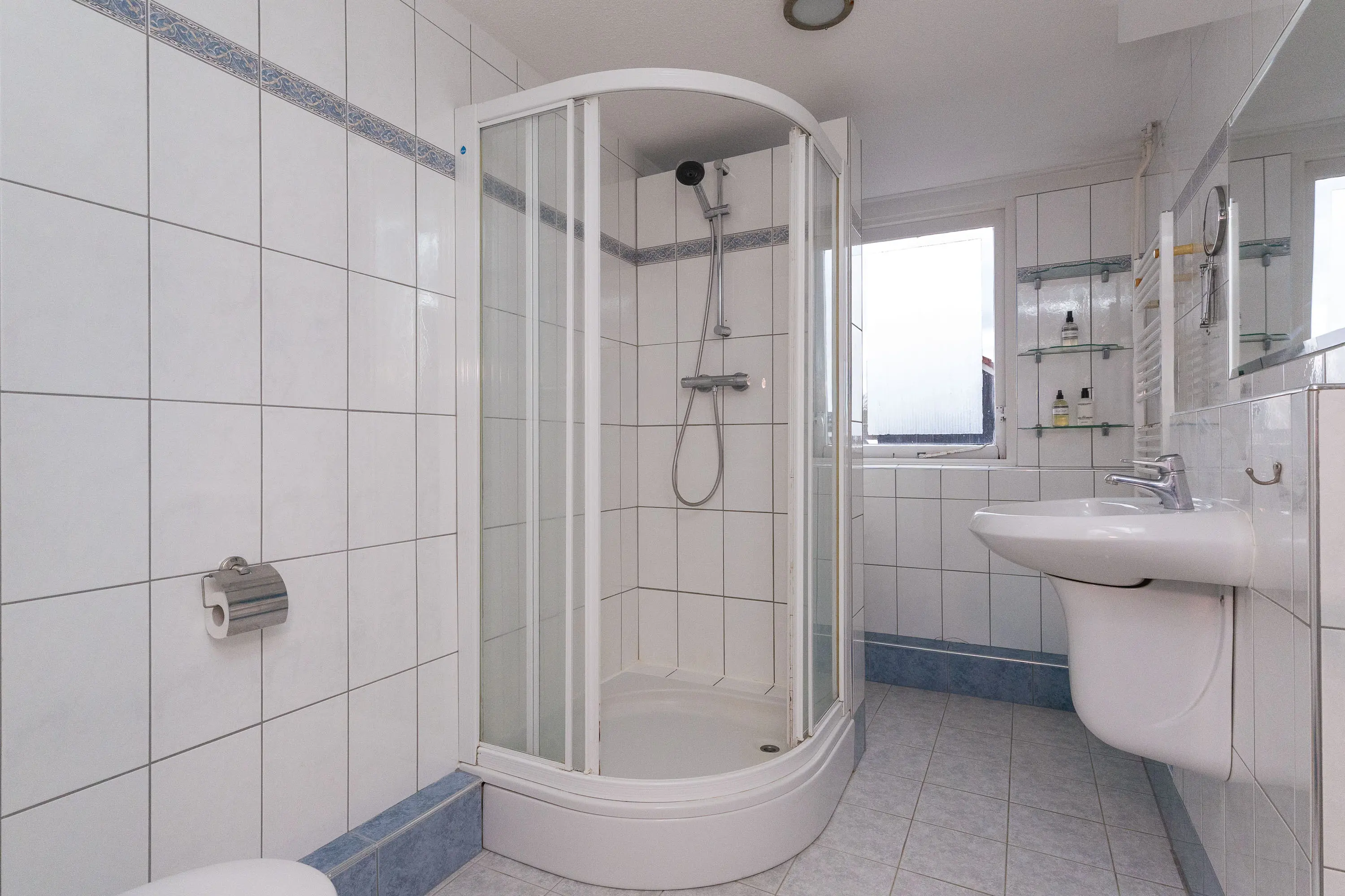 Op de overloop vind je een vaste kast én toegang tot het tweede balkon. Verder zijn er twee nette slaapkamers met doorlopende laminaatvloer en een lichte badkamer met douche, toilet, wastafel, wasmachine-aansluiting en ruimte voor een droger.