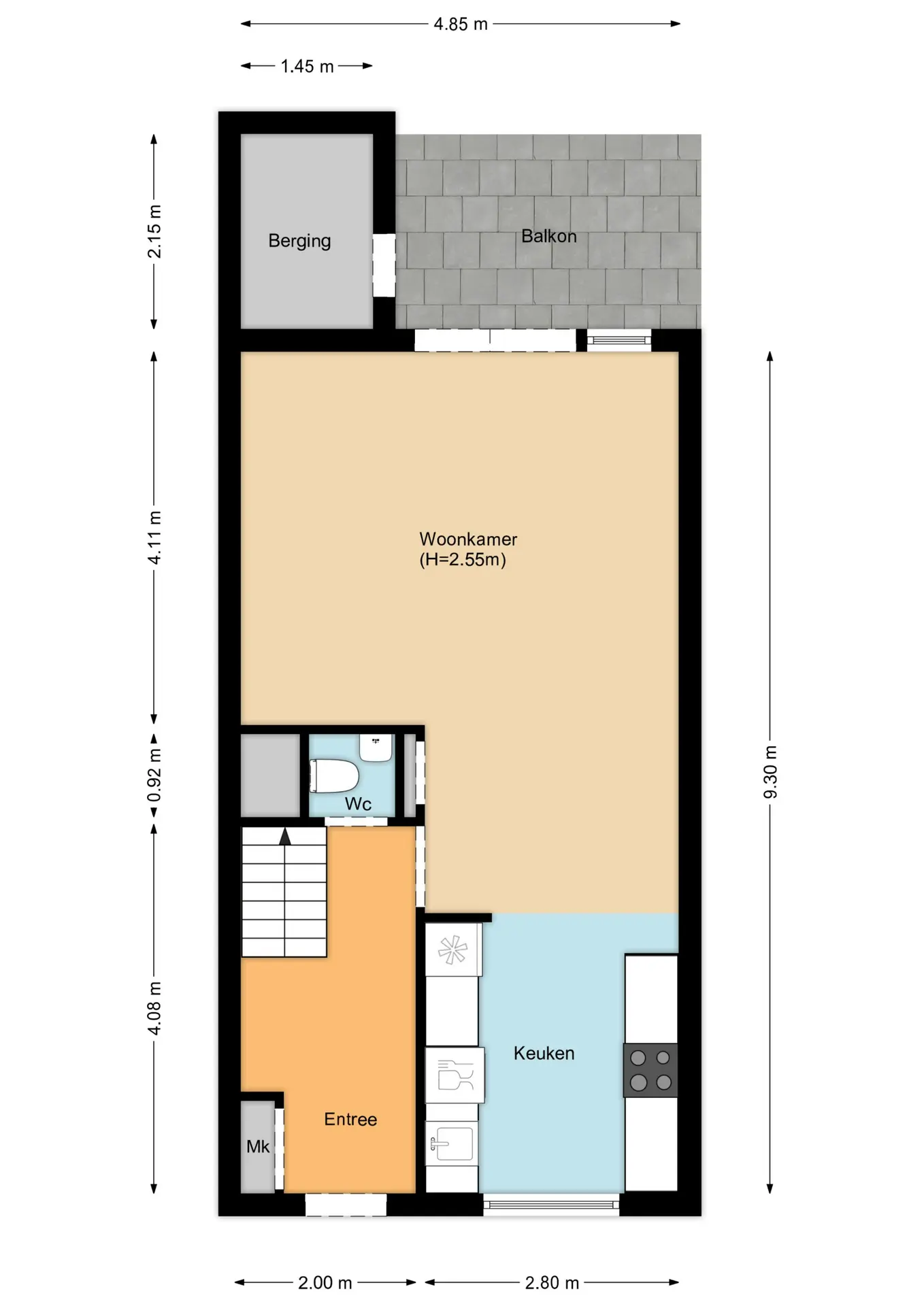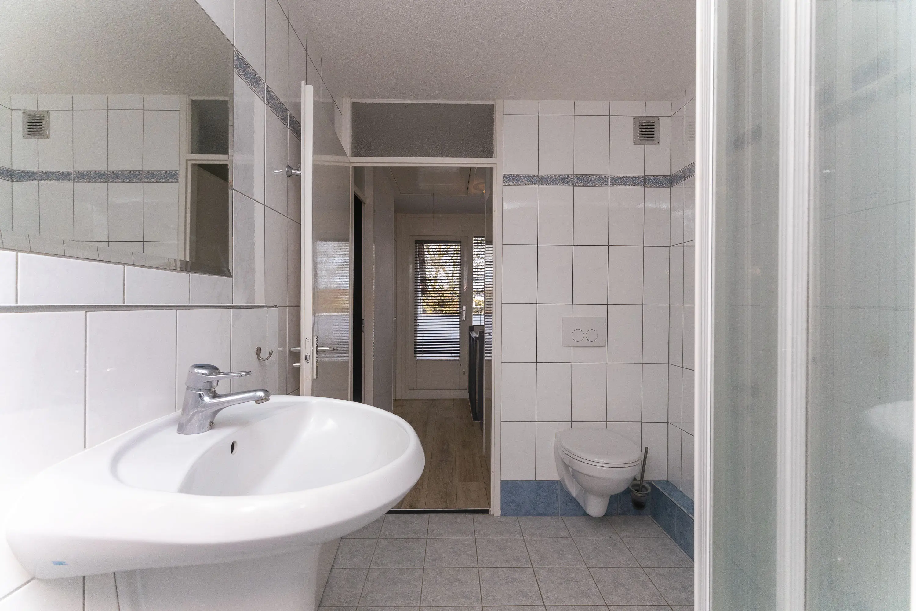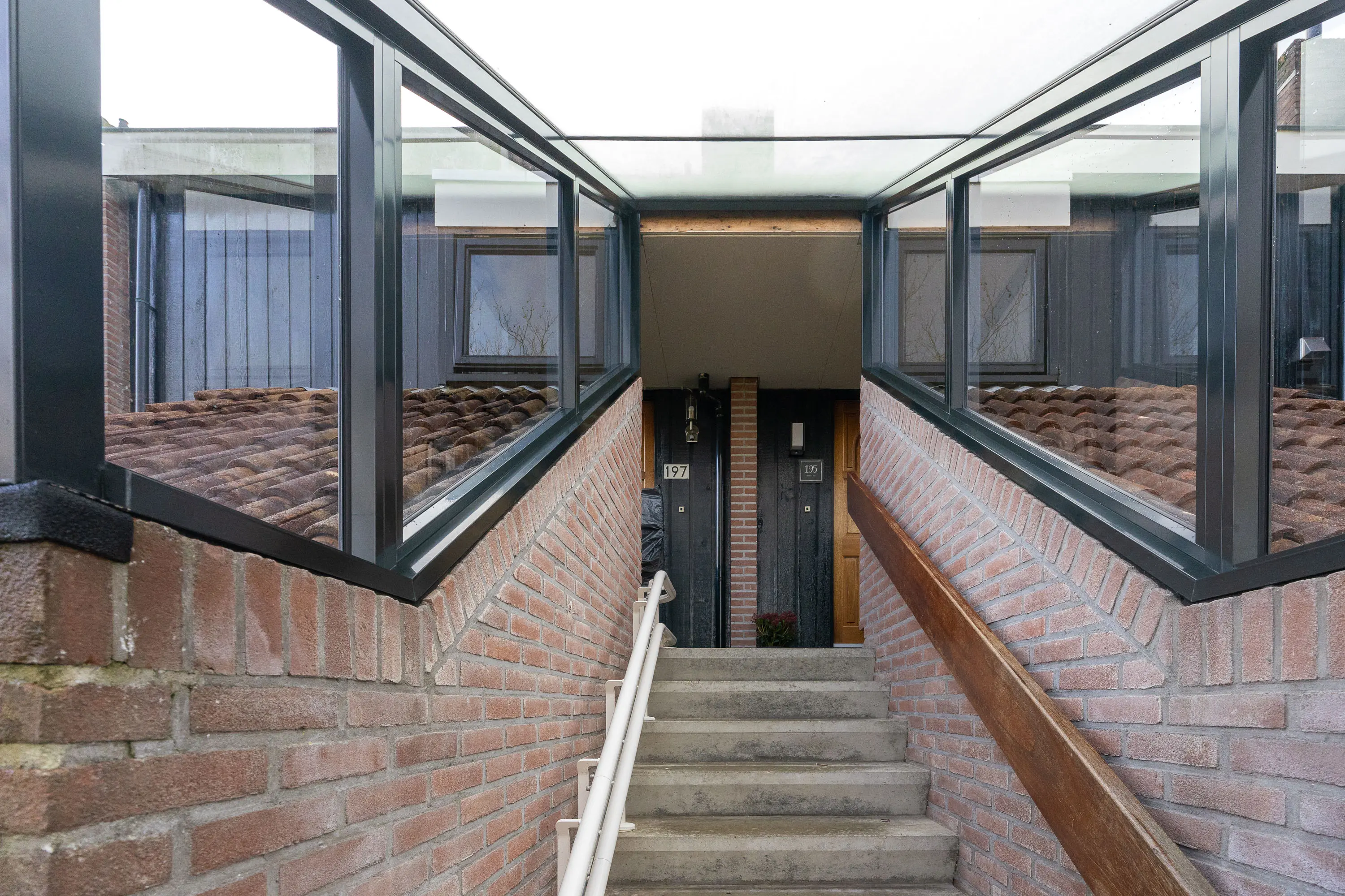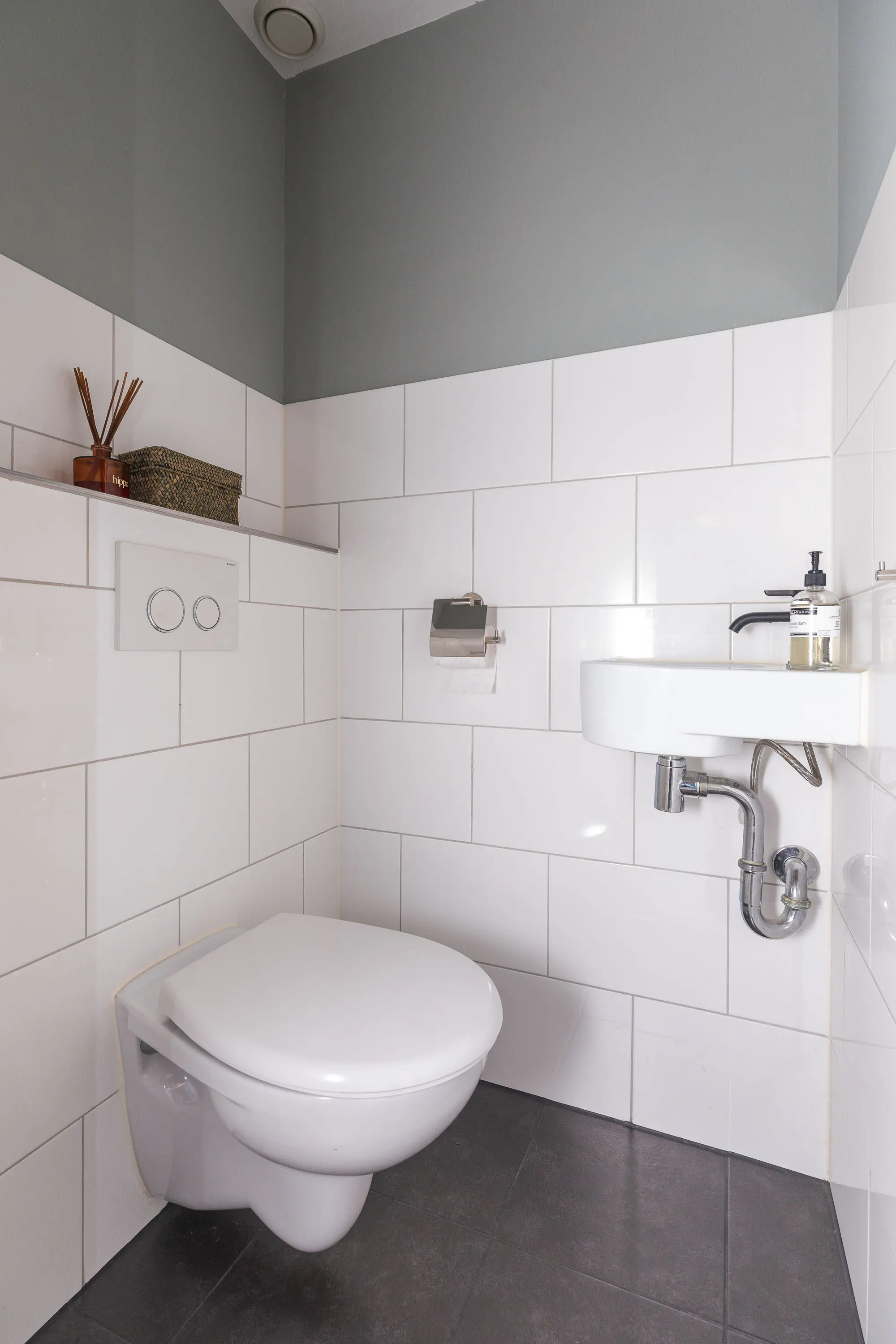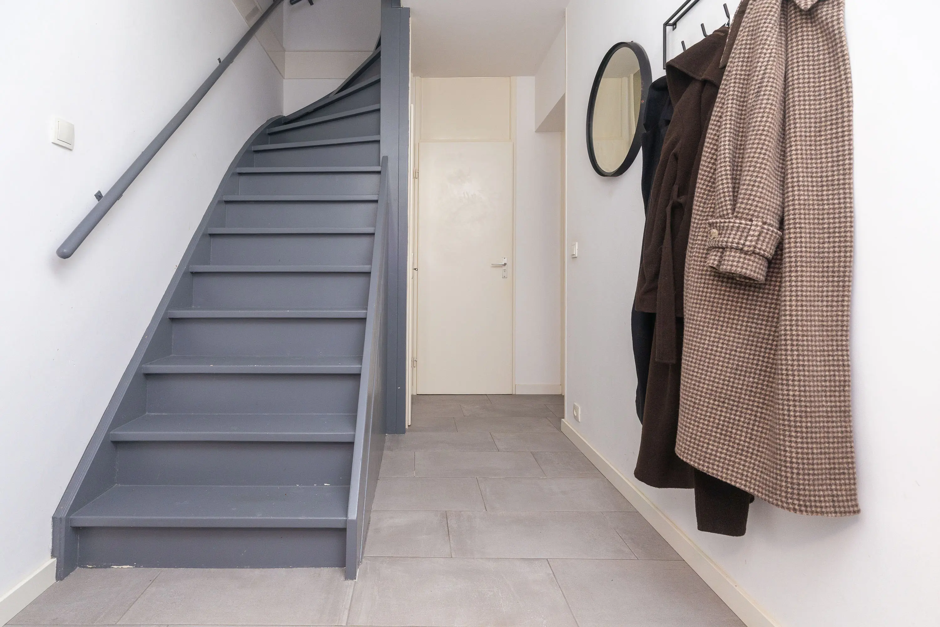 Via de gedeelde, overdekte entree bereik je de voordeur op de 1e verdieping. De hal is voorzien van een trapkast en een modern toilet. Vanuit hier stap je de woonkamer binnen of neem je de trap naar boven.