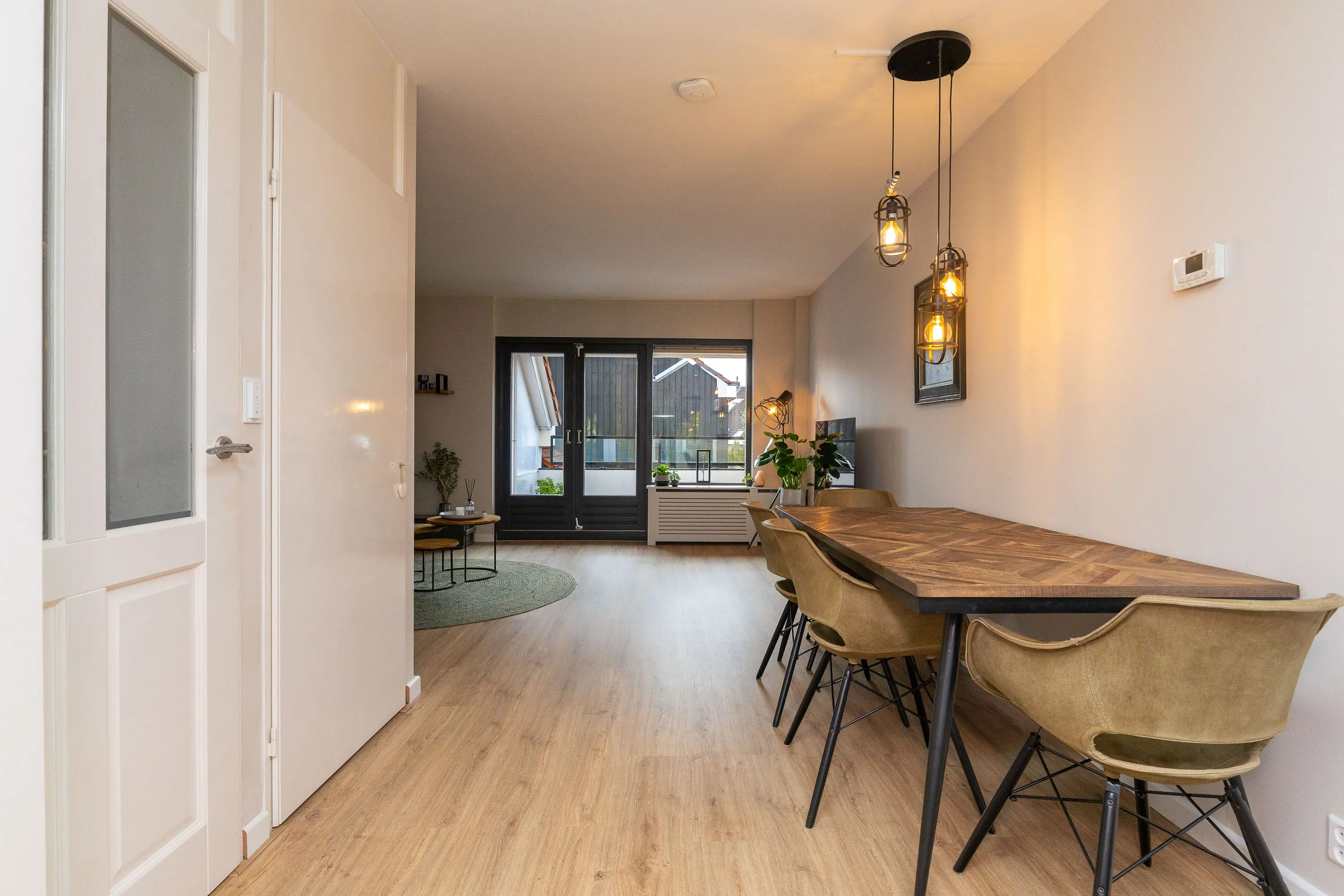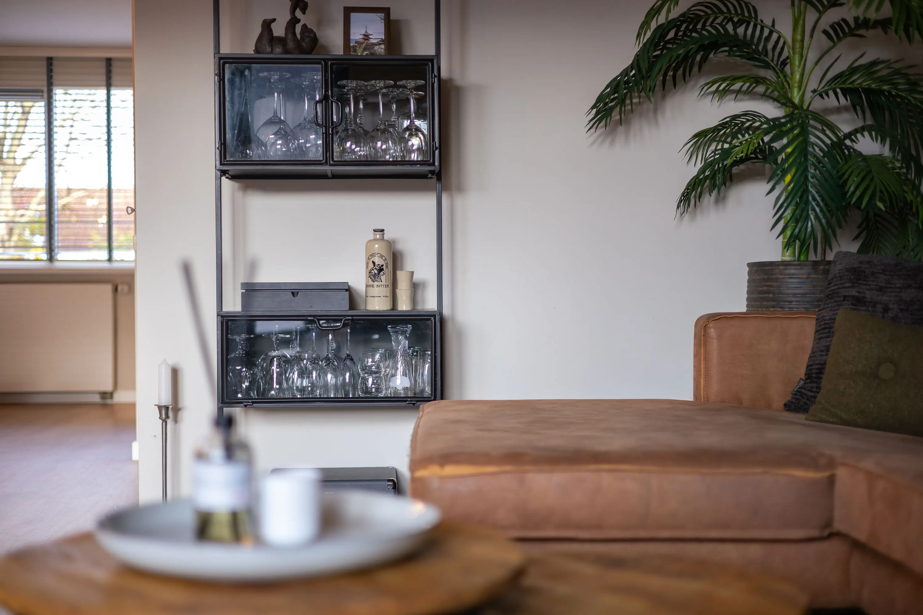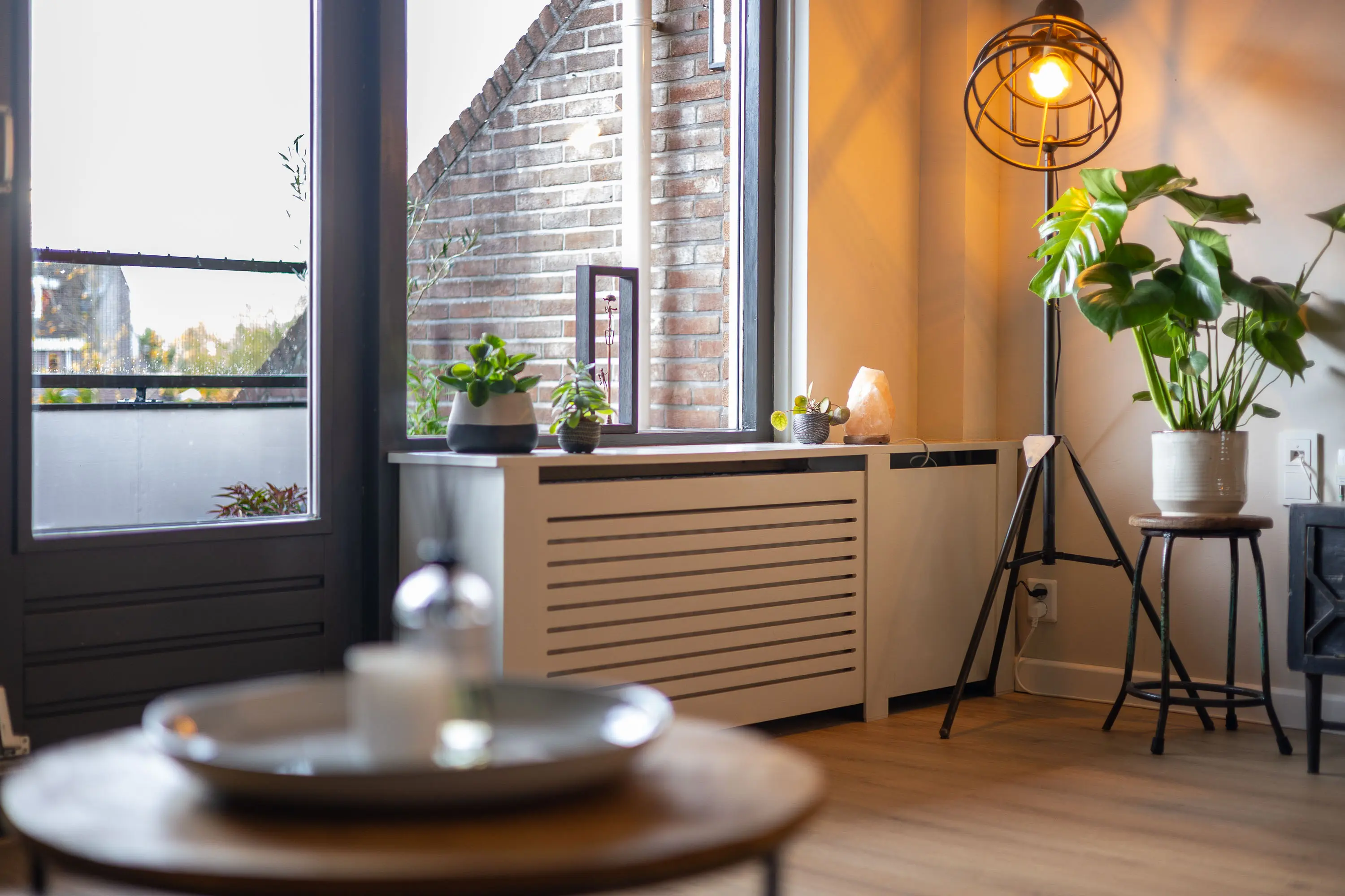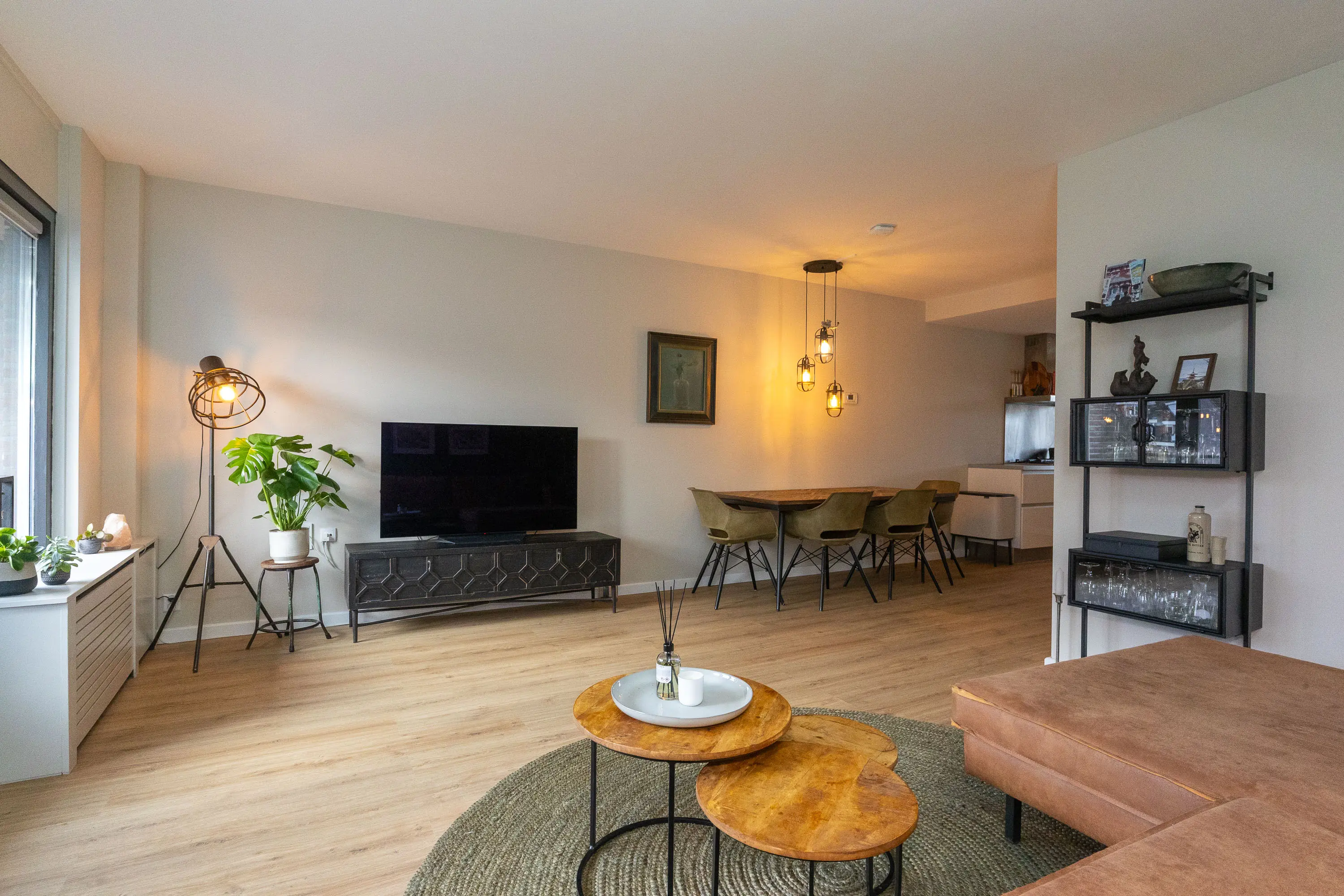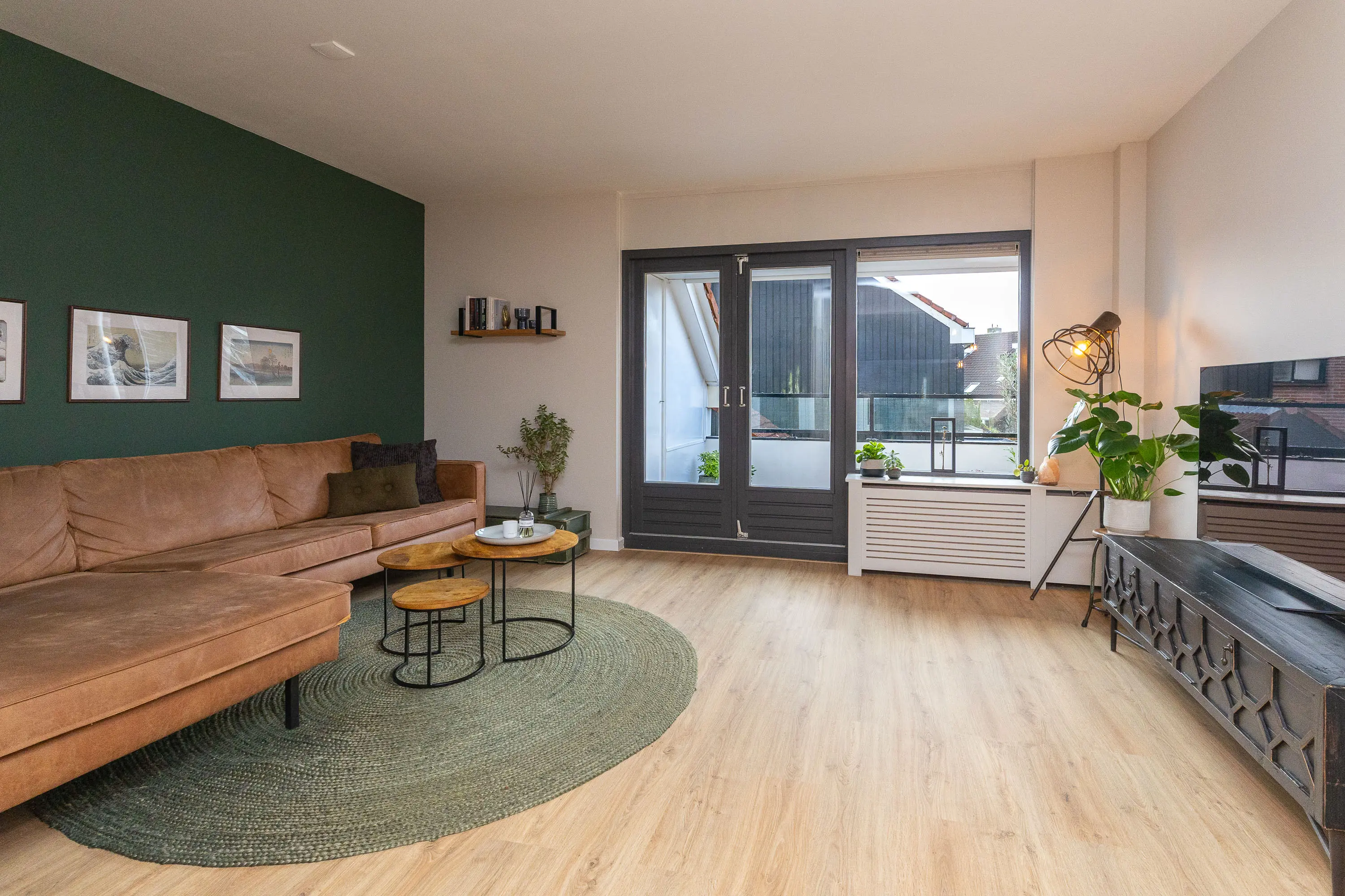 De woonkamer is licht, sfeervol en strak afgewerkt. Met warme dagen zet je de dubbele deuren open naar het balkon op het zuiden: jouw eigen zonnige plek voor een kop koffie, een boek of een gezellige borrel.
