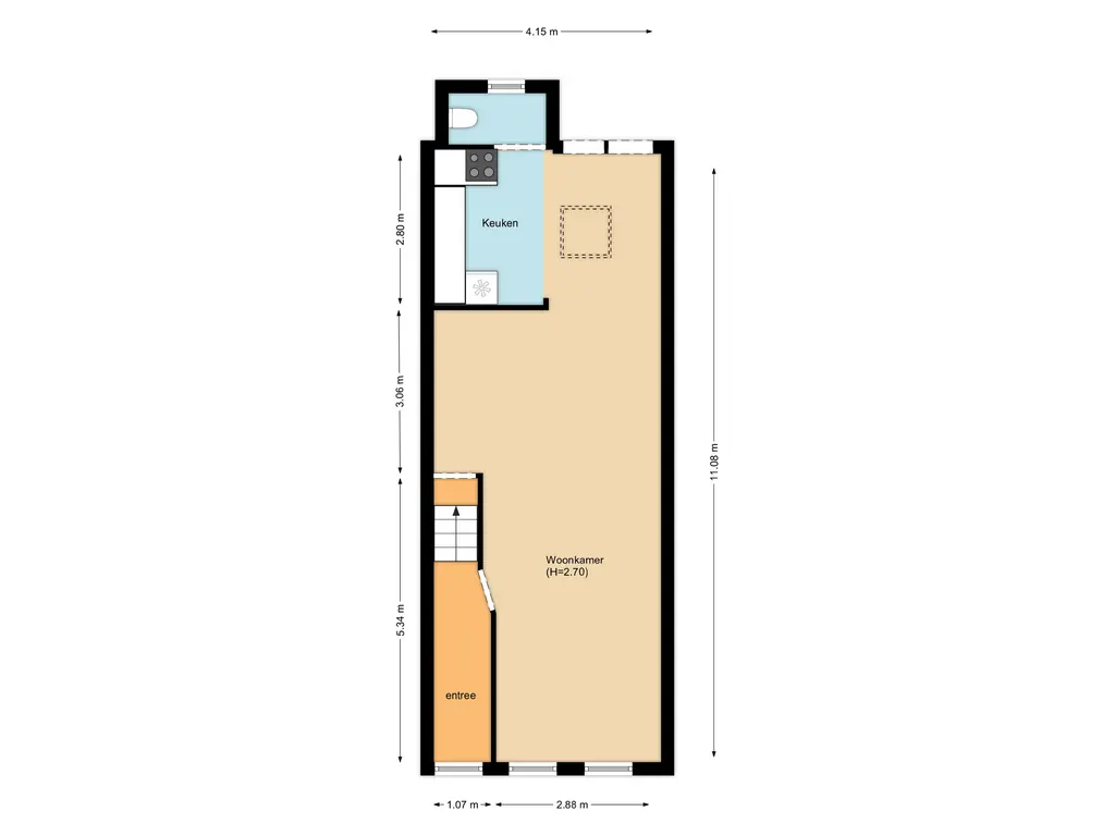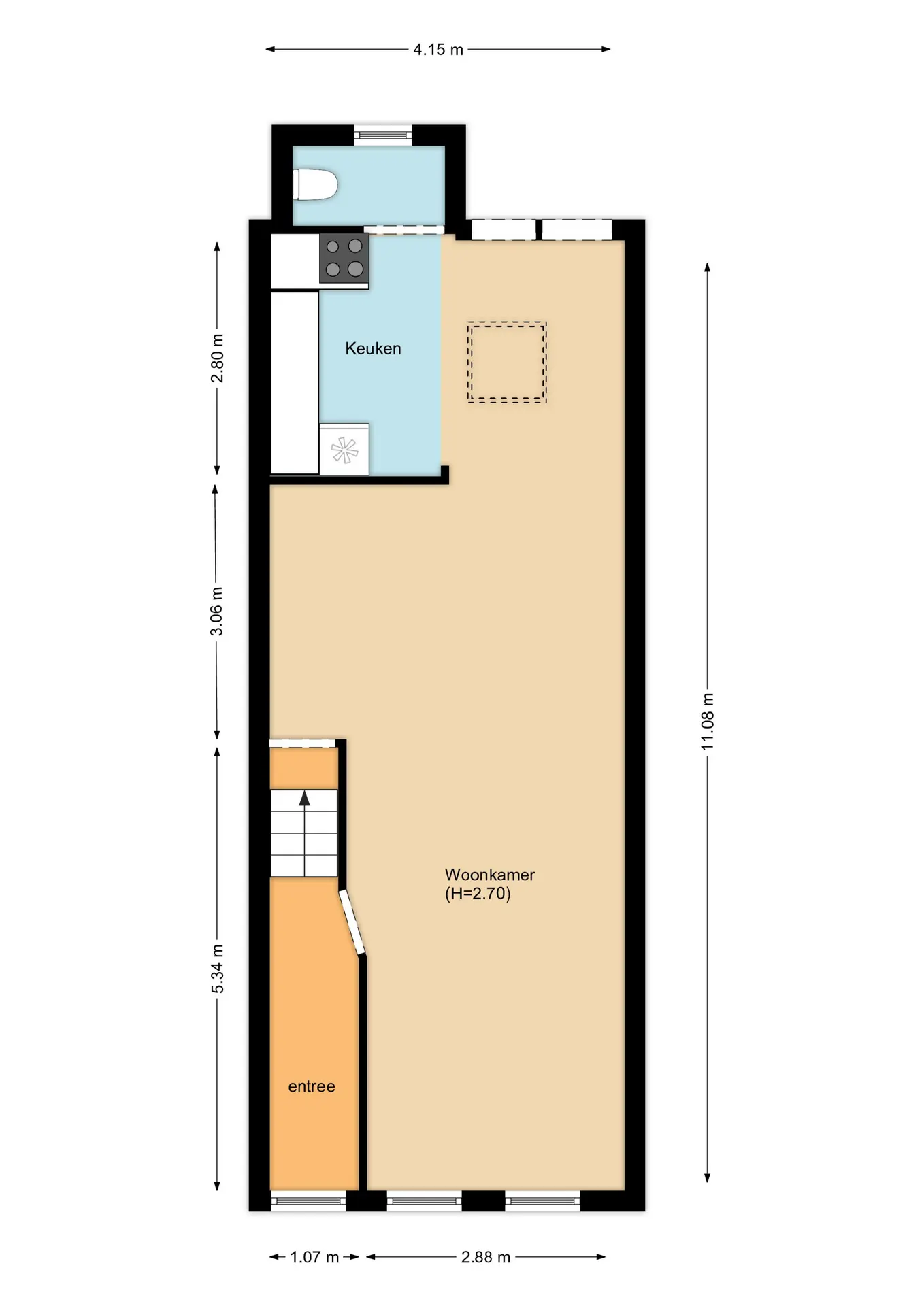 Bij binnenkomst via de voordeur treft u een royale hal aan, die leidt naar de lichte doorzonkamer. De woonkamer valt op door het karakteristieke hoge plafond en de ruime opzet. Vanuit de woonkamer loopt u door naar de open keuken, die voorzien is van een lichtkoepel en een toilet. Via openslaande deuren bereikt u de sfeervolle stadstuin, perfect voor zomerse avonden.