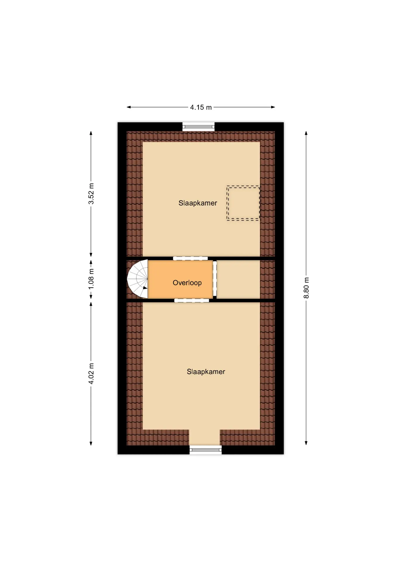 Op de eerste verdieping bevindt zich een ruime overloop die toegang biedt tot het zonnige dakterras. Hier vindt u ook de badkamer voorzien van bad, wastafel en een raam dat voor natuurlijk licht zorgt. De royale slaapkamer op deze verdieping beslaat de volledige breedte van het huis en is voorzien van een ruime inloopkast.